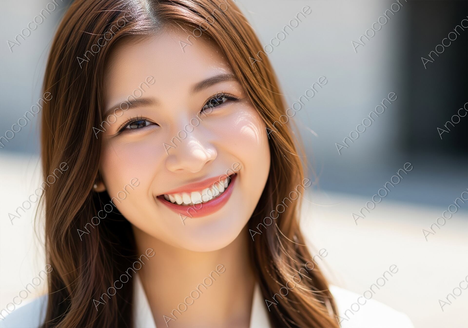画像素材:明るい屋外の光に包まれ、真っ直ぐにカメラを見つめながら晴れやかな笑顔を見せる女性のポートレートです。彼女の艶やかなロングヘアが美しく流れ、白いブラウスが清潔感と上品な印象を際立たせています。自然光をたっぷりと浴びた肌は透明感に溢れ、優しく細められた瞳と白く整った歯が覗く口元からは、心からの幸福感と充実したライフスタイルが伝わってきます。背景をシンプルにぼかすことで、彼女の親しみやすく魅力的な表情がいっそう際立ち、見る人に深い安心感と信頼感を与える構成です。光の加減が非常にソフトで全体的に明るいトーンでまとめられているため、静止画でありながらその場の穏やかな空気感まで伝わってくるようです。美容やヘルスケア、または親近感を大切にするサービスの顔として、ポジティブなイメージを伝えるビジュアルに最適です。