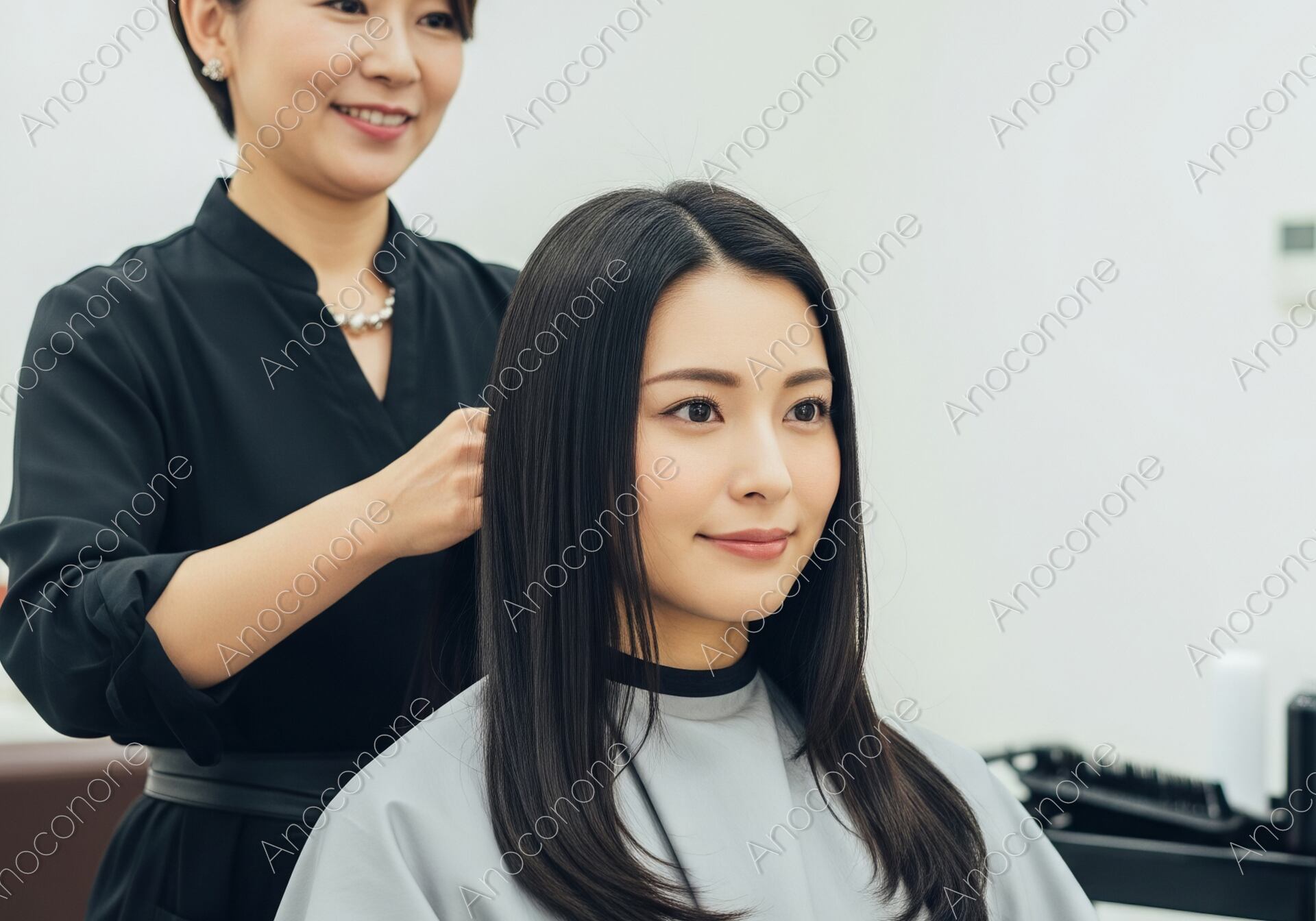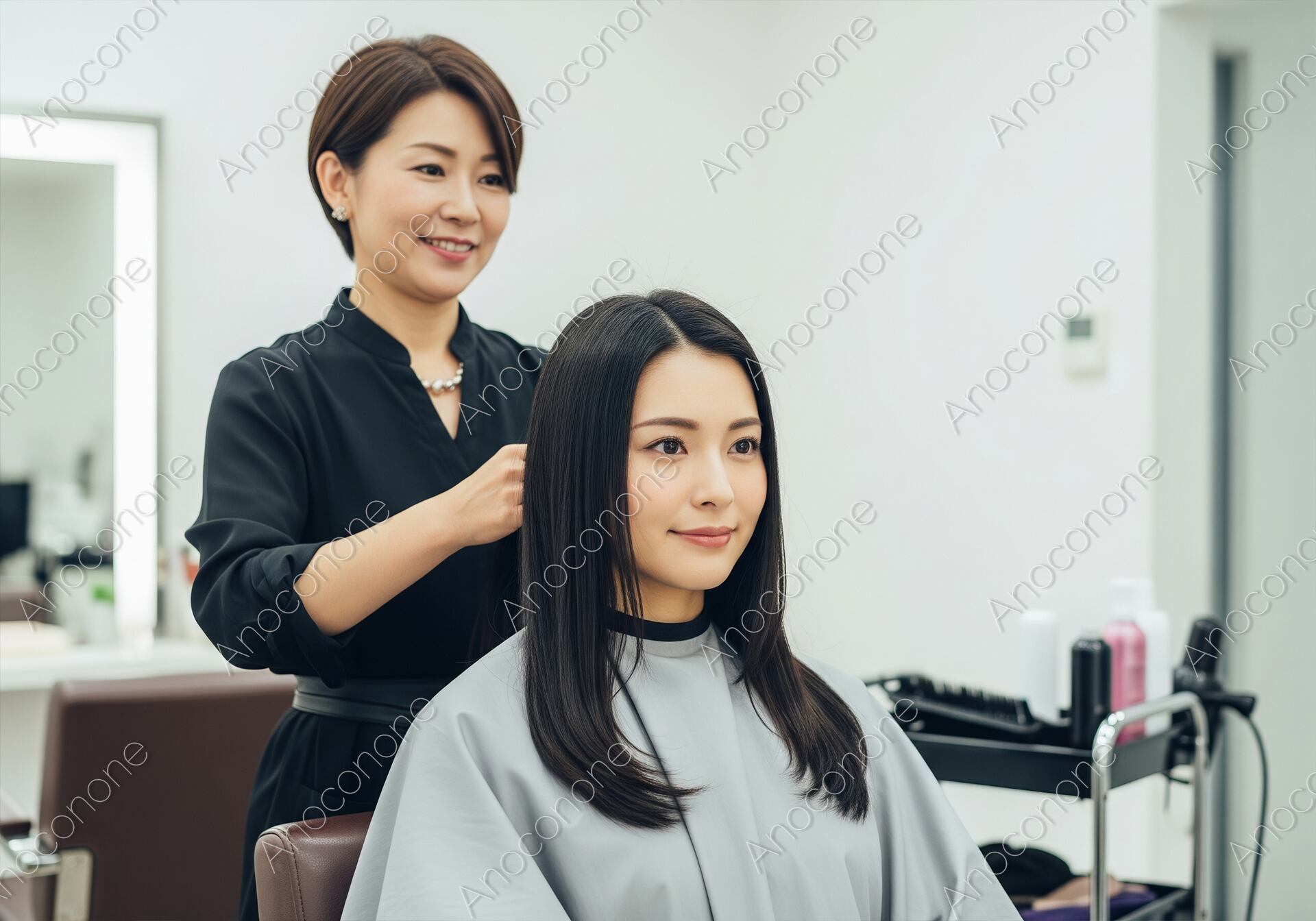 画像素材:洗練されたモダンな美容室の店内で、スタイリストからヘアケアやスタイリングを受けている女性の様子を捉えた一枚です。鏡の前に座り、自分の髪が美しく整えられていく過程を穏やかな表情で見つめる女性と、プロフェッショナルな手つきで施術を行うスタイリストの姿が、信頼感と安心感を演出しています。白を基調とした広々とした店内には、高品質なヘアケア製品が整然と並び、清潔で心地よい空間であることが伝わってきます。柔らかな室内照明が、女性の艶やかなストレートヘアの質感や、肌の透明感を美しく引き立てています。美容院のサービス紹介や、ヘアケア・トリートメントのプロモーション、また「日常の贅沢」や「自分へのご褒美」をテーマにしたライフスタイルメディアのイメージビジュアルに最適です。