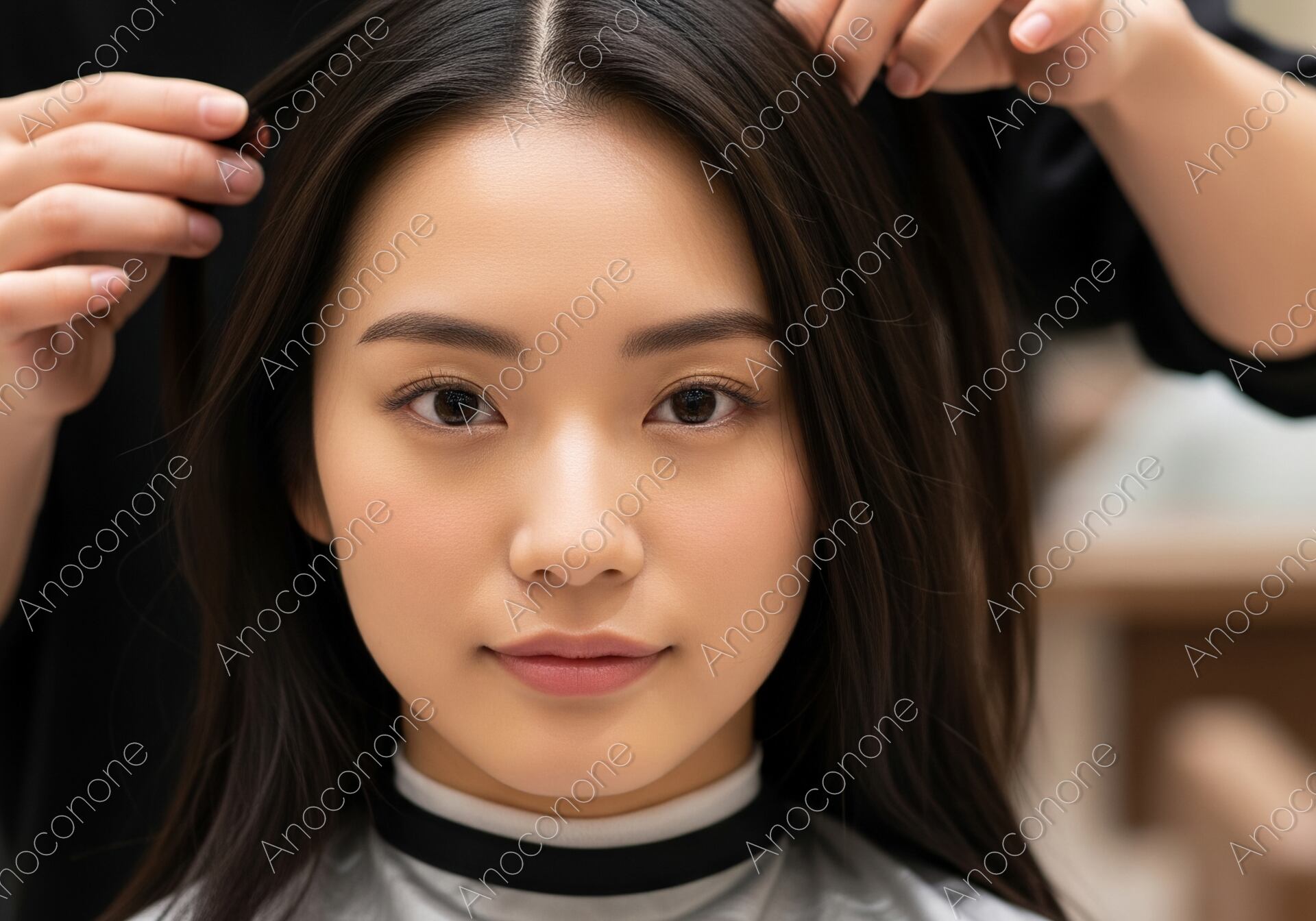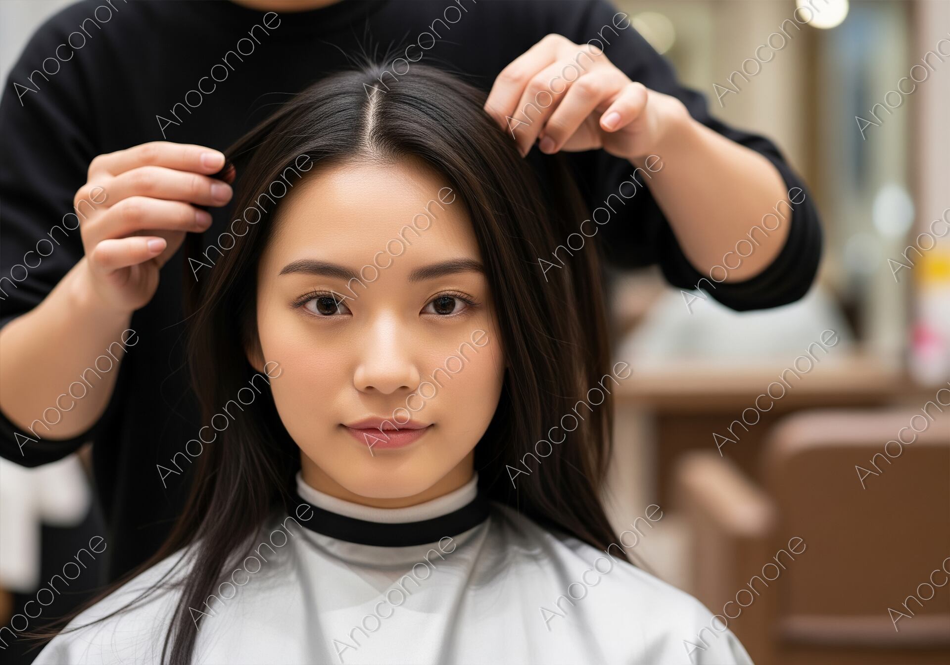 画像素材:洗練された美容室で、スタイリストから丁寧に髪の状態を確認されている女性を正面から捉えた一枚です。施術前のカウンセリングや、仕上げのスタイリングを行っている臨場感のあるシーンを表現しています。鏡越しに自分を見つめるような彼女の真っ直ぐな眼差しからは、プロの技術に対する信頼感と、美しく変わることへの期待が伝わってきます。背景にはサロン特有の温かみのある照明や什器が程よくぼかされており、清潔感とプロフェッショナルな雰囲気を際立たせています。柔らかな光が彼女の艶やかな黒髪と健康的な肌の質感を美しく映し出し、高品質なビジュアルに仕上がっています。美容院のウェブサイト、ヘアケア製品のプロモーション、または「自分を整える時間」をテーマにしたライフスタイルメディアのメインビジュアルに最適です。