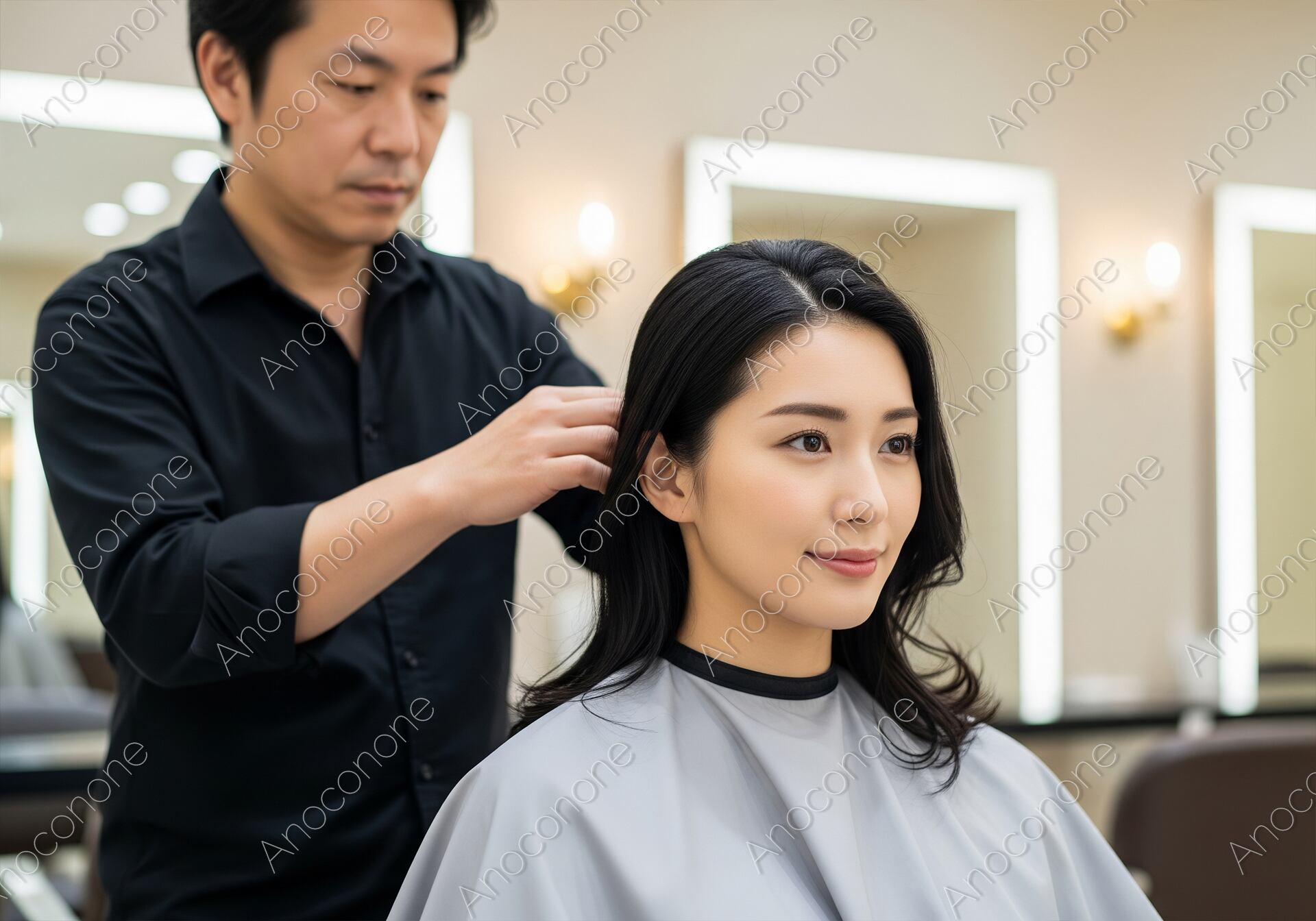 画像素材:落ち着いたベージュトーンのモダンな美容室で、プロの男性スタイリストによるヘアスタイリングを受けている女性を捉えた一枚です。鏡の前に座り、自分の髪が丁寧に整えられていく様子を静かに見守る女性の横顔には、日常を忘れてリラックスしているような穏やかな表情が浮かんでいます。背景には温かみのある間接照明が配された鏡が並び、プロフェッショナルかつ上質なサロンの空気感を演出しています。柔らかな光が、女性の艶やかな黒髪の質感や、透明感のある肌を美しく引き立てており、非常にリアリティのある高品質なビジュアルです。美容院のハイエンドなサービス紹介や、サロン専売品のプロモーション、また「大人の美容習慣」や「自分への投資」をテーマにしたライフスタイルメディアのイメージカットに最適です。