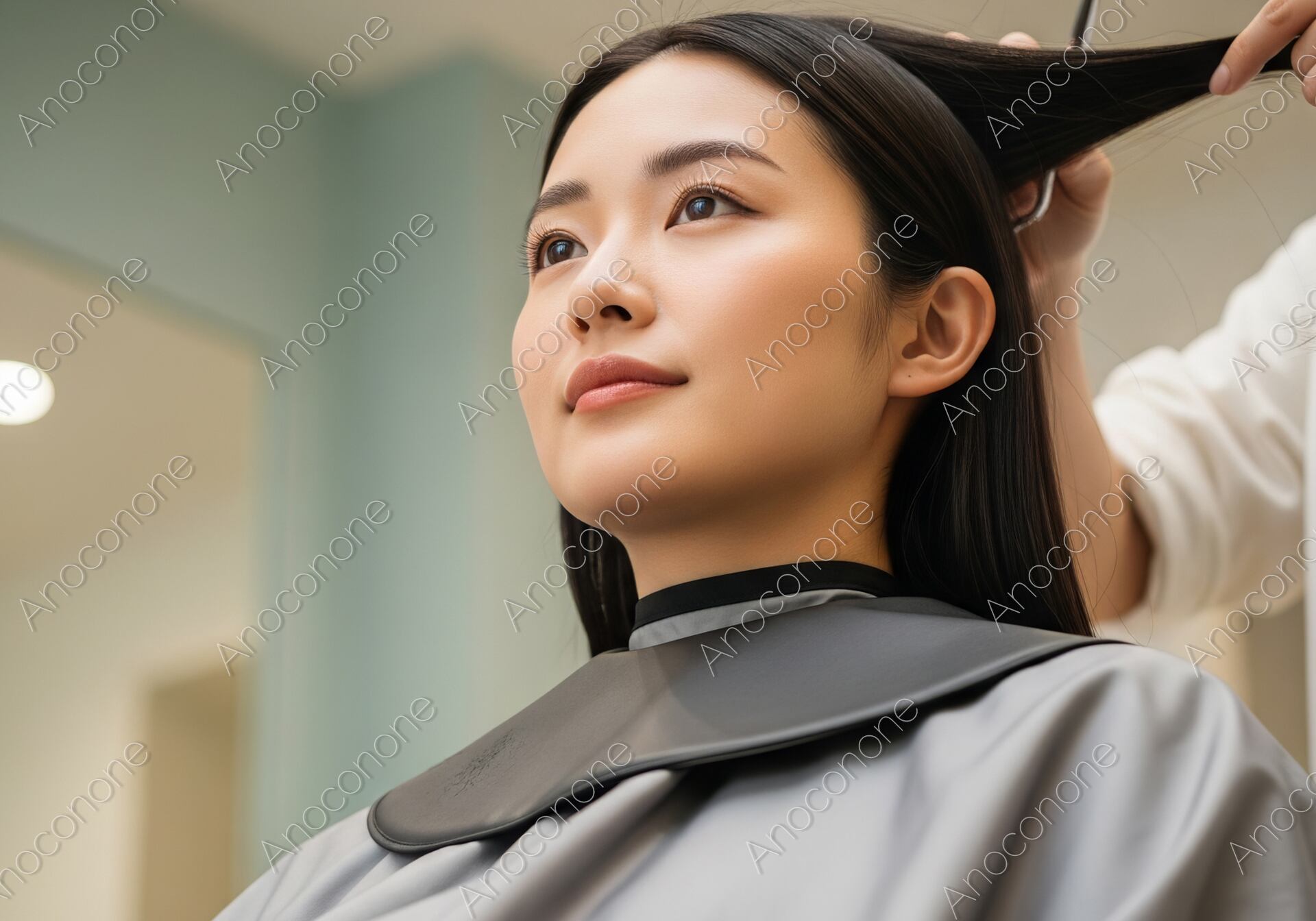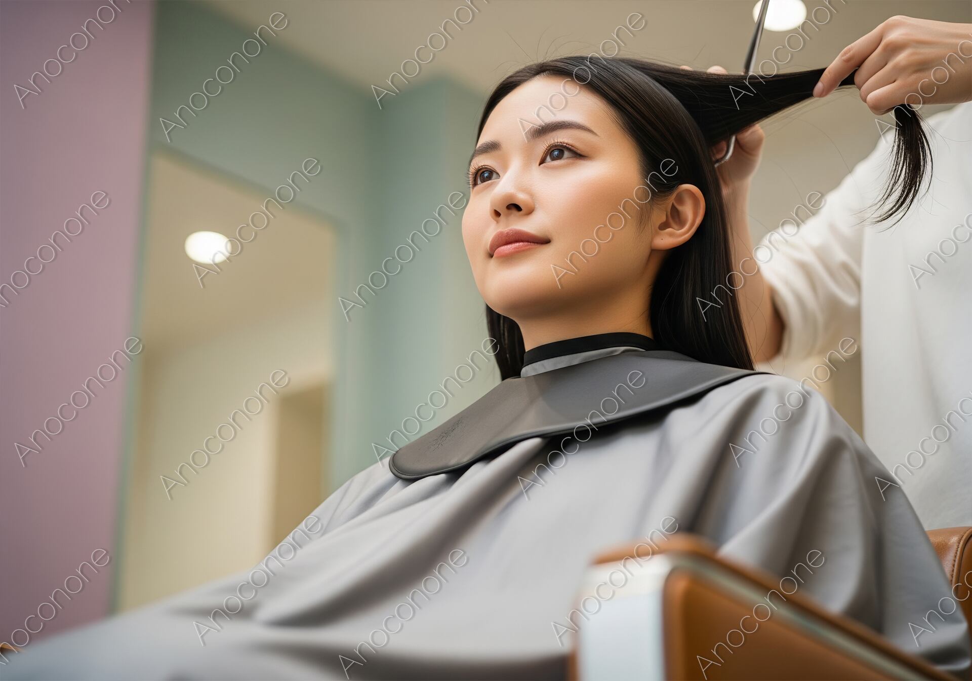 画像素材:パステルカラーの壁が印象的な明るくモダンな美容室で、プロのスタイリストによるヘアカットを受けている女性を斜め下からのアングルで捉えた一枚です。少し上を見つめる彼女の凛とした瞳と穏やかな表情からは、新しく生まれ変わる自分への期待感と、スタイリストへの確かな信頼が伝わってきます。丁寧に引き上げられた艶やかな黒髪にハサミが入れられる瞬間は、サロンならではのプロの技術と繊細なこだわりを象徴しています。背景には柔らかな色調の店内の様子が程よくぼかして描写されており、清潔感あふれる心地よいサロンの空気感を演出しています。自然光のような明るいライティングが彼女の美しい肌の質感や髪の流れを鮮明に引き立てており、非常にリアリティのある高品質なビジュアルです。美容院の集客用メインビジュアルや、ヘアスタイルチェンジをテーマにした特集記事、また「自分らしさの追求」を提案するライフスタイルメディアのイメージカットに最適です。