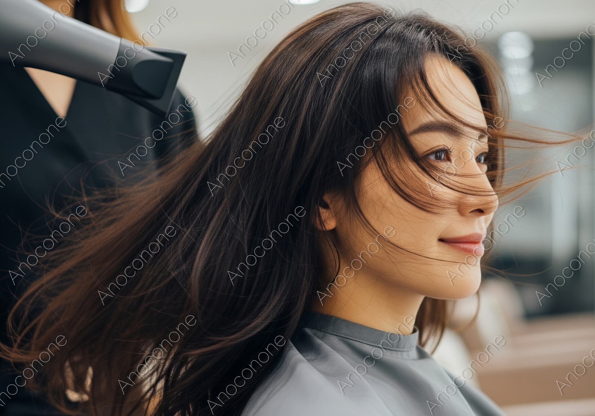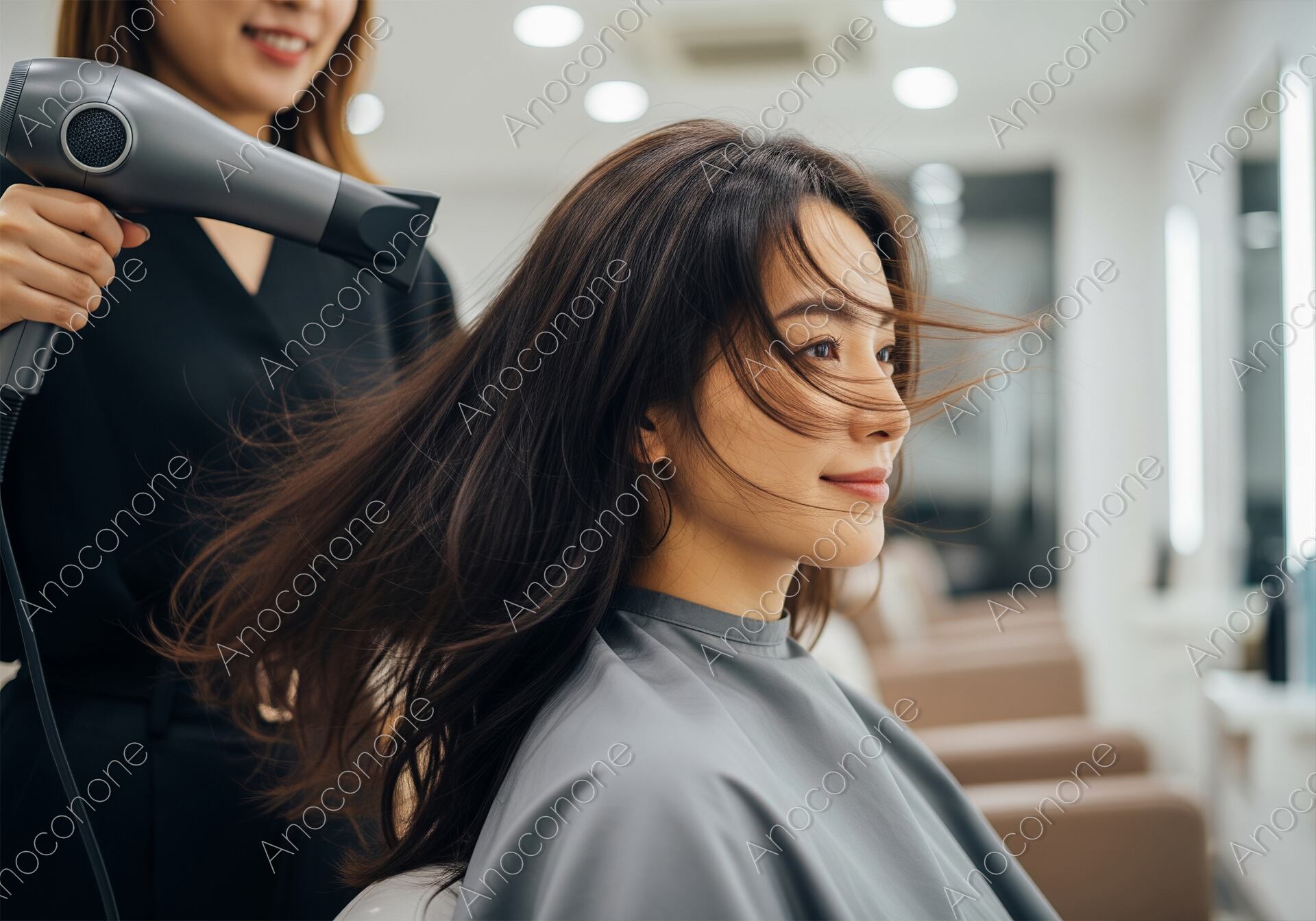 画像素材:活気ある美容室の店内で、プロのスタイリストによるヘアドライと仕上げのスタイリングを受けている女性を捉えた一枚です。ドライヤーの風に髪が美しくなびく中、鏡の向こうの完成した自分を心待ちにするような、穏やかで自信に満ちた表情が印象的です。背景には等間隔に並んだセット面や柔らかな照明が広がり、サロン特有のプロフェッショナルかつ開放的な空気感を演出しています。躍動感のある髪の流れと、それを優しく見守るようなライティングが、髪の健康的な輝きと肌の透明感をいっそう引き立てています。美容院のスタイリング技術の紹介や、最新のヘアケア家電のプロモーション、また「美しさを引き出すプロの技」をテーマにした記事のイメージカットに最適です。