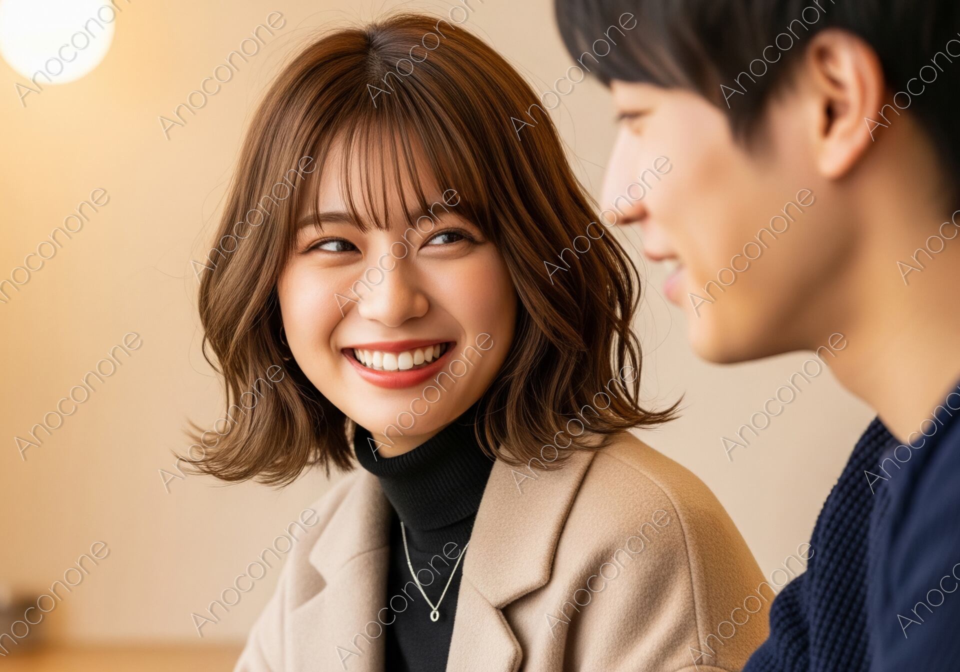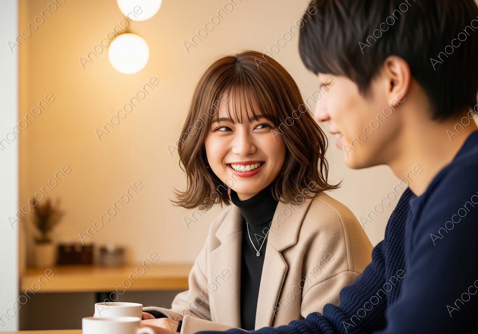 画像素材:暖かな照明が灯る落ち着いたカフェで、冬の装いに身を包んだ若い男女が語らう幸せなひとときを捉えた一枚です。ベージュのコートに黒のタートルネックを合わせた女性が、隣に座る男性へ向けて見せる弾けるような笑顔は、二人の親密さと心の距離の近さを物語っています。女性の艶やかなブラウンのウェーブヘアと、丁寧に仕上げられたメイクが、清楚で上品な大人の可愛らしさを演出しています。背景の温もりあるライトや、手元に置かれたシンプルな白いコーヒーカップが、冬の休日らしい穏やかで上質な空気感を際立たせています。全体的に暖色系のトーンでまとめられており、見る人に安心感と幸福感を与える構成です。マッチングアプリや婚活サービスの冬のキャンペーンビジュアル、カフェのプロモーション、または「冬のデートプラン」をテーマにしたコラムのメインビジュアルに最適です。