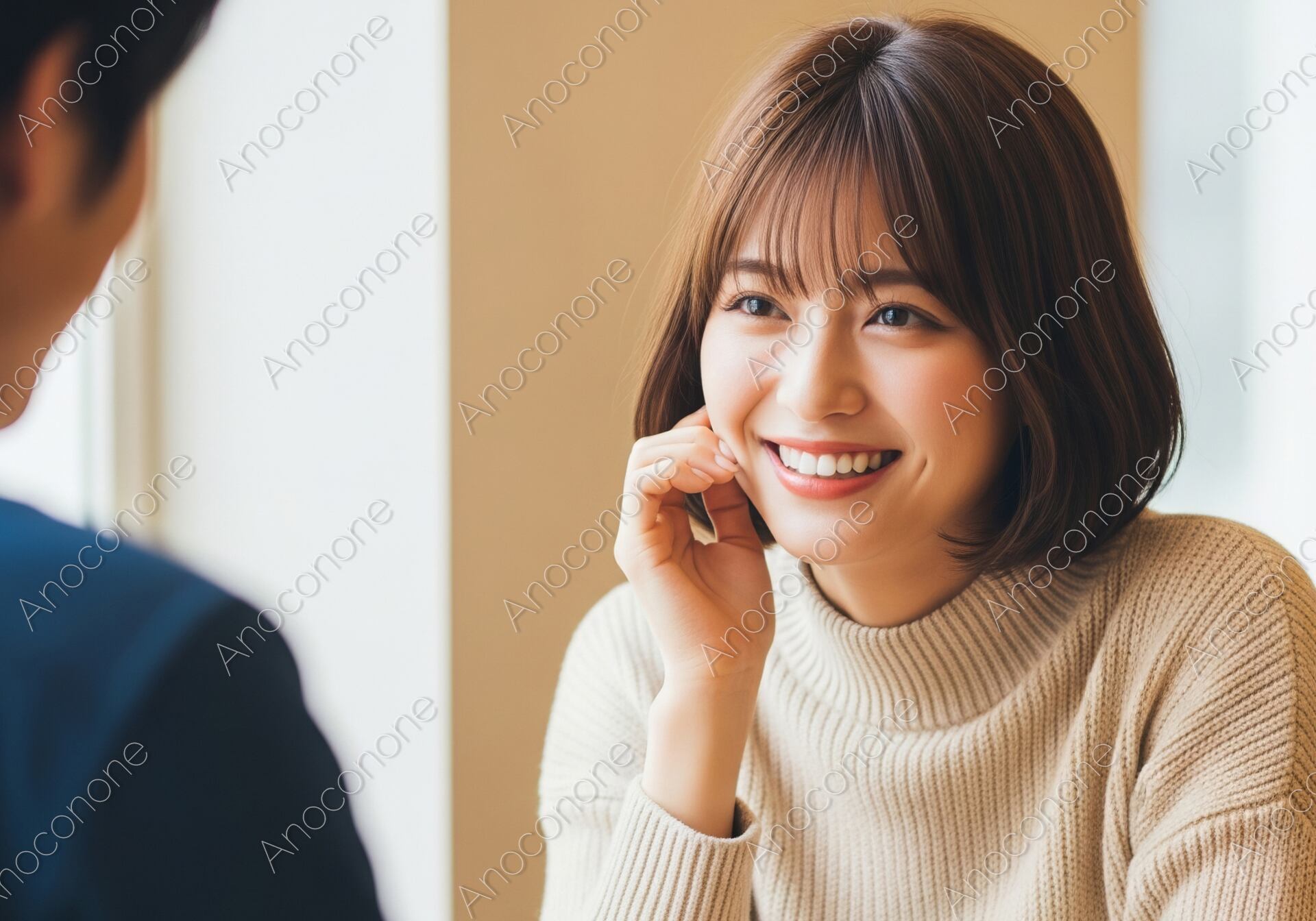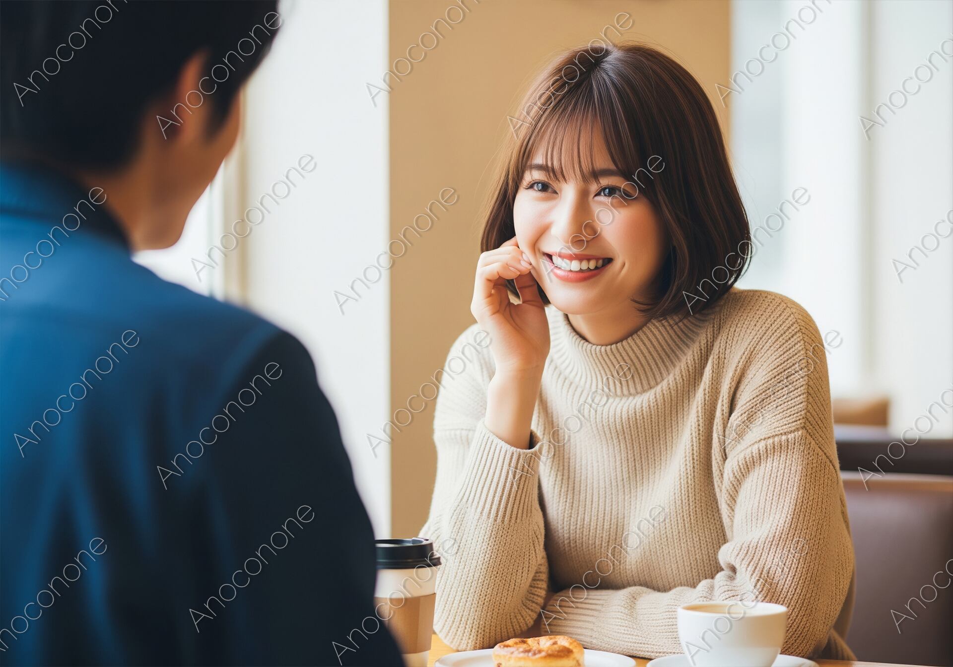 画像素材:落ち着いたトーンのカフェで、テーブル越しにパートナーと向き合い、幸せそうな微笑みを浮かべる女性を捉えた一枚です。清潔感のあるベージュのハイネックニットを身に纏い、頬に手を添えて相手の話に耳を傾ける姿からは、二人の親密な関係性と心安らぐひとときが伝わってきます。丁寧に整えられたブラウンのボブヘアと、優しく輝く瞳が彼女の清楚な魅力を引き立て、見る人に温かな印象を与えます。背景は柔らかな光に包まれ心地よくぼかされており、主役である彼女の表情をいっそう情緒的に際立たせています。全体的にナチュラルで透明感のある色調で構成されており、大人の落ち着いたデートシーンをリアルに表現しています。マッチングアプリや婚活サービスの広告、カフェのプロモーション、または「大切な人と過ごす冬の休日」をテーマにしたライフスタイルメディアのイメージビジュアルに最適です。