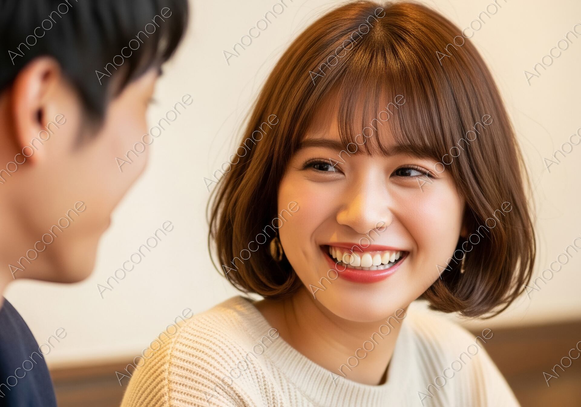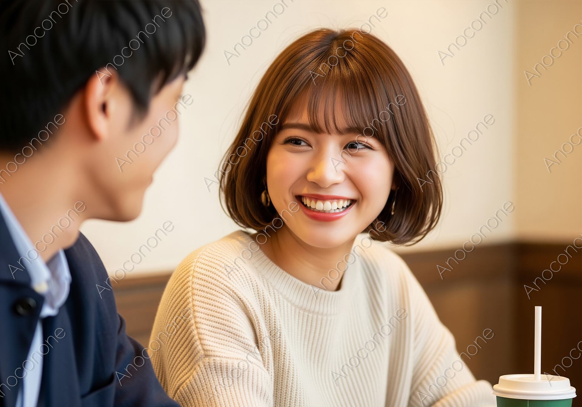 画像素材:温かみのある照明に包まれたカフェで、パートナーとの会話を心から楽しんでいる女性を捉えた一枚です。丸みのあるシルエットが可愛らしいブラウンのショートボブヘアと、清潔感のある白いリブニットが、彼女の親しみやすく柔らかな魅力を引き立てています。弾けるような笑顔と生き生きとした瞳からは、二人の間に流れる幸福な空気感と、充実した休日のひとときが伝わってきます。背景は落ち着いたトーンで柔らかくぼかされており、主役である彼女の明るい表情をいっそう鮮明に際立たせています。全体的にナチュラルで透明感のある色調で構成されており、見る人に安心感とポジティブな印象を与える仕上がりです。マッチングアプリや婚活サービスの広告、カフェのプロモーション、または「大切な人と過ごす豊かな時間」をテーマにしたライフスタイルメディアのイメージビジュアルに最適です。