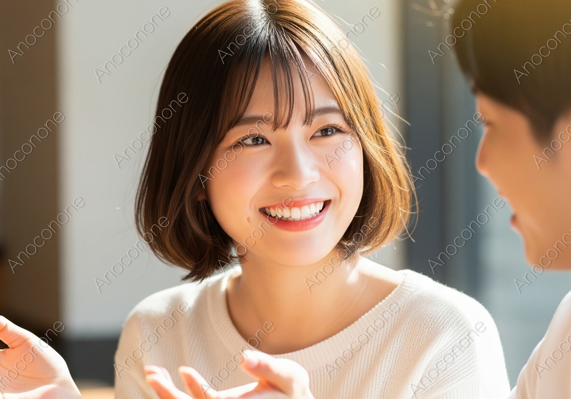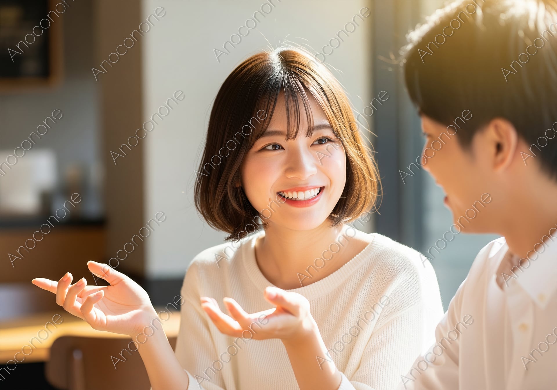 画像素材:明るい日差しが差し込むカフェで、パートナーとの会話に夢中になっている女性を捉えたポートレートです。艶やかなブラウンのショートボブヘアが彼女の快活な印象を際立たせ、清潔感のある白いニットが柔らかな雰囲気を演出しています。楽しそうに身振り手振りを交えながら話す姿と、心からの笑顔からは、二人の間に流れる親密で幸福な空気感が伝わってきます。窓からの自然光が彼女の表情を明るく照らし、生き生きとした瞳や健康的な肌の質感を美しく引き立てています。背景にはモダンなカフェのインテリアが程よくぼかされており、日常の中にある特別なひとときを情緒的に描き出しています。マッチングアプリのメインビジュアル、ライフスタイル提案型の広告、または「充実した休日の過ごし方」をテーマにしたメディアのイメージカットに最適です。
