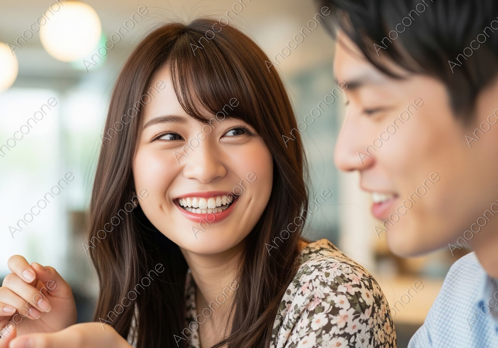 画像素材:明るく開放的なカフェで、隣に座るパートナーへ向けて弾けるような笑顔を見せる女性を捉えた一枚です。緩やかに波打つブラウンのロングヘアと、清楚な花柄のトップスが彼女のフェミニンで親しみやすい魅力を引き立てています。身振り手振りを交えながら熱心に語らう姿からは、二人の仲睦まじい様子と、心からリラックスした幸福な時間が伝わってきます。背景には温かみのあるペンダントライトやカフェのモダンなインテリアが程よくぼかされており、主役である二人の生き生きとした表情をいっそう情緒的に際立たせています。全体的に明るく透明感のある色調で構成されており、見る人にポジティブで爽やかな印象を与える高品質なビジュアルです。マッチングアプリや婚活サービスのメインビジュアル、カフェや飲食店のプロモーション、または「大切な人と過ごす充実した休日」をテーマにしたライフスタイルメディアのイメージビジュアルに最適です。