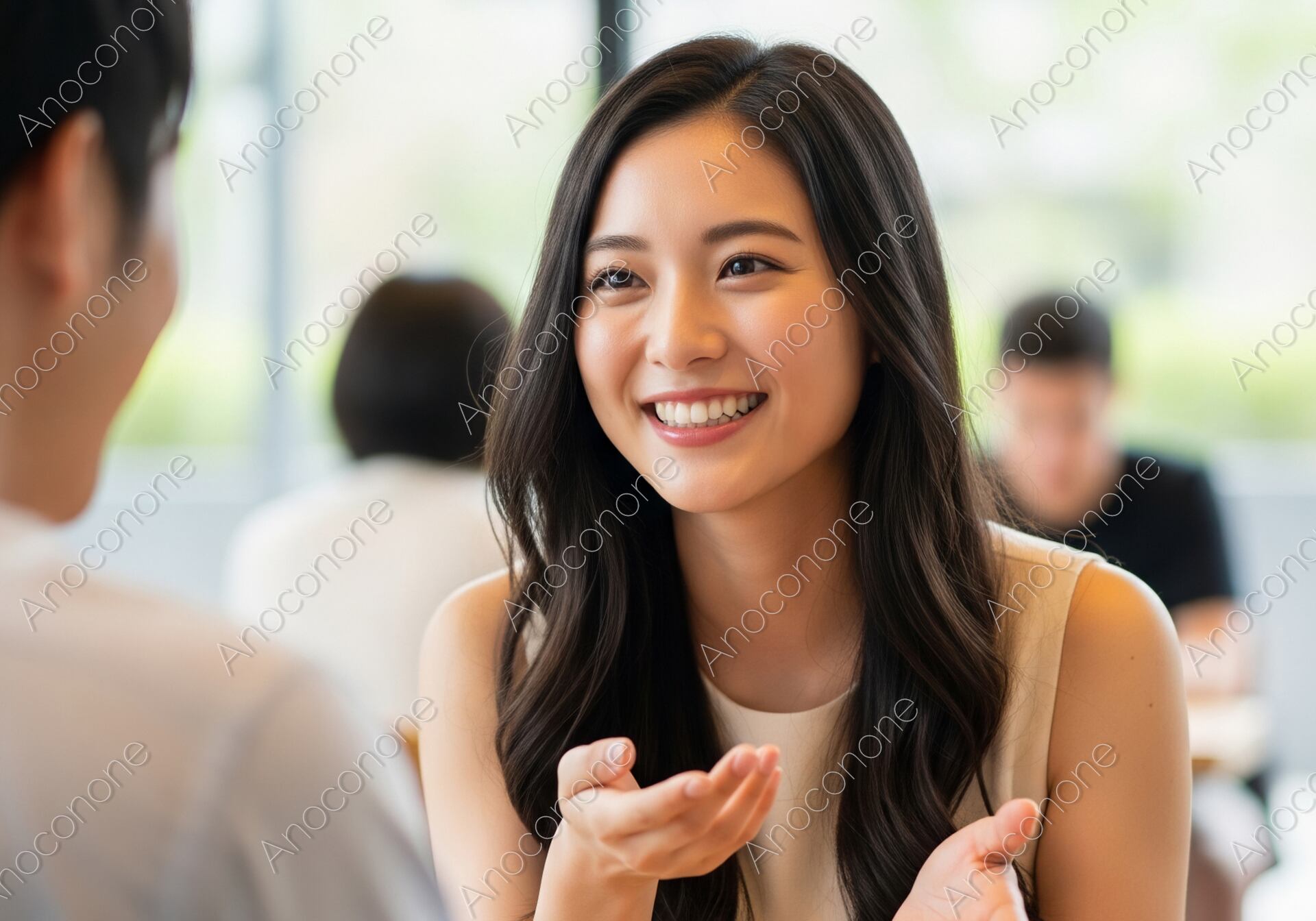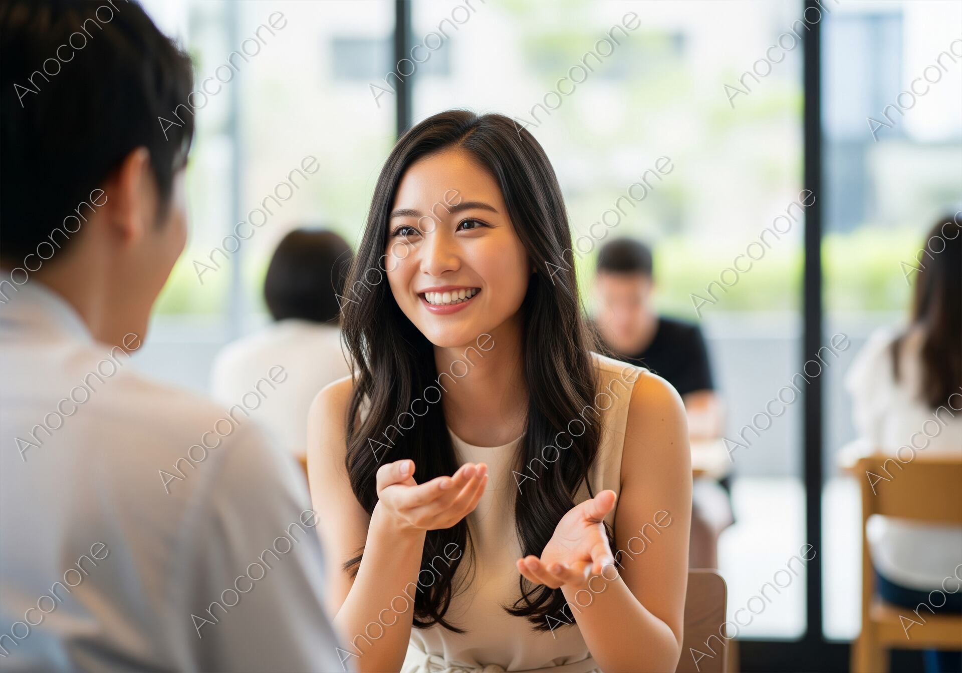 画像素材:自然光がたっぷりと差し込む開放的なカフェで、テーブル越しにパートナーと向き合い、弾けるような笑顔を見せる女性を捉えた一枚です。手振りも交えながら熱心に語らう姿からは、二人の仲睦まじい様子と、心からリラックスした幸福な時間が伝わってきます。緩やかに波打つ艶やかな黒髪のロングヘアと、清楚なベージュのノースリーブトップスが、彼女の健康的で洗練された魅力を引き立てています。背景には明るいテラスや他の来店客の様子が程よくぼかして描写されており、日常の中にある活気あるデートシーンをリアルに演出しています。全体的に透明感あふれる明るいトーンで構成されており、見る人にポジティブで爽やかな印象を与える高品質なビジュアルです。マッチングアプリや婚活サービスのメインビジュアル、カフェや飲食店のプロモーション、または「充実した休日の過ごし方」をテーマにしたライフスタイルメディアのイメージビジュアルに最適です。