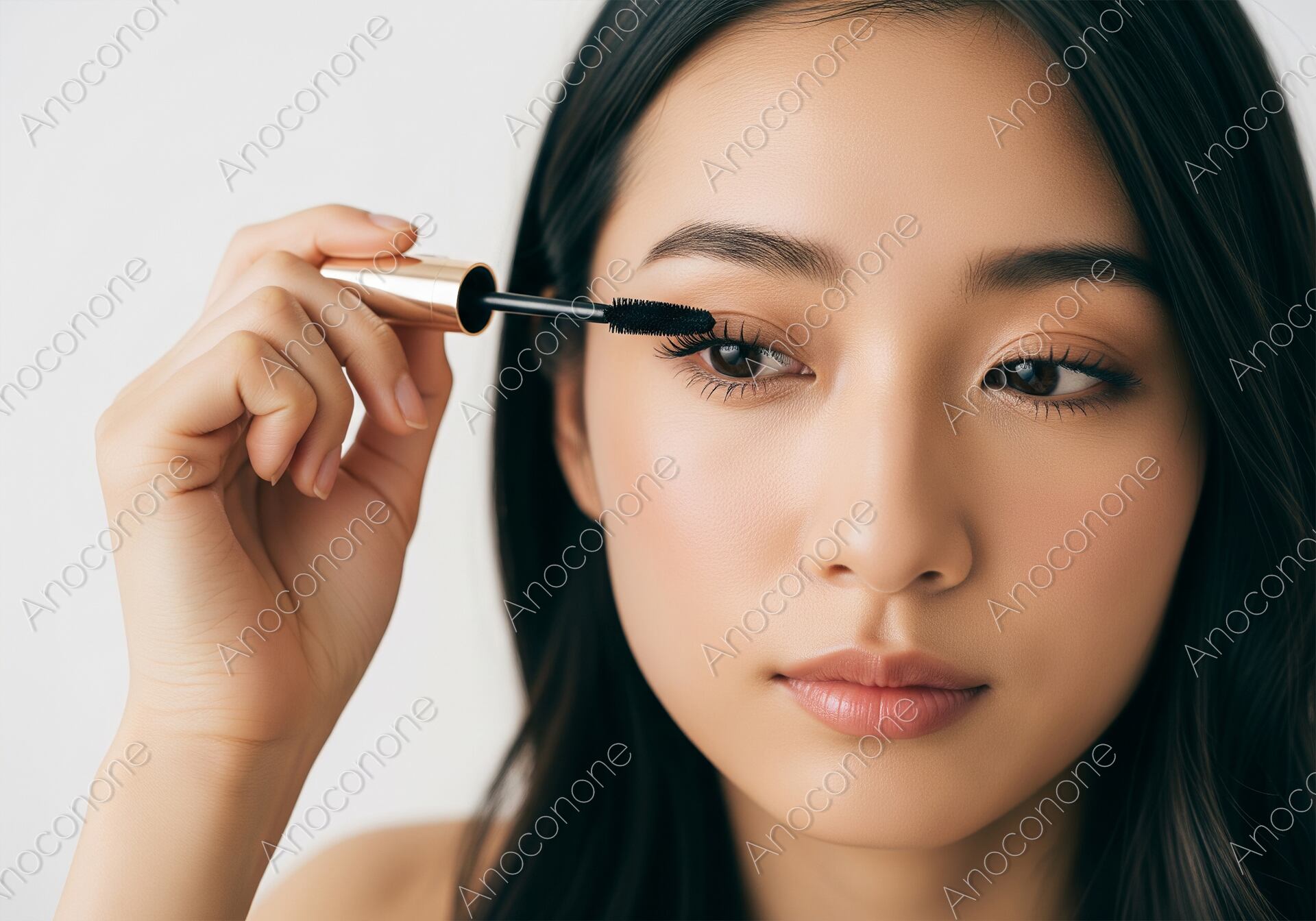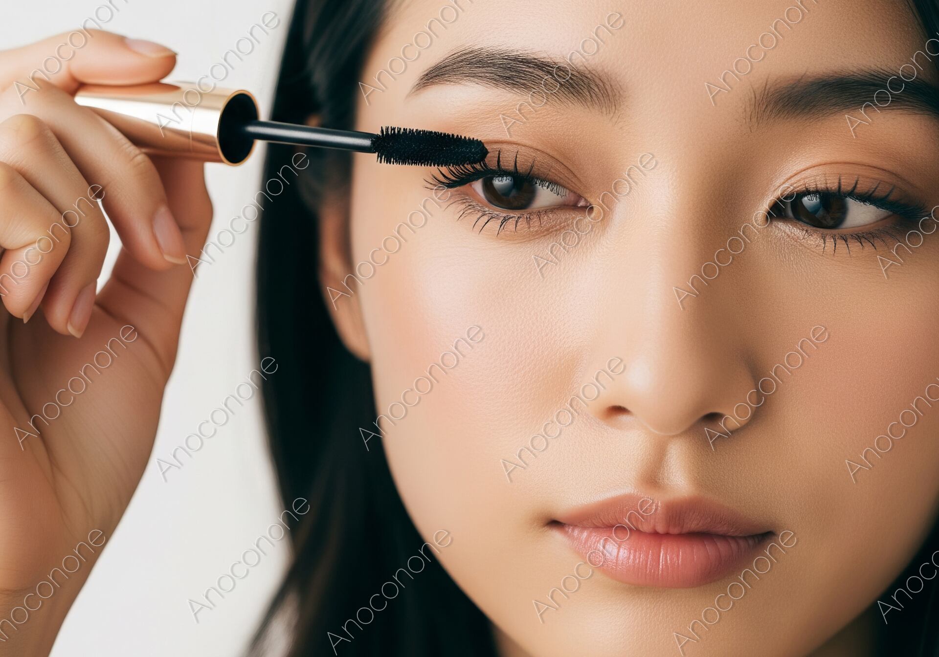 画像素材:真剣な表情で鏡に向き合い、丁寧にマスカラを塗る女性の目元を捉えたクローズアップショットです。美しく整えられた眉と、マスカラによって一本一本強調されていくまつ毛が、彼女の意志の強さと美しさを引き立てています。黒髪のロングヘアと健康的な肌の質感が、ナチュラルでありながら洗練された大人のメイクシーンをリアルに演出しています。白を基調としたシンプルな背景が、手元の動作と表情の繊細さをいっそう鮮明に浮き上がらせており、非常に高品質なビジュアルです。化粧品ブランドのプロモーション、アイメイクのハウツーコンテンツ、または「自分を磨く時間」をテーマにした美容メディアのイメージカットに最適です。