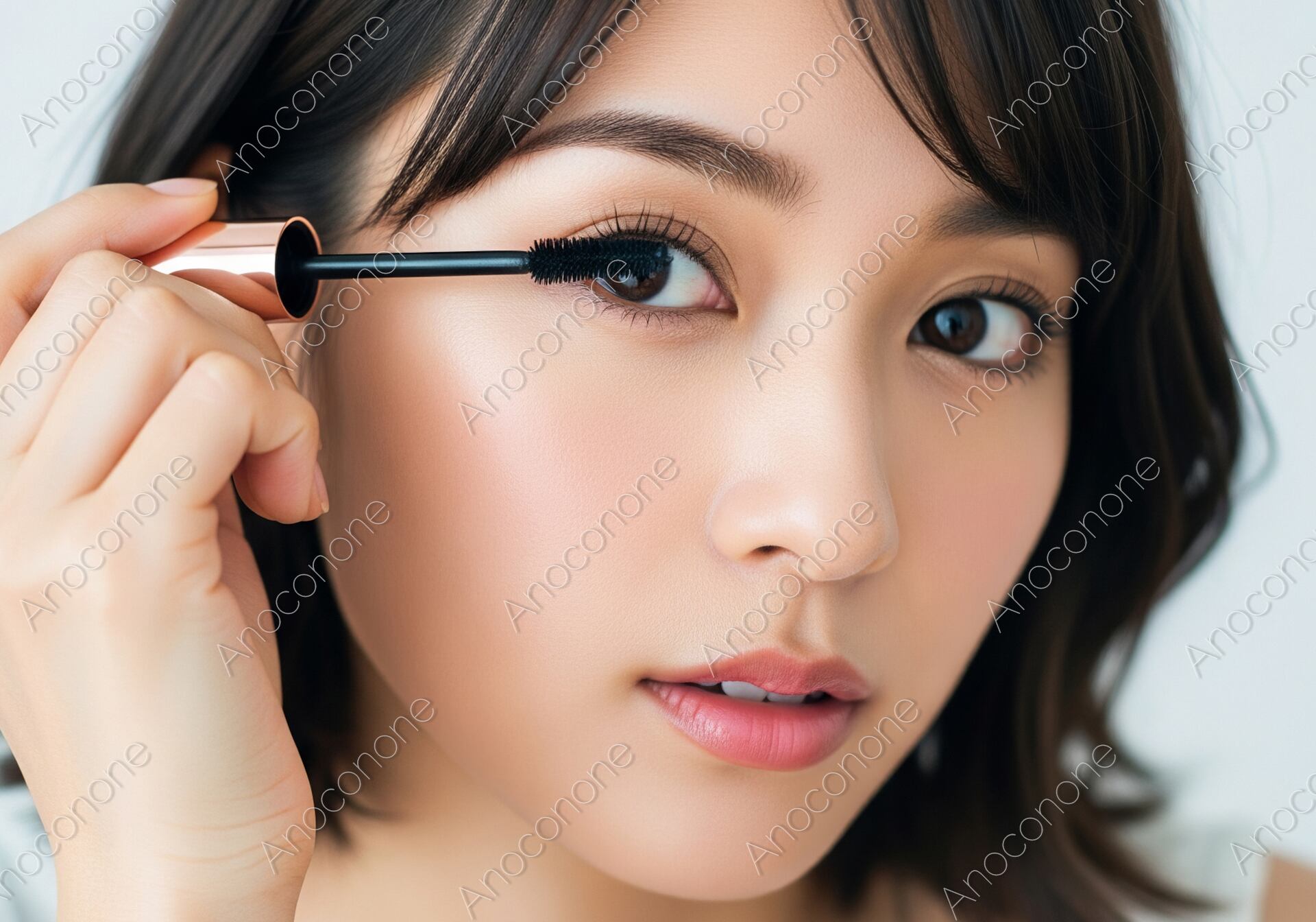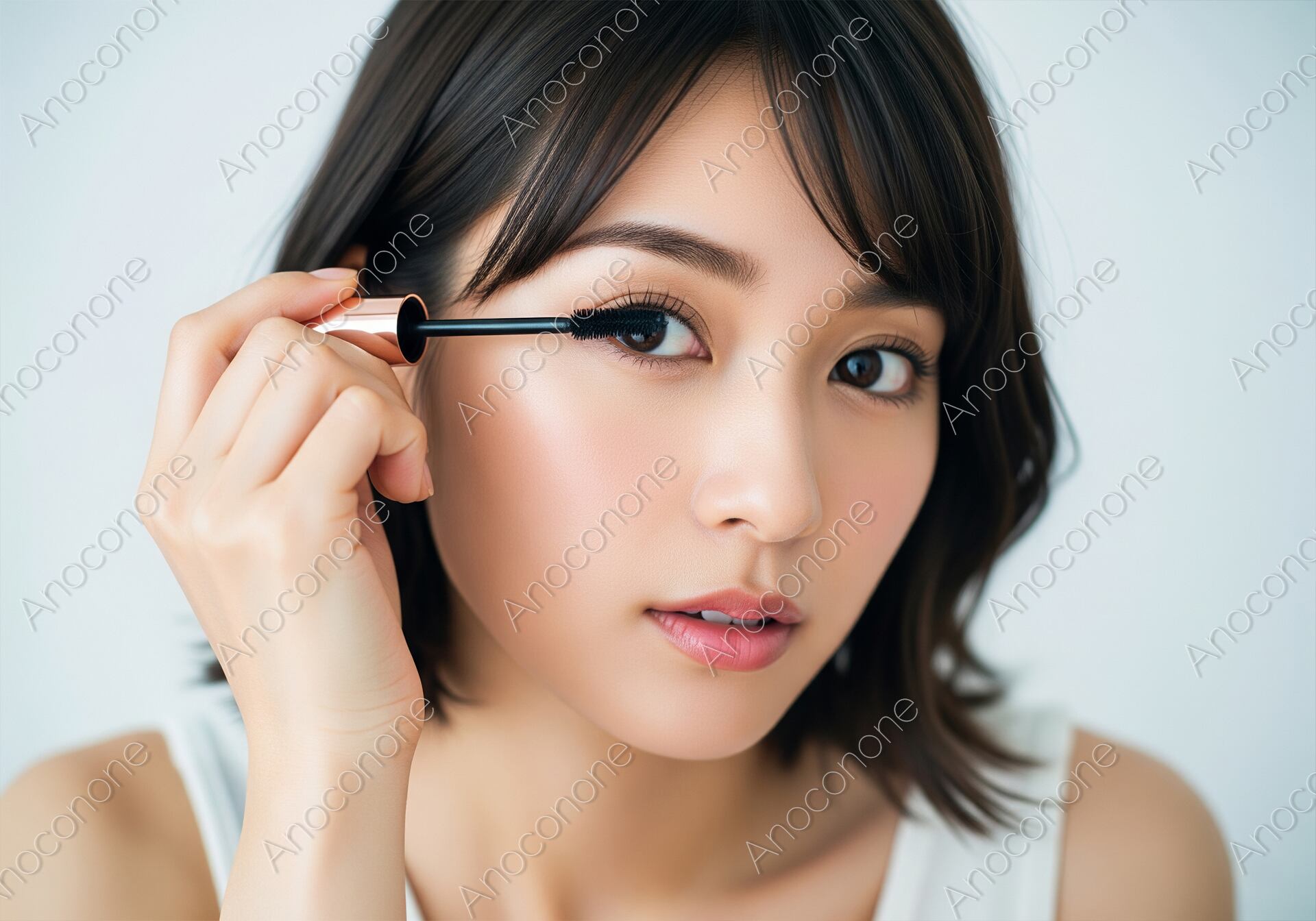 画像素材:清潔感のある白いタンクトップを着用した女性が、手鏡を見ながら丁寧にマスカラを塗っている場面を捉えた一枚です。短めのブラウンヘアが顔周りをすっきりと見せ、真剣な眼差しでまつ毛を整える仕草が印象的です。肌はきめ細かく整えられており、自然なツヤ感が健康的で上品な雰囲気を演出しています。背景はシンプルで明るいトーンにまとめられているため、被写体の動作や表情がより際立っています。マスカラのブラシがまつ毛に触れる瞬間の細やかな描写は、日常のセルフケアや美へのこだわりを感じさせます。アイシャドウやリップの控えめな色使いが、派手すぎない大人の美しさを表現しています。美容関連の広告やコラムのアイキャッチとして、幅広い用途で活用いただける素材です。