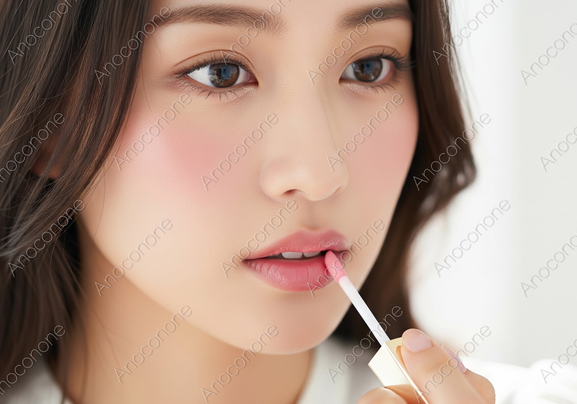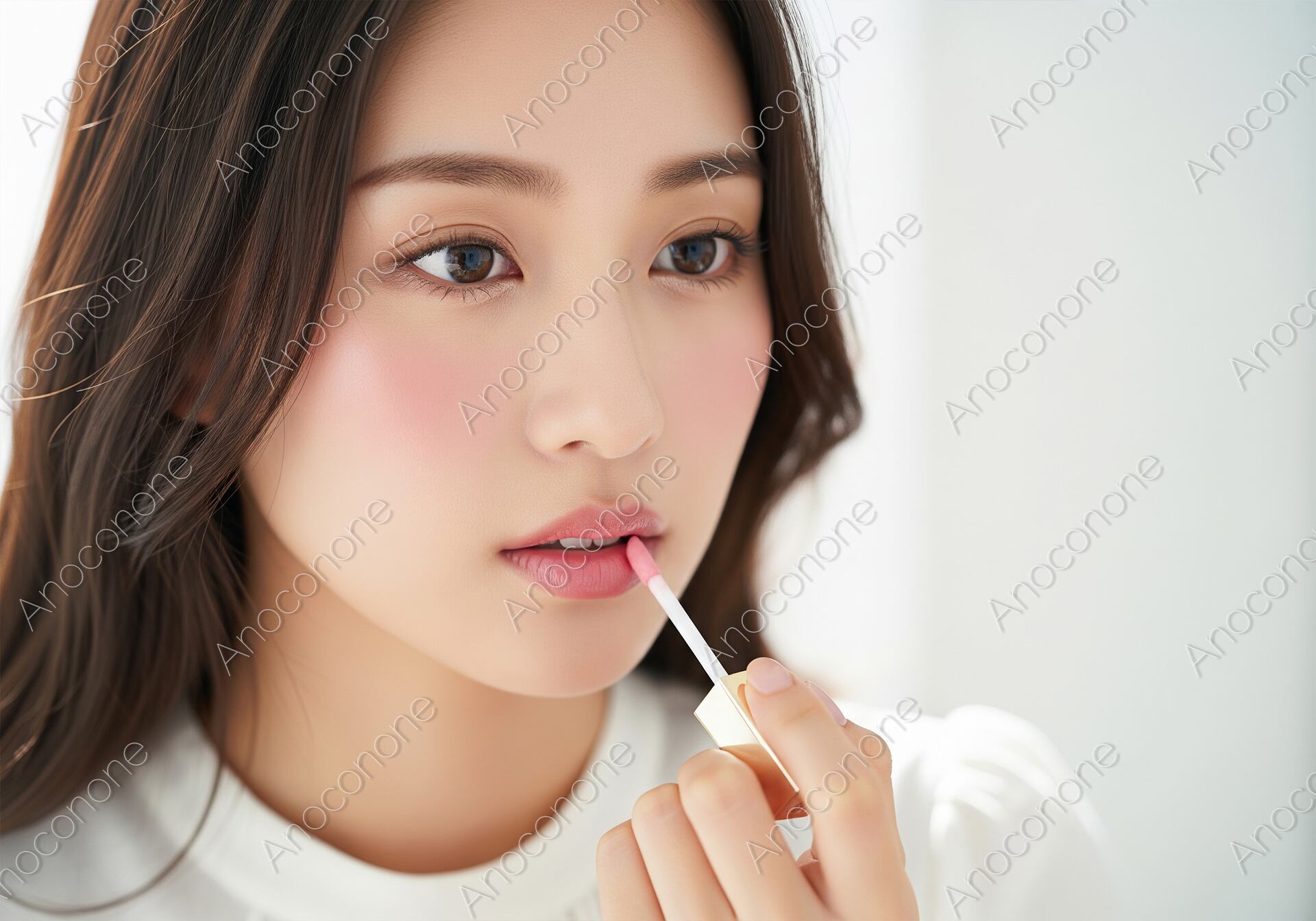 明るい室内で、白いトップスを着用した女性が、手にする口紅で唇に鮮やかな色彩を丁寧に加えています。唇を見つめる真剣な眼差しと、その仕草が、日々のメイクアップがもたらす自己表現の喜びを伝えています。コスメ、リップメイク、美容、自己磨きといったテーマの広告やウェブコンテンツに最適な一枚です。