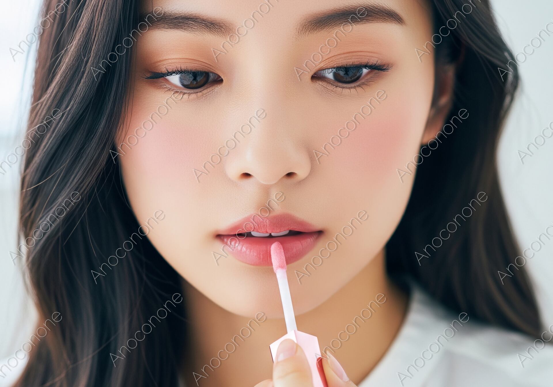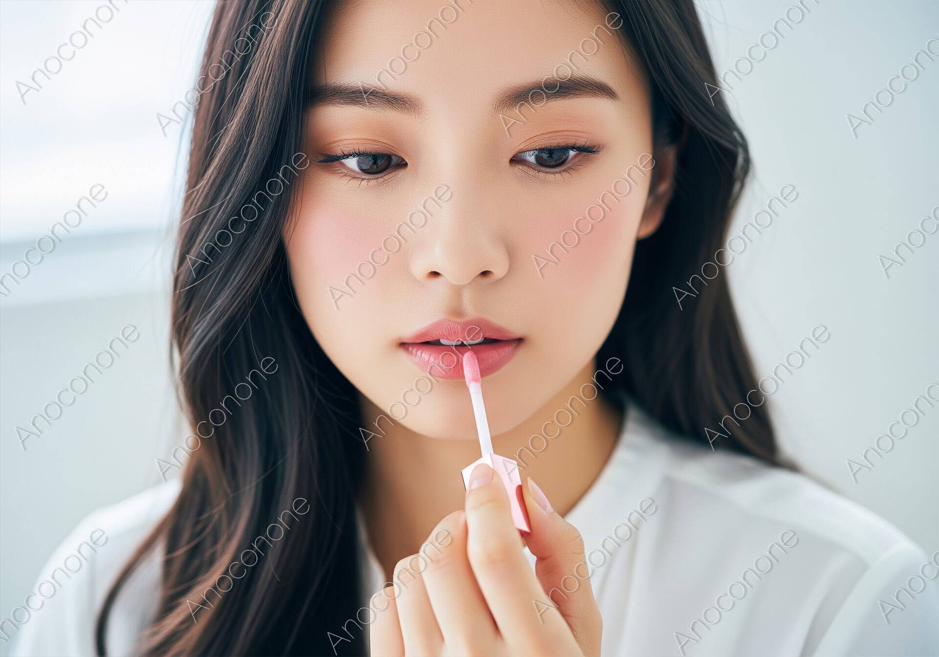 白い襟付きトップスを着用した女性が、柔らかな光の中でピンクのリップグロスを唇に丁寧に塗っているクローズアップポートレートです。潤いとツヤを与える繊細な手つきと、真剣な表情が、メイクアップの最終工程における美へのこだわりと、自信を高める瞬間を表現しています。コスメ、美容、リップケア、セルフケアといったテーマの広告やウェブコンテンツに最適な一枚です。