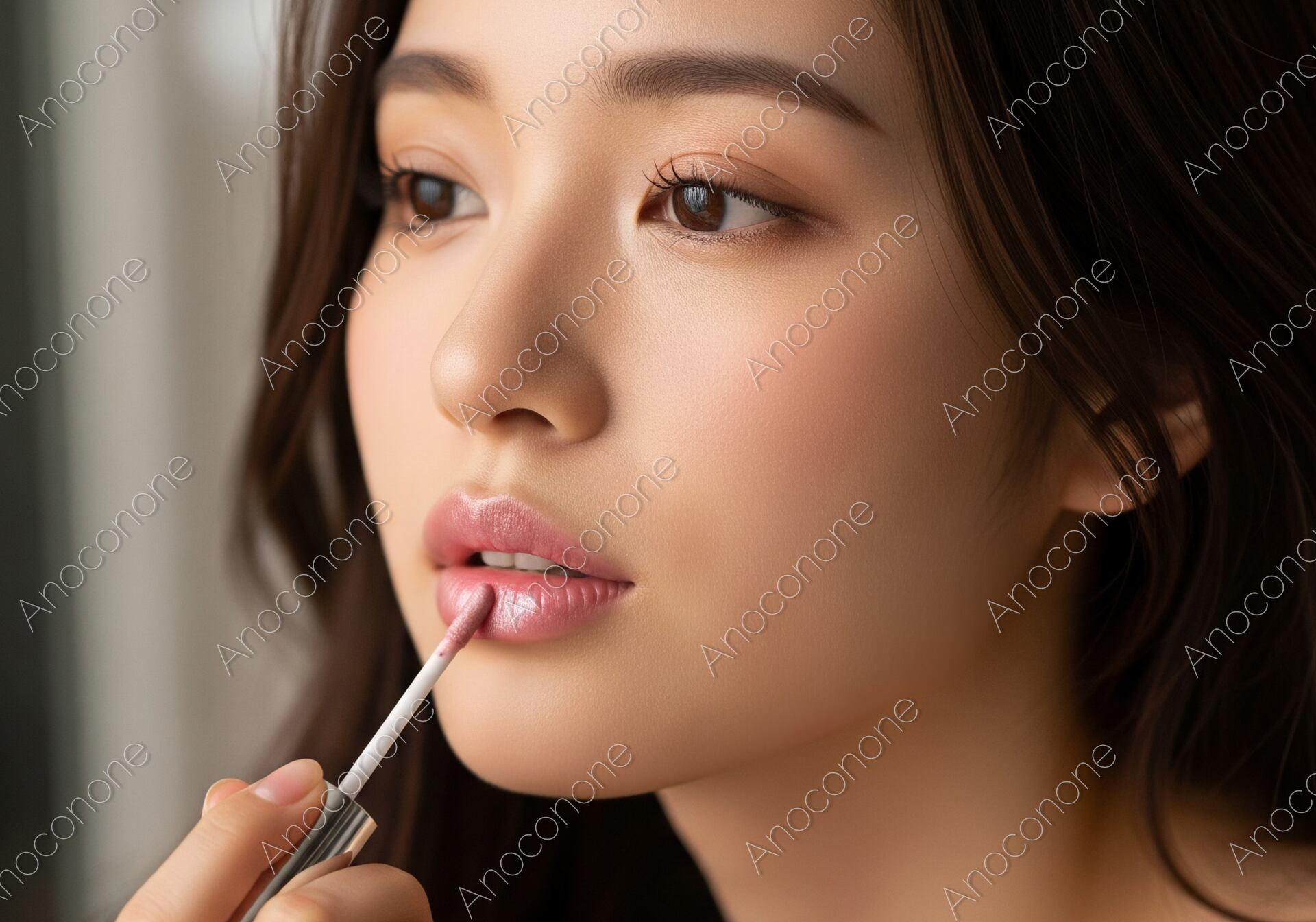 明るい空間で、白いキャミソールを着用した女性が、リップグロスを丁寧に唇に塗っています。透明感のある肌と、潤いと輝きをプラスする繊細な手つきが、口元から放たれる美しさへの意識を表現しています。コスメ、美容、リップケア、セルフケアといったテーマの広告やウェブコンテンツに最適な一枚です。