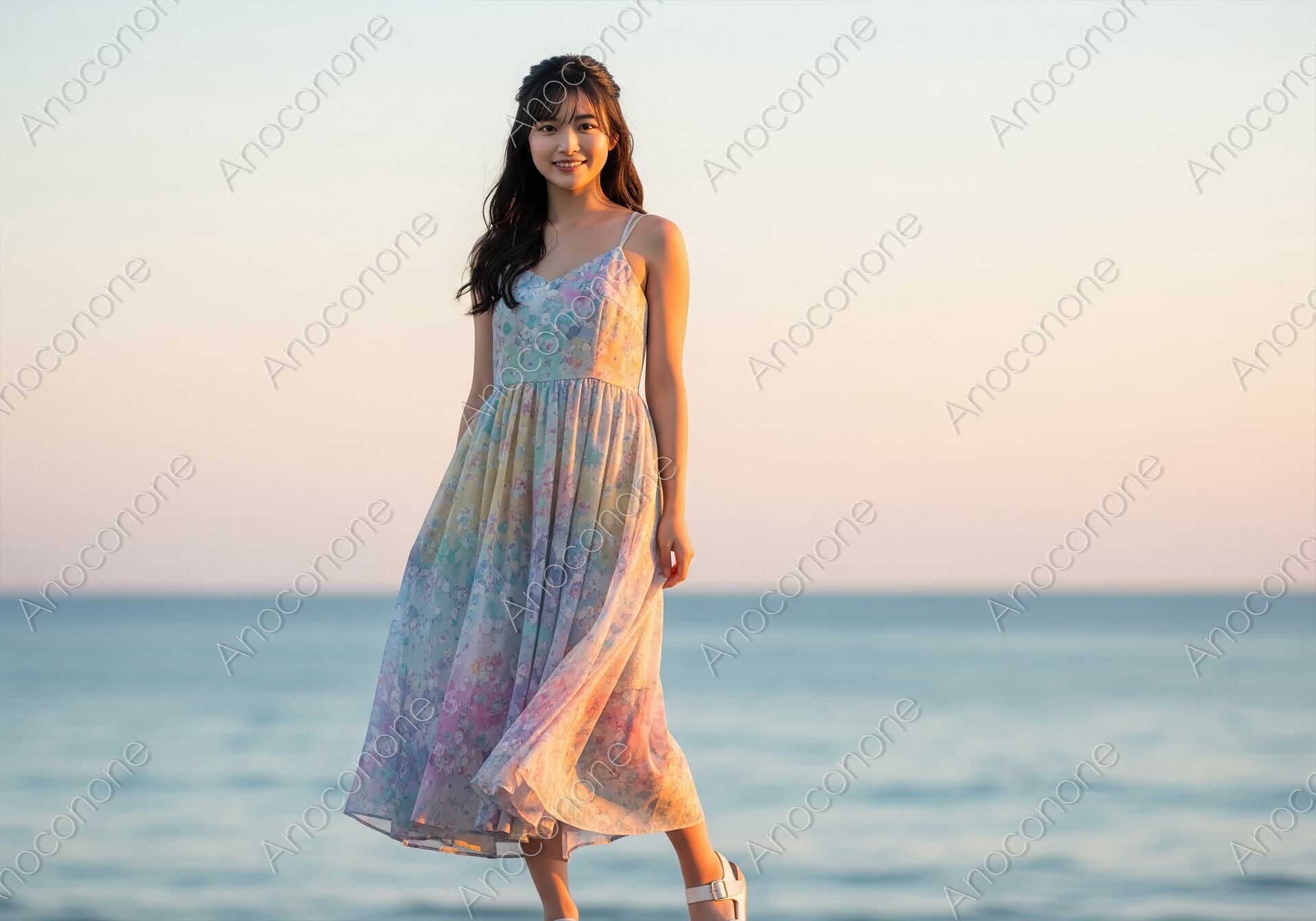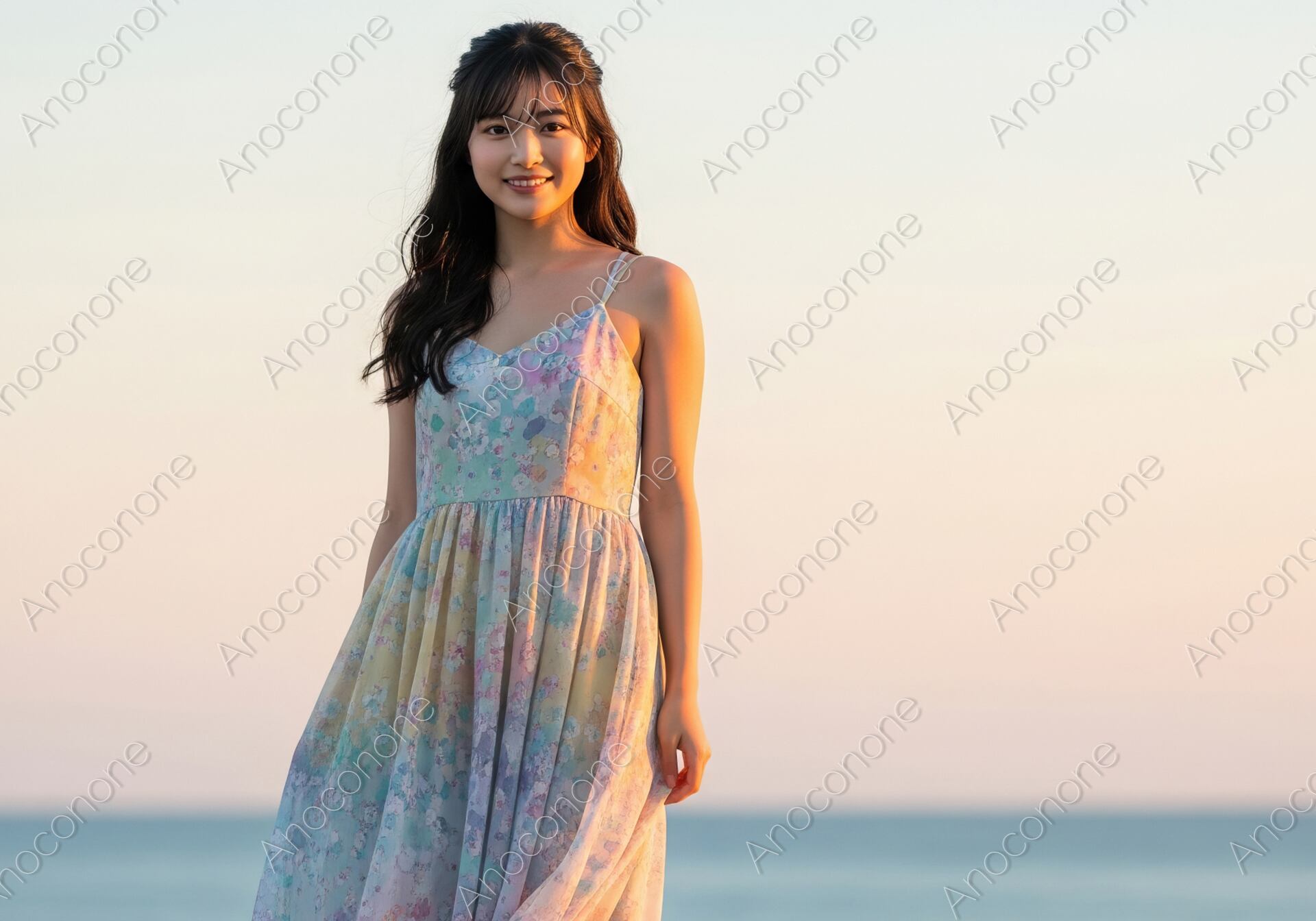 画像素材:穏やかな夕刻の海辺で、パステルカラーの花柄ワンピースに身を包んだ女性が佇むポートレートです。キャミソールタイプのロングワンピースが風に柔らかく揺れ、リゾート地での開放的なひとときを表現しています。背景には水平線まで続く静かな海と、オレンジ色から青色へと美しく移り変わるグラデーションの空が広がっています。逆光気味に差し込む夕陽が彼女のシルエットを優しく縁取り、落ち着いた大人の女性の魅力を引き立てています。足元には白いサンダルを合わせ、軽やかで清楚な夏の装いを見せています。全体的に暖かみのある色彩で構成されており、見る人に安らぎと季節の情緒を感じさせる一枚です。旅行のパンフレットや、夏のファッション誌、ライフスタイルを提案するブログのメインビジュアルに調和しやすい素材です。夏の終わりや夕暮れをテーマにしたデザインに最適です。