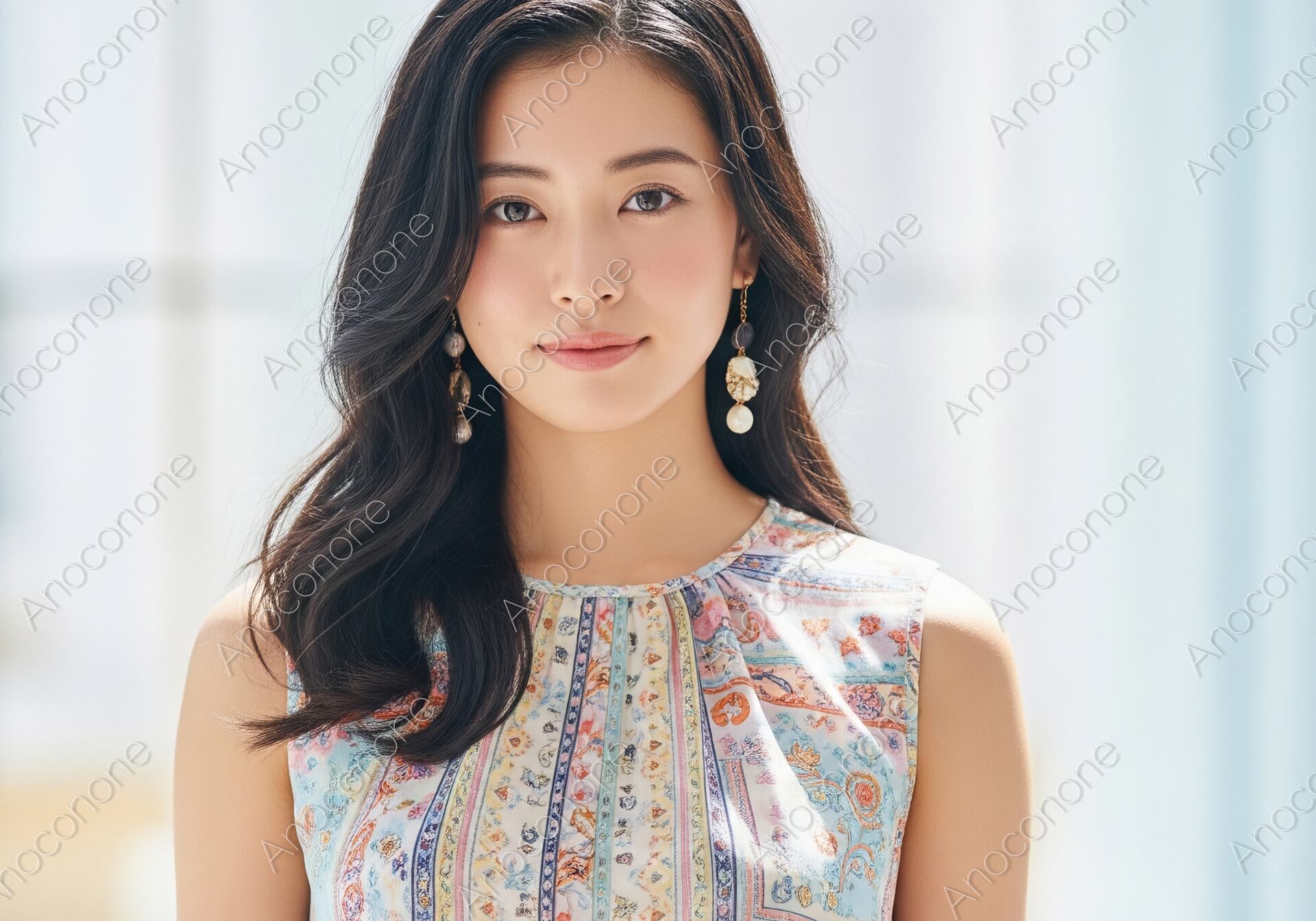 画像素材:明るい日差しが差し込む清潔感のある室内で、こちらを穏やかに見つめる女性のポートレートです。淡いブルーやオレンジが混ざり合ったボタニカル柄のノースリーブブラウスを着用しており、夏の爽やかさと上品さを兼ね備えたコーディネートが印象的です。耳元には大ぶりのパール調イヤリングが輝き、ウェーブのかかった黒髪が顔周りを華やかに彩っています。彼女の表情は非常に落ち着いており、自然体な美しさと透明感のある肌の質感が、柔らかな光の中で際立っています。背景の白を基調とした空間が、都会的で洗練されたライフスタイルを連想させます。シンプルながらも細部まで整えられた構図は、ファッション誌の1ページや広告のメインビジュアルとして馴染みやすい仕上がりです。夏のトレンドファッションや、大人の休日をテーマにしたデザインに最適な素材です。