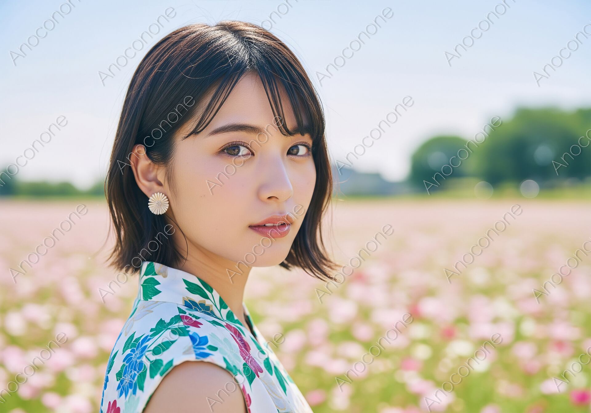 一面に花が咲き誇る美しい花畑で、鮮やかな花柄トップスを着用した女性が、穏やかな表情で遠くを見つめています。花畑の色彩と調和する彼女の装いが、自然との一体感を表現し、夏の心地よい季節感を伝えます。ファッション、自然、ライフスタイル、旅行といったテーマの広告やウェブコンテンツに最適な一枚です。