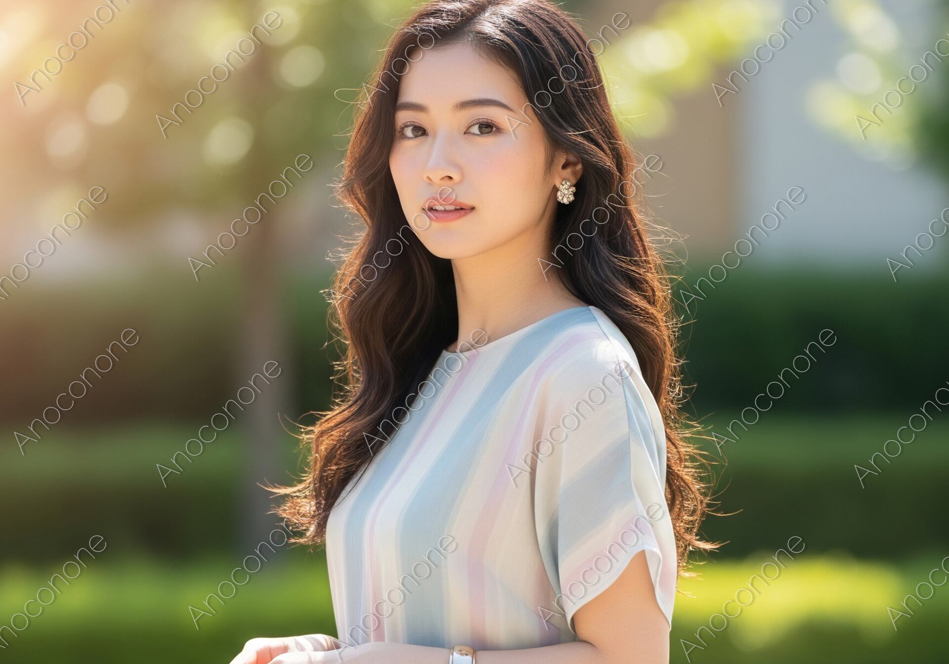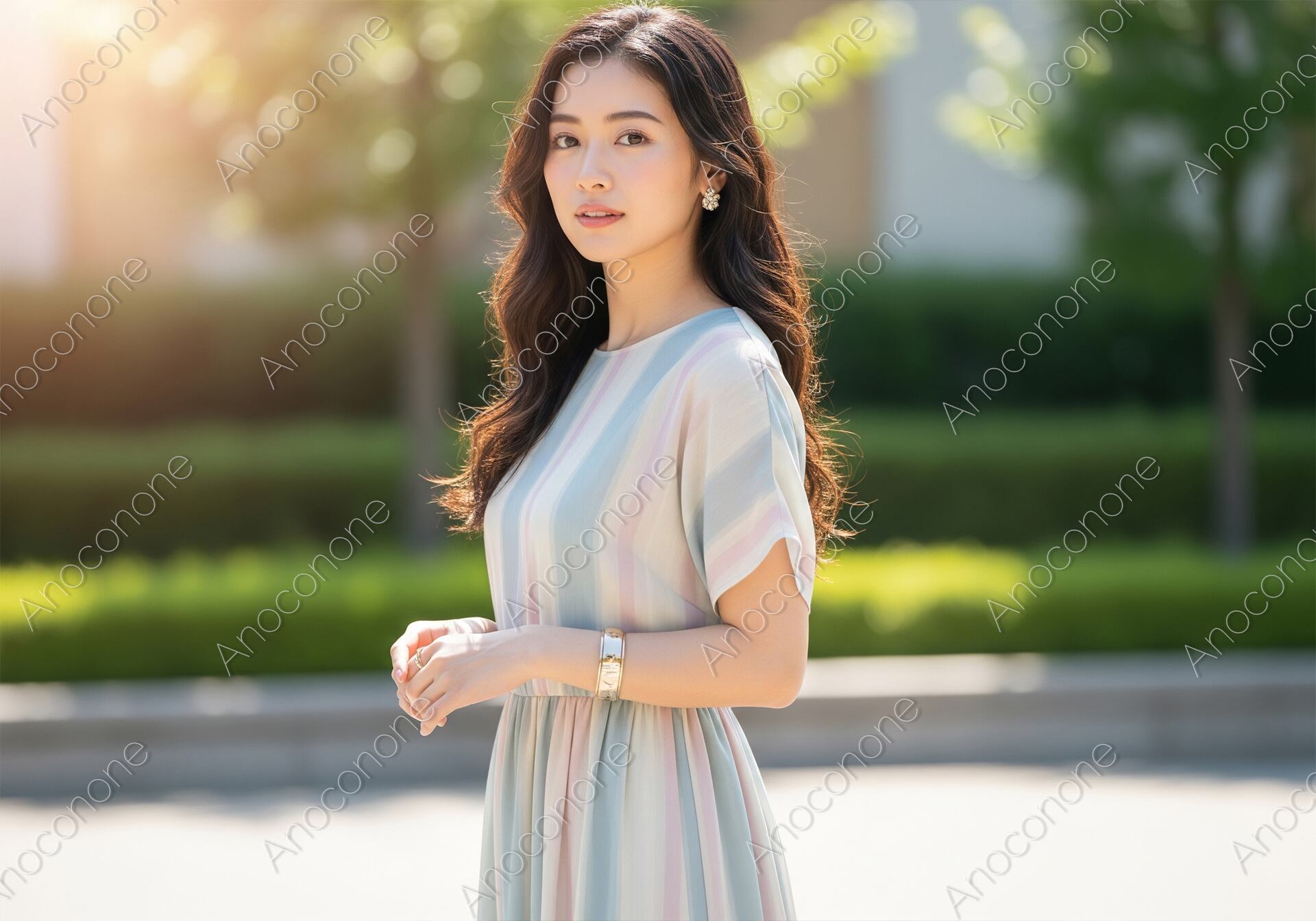 画像素材:明るい日差しが心地よく降り注ぐ屋外で、涼しげな夏の装いを見せる女性のポートレートです。淡いパステルカラーのストライプ柄ワンピースを着用しており、上品で清潔感のあるコーディネートが印象的です。袖口がひらりと揺れるデザインが、夏の開放的な空気感と軽やかさを演出しています。耳元には小ぶりな花の形のイヤリング、手元には太めのシルバーバングルを合わせ、洗練された大人のアクセントを添えています。豊かに波打つロングヘアが風に吹かれ、柔らかな光の中で彼女の透明感のある肌の質感が際立っています。背景には青々とした木々が広がり、都会的な公園や並木道での穏やかな休日を連想させる構図です。シンプルながらも華やかさがあり、ファッション誌の特集や夏のライフスタイルを提案する広告のメインビジュアルに調和します。季節のトレンドを伝えるウェブサイトやブログの素材に最適な一枚です。