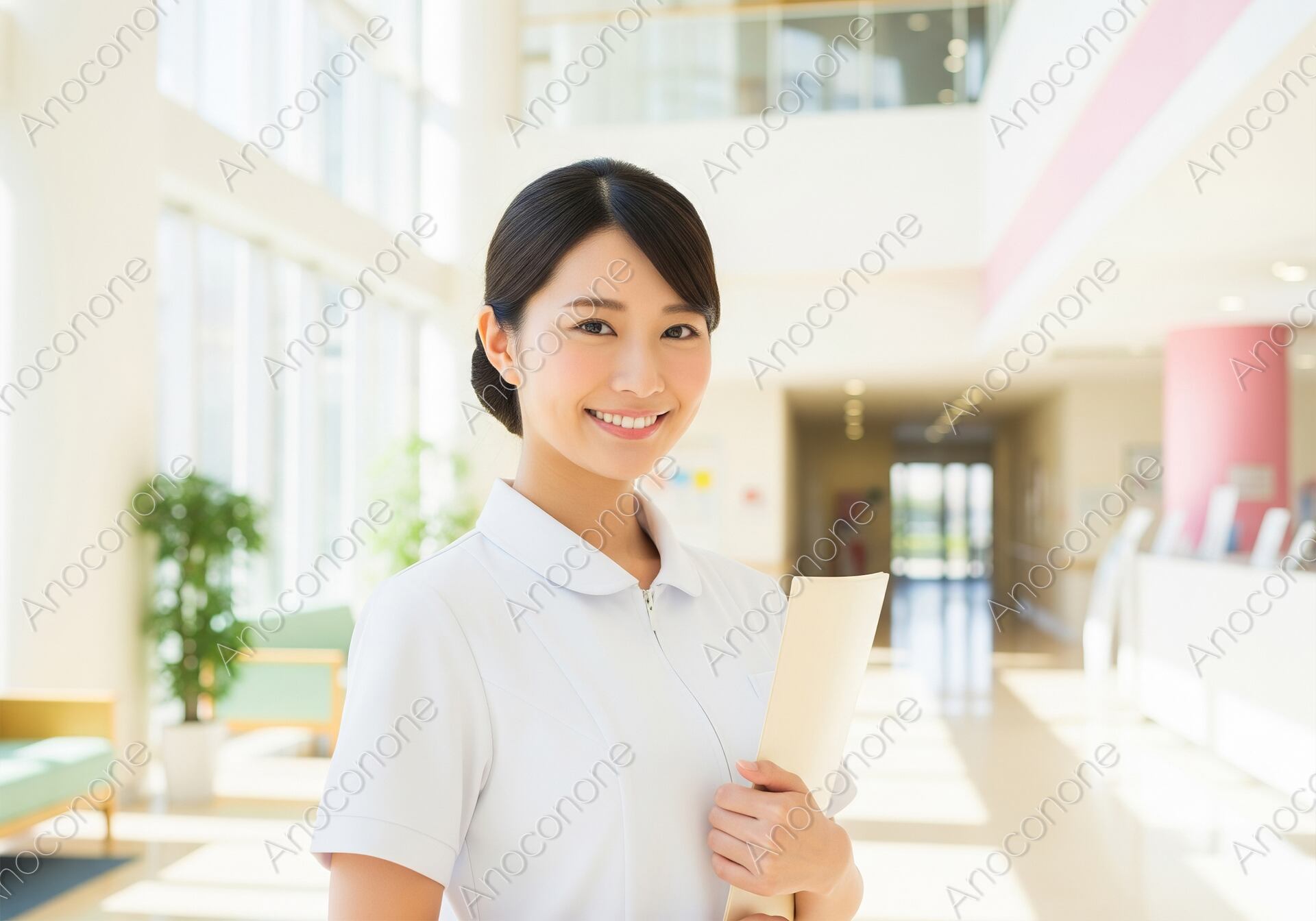 画像素材:自然光がたっぷりと差し込む、広々とした病院のロビーやホールで佇む看護師のポートレートです。清潔感のある白のユニフォームを身に纏い、カルテを大切そうに抱えながら、カメラに向かって優しく親しみやすい笑顔を向けています。背景には吹き抜けのような開放的な空間が広がり、整った医療設備の雰囲気と、患者を温かく迎え入れるホスピタリティが感じられます。きっちりとまとめられたヘアスタイルや、健康的で透明感のある肌の質感が、医療従事者としての信頼感とプロフェッショナルな印象を際立たせています。全体的に明るく柔らかなトーンで構成されており、見る人に安心感と希望を与える一枚です。病院や介護施設の公式ホームページ、看護師の採用案内、地域医療をテーマにしたパンフレットなど、信頼と優しさを伝えたい広報素材に最適です。