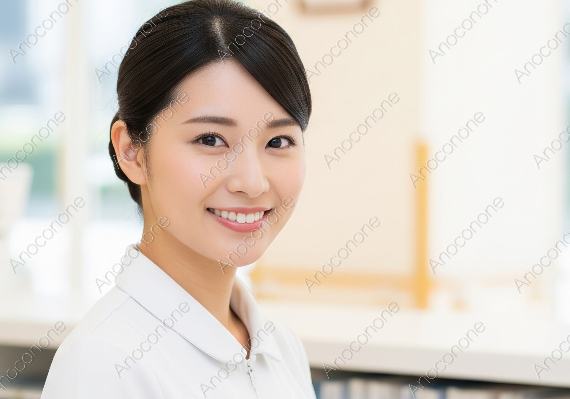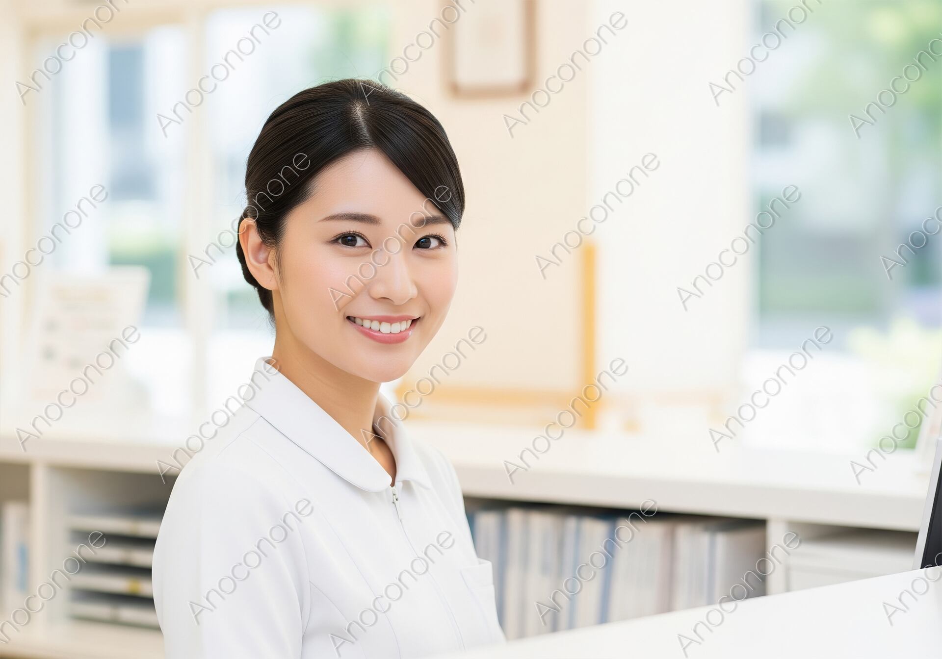 画像素材:清潔感の漂う明るい医療現場で、カメラに向かって優しく微笑む看護師のポートレートです。白のナースウェアを端正に着こなし、髪をきっちりとまとめたスタイルが、プロフェッショナルとしての信頼感と清潔感を際立たせています。背景には整理整頓されたナースステーションや受付カウンターが見え、背後から差し込む柔らかな光が、安心感のある温かな医療現場の雰囲気を演出しています。彼女の落ち着いた眼差しと誠実そうな笑顔は、患者やその家族に寄り添う献身的な姿勢を表現しており、見る人に大きな安心感を与えます。肌の透明感やユニフォームの質感が細部まで滑らかに描写された、非常に高品質な一枚です。病院やクリニックの公式ウェブサイト、看護職の求人メディア、ヘルスケア関連のパンフレットなど、安心と信頼を伝えたいデザインのメインビジュアルに最適です。
