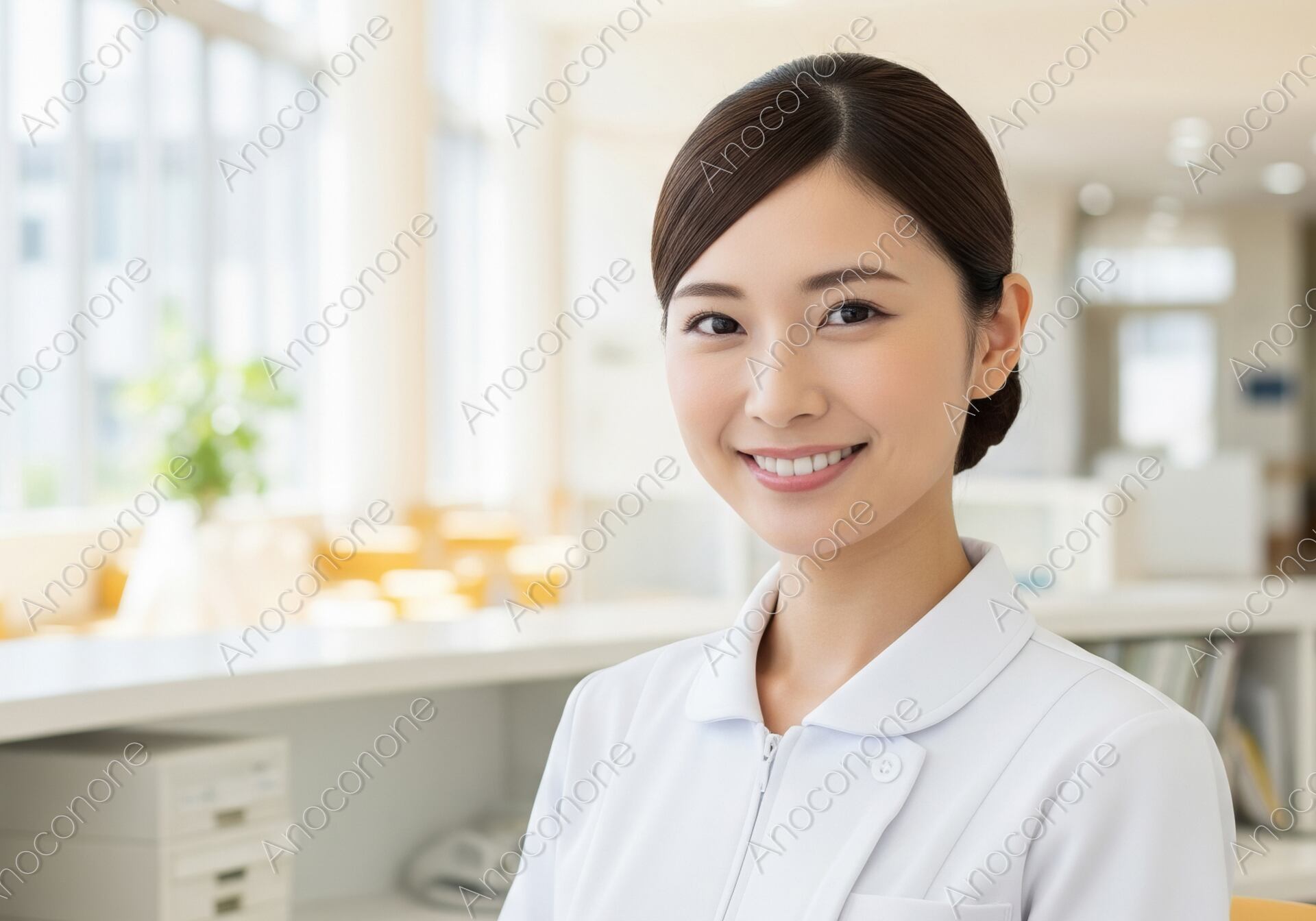 画像素材:自然光がたっぷりと差し込む、広々としたナースステーションで佇む看護師のポートレートです。清潔感のある白のユニフォームを身に纏い、カメラに向かって優しく、かつ自信に満ちた笑顔を向けています。背景には整理整頓されたナースステーションや、大きな窓から光が降り注ぐ明るいロビーが見え、整った医療設備とホスピタリティあふれる環境を表現しています。きっちりとまとめられたヘアスタイルや、健康的でなめらかな肌の質感が、医療従事者としての信頼感とプロフェッショナルな印象を際立たせています。全体的に明るく開放的なトーンで構成されており、見る人に安心感と希望を与える一枚です。病院やクリニックの公式ウェブサイト、看護師の採用パンフレット、地域医療や福祉をテーマにした広報資料など、信頼と優しさを伝えたいデザインに最適です。