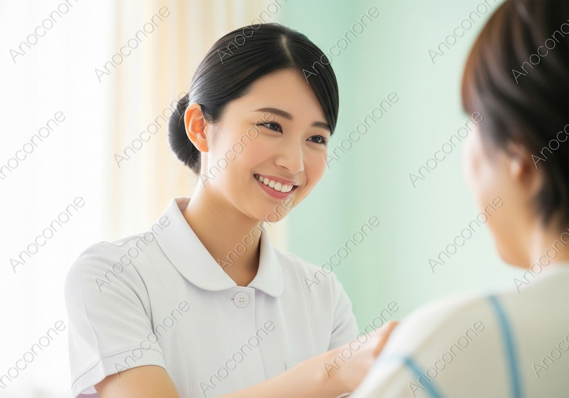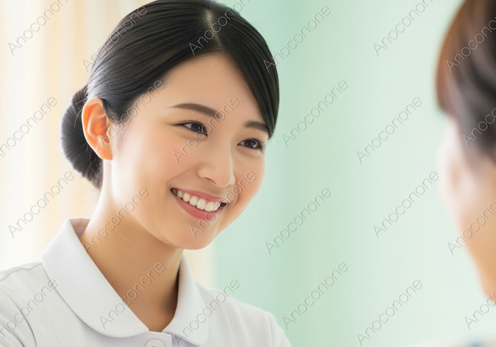 画像素材:明るい医療現場で、対面している相手(患者)に向けて心温まる微笑みを送る看護師のポートレートです。白のナースウェアを清潔感たっぷりに着こなし、きっちりとまとめられた黒髪がプロフェッショナルな誠実さを演出しています。相手の言葉に耳を傾け、優しく受け止めるような彼女の表情からは、単なる医療行為を超えた心のケアや献身的な姿勢が伝わってきます。背景には柔らかな光が差し込み、空間全体を穏やかなトーンで包み込んでいるため、見る人に安心感と信頼感を与えます。肌の透明感や瞳の輝き、ユニフォームのディテールまで緻密に描写されており、非常に高品質な仕上がりです。病院やクリニックの公式ウェブサイト、訪問看護・介護サービスのパンフレット、医療従事者向けの教育・求人メディアなど、ホスピタリティと信頼を伝えたいあらゆるデザインに最適です。