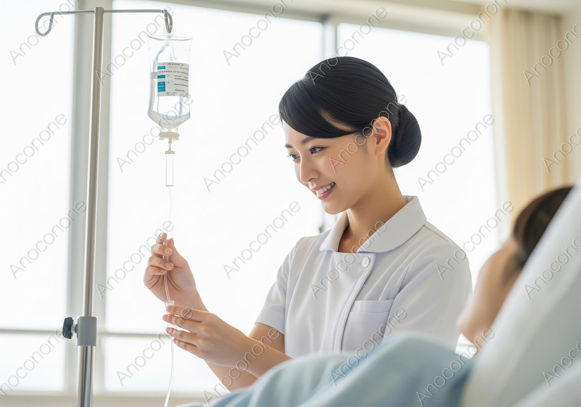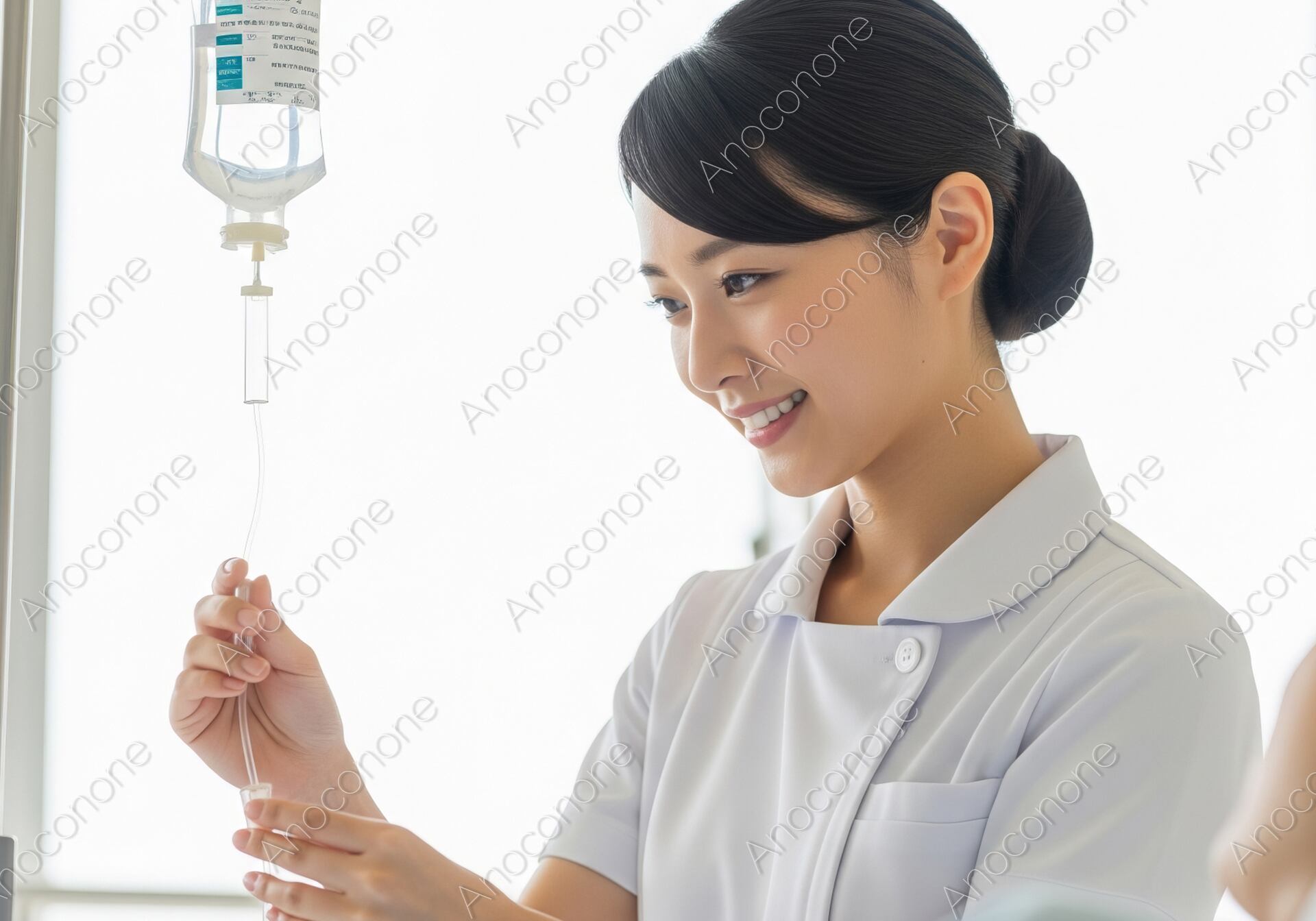 画像素材:明るく衛生的な病室で、患者の点滴(輸液)を丁寧に確認・調整している看護師の姿を捉えたポートレートです。白の清潔なナースウェアに身を包み、真剣ながらも穏やかな微笑みを絶やさないその表情からは、確かな技術と患者への深い思いやりが伝わります。背景には窓から柔らかな自然光が差し込み、回復を願う静かで前向きな療養環境を表現しています。きっちりとまとめられたヘアスタイルや、健康的でなめらかな肌の質感が、医療プロフェッショナルとしての誠実さと安心感を際立たせています。医療処置の日常的な一コマを切り取ったこの構図は、見る人に「守られている」という確かな安心感を与えます。総合病院やクリニックの紹介、看護技術の解説、訪問看護サービスのパンフレット、医療・介護系の求人ポータルサイトなど、質の高いケアと信頼を訴求したいデザインのメインビジュアルに最適です。