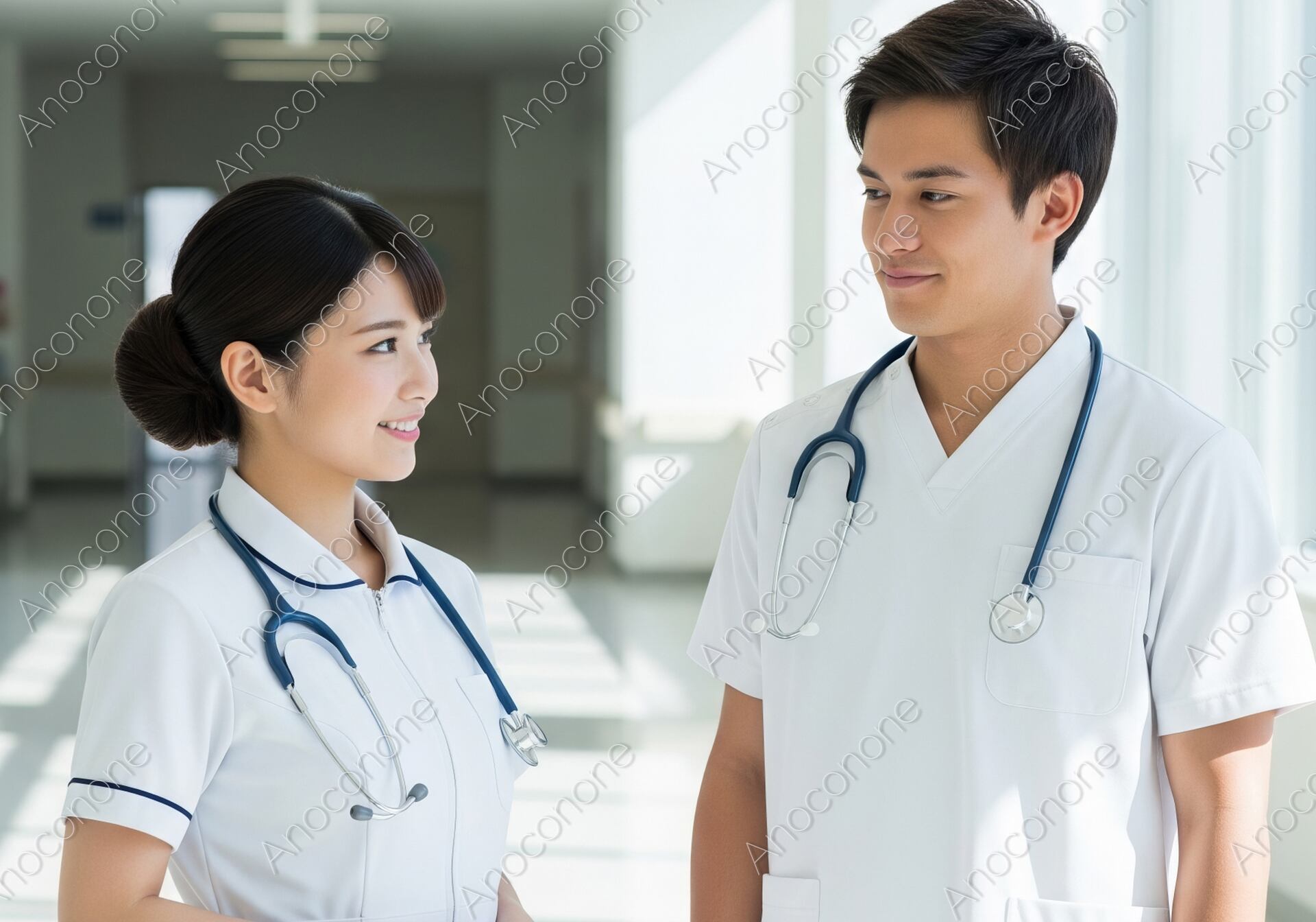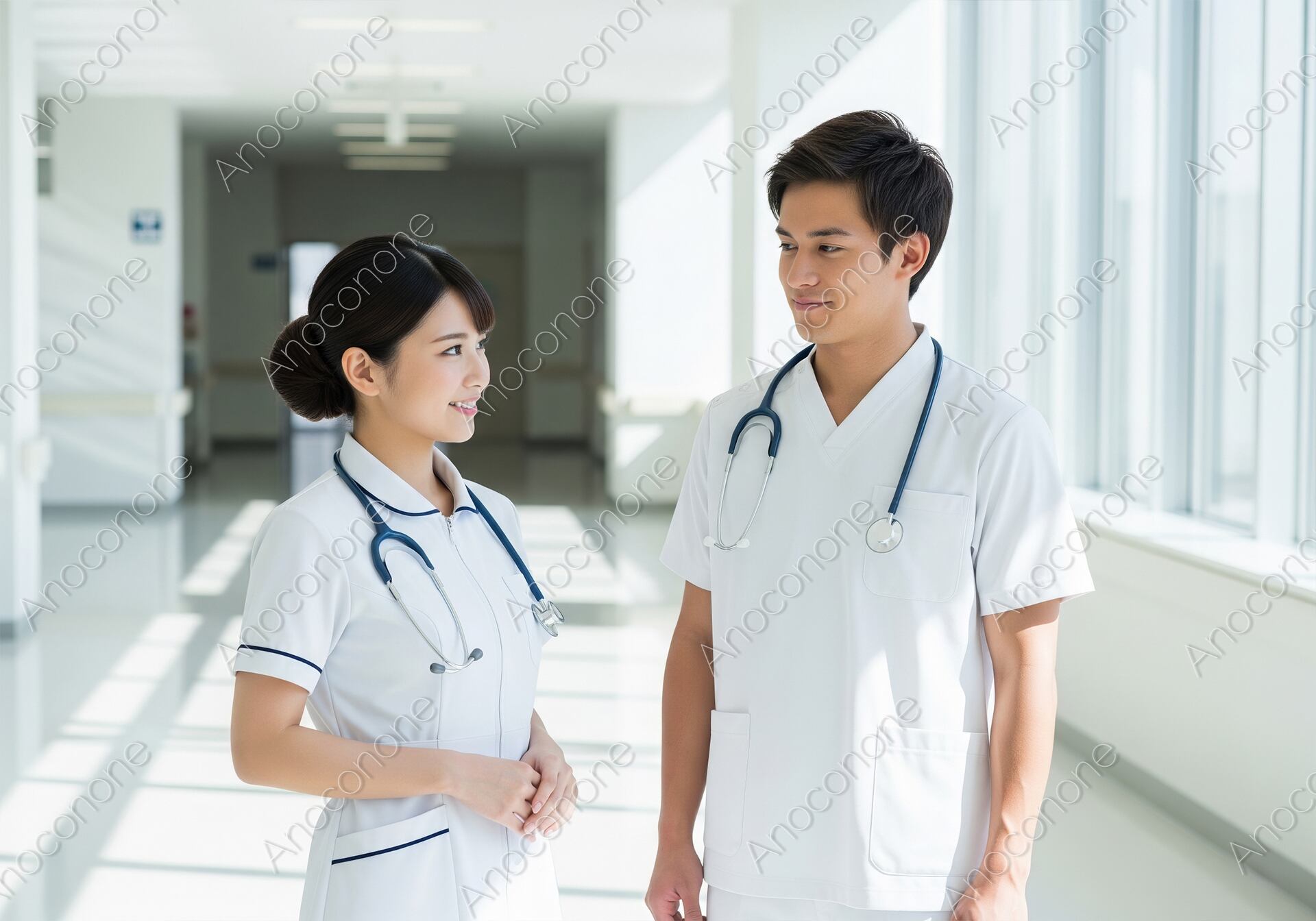 画像素材:自然光がたっぷりと差し込む、白を基調とした清潔な病院の廊下で、男女二人の医療従事者が向き合って佇むポートレートです。二人は共に首から聴診器をかけ、白の機能的なユニフォームを身に纏っており、プロフェッショナルな誠実さとチームとしての連携の強さを感じさせます。女性側は穏やかな笑顔を浮かべて相手を見つめ、男性側も信頼を寄せるような優しい眼差しを返しており、職場における良好なコミュニケーションが伝わってくる構図です。背景の廊下は奥行きがあり、大きな窓からの光が空間全体を明るく前向きなトーンに包み込んでいます。肌の質感や聴診器のディテールまで鮮明に描写された高品質な仕上がりです。総合病院の施設案内、医師や看護師の採用募集サイト、医療チームの連携をテーマにしたコラムや広報誌など、信頼性と温かみを同時に伝えたいデザインのメインビジュアルに最適です。