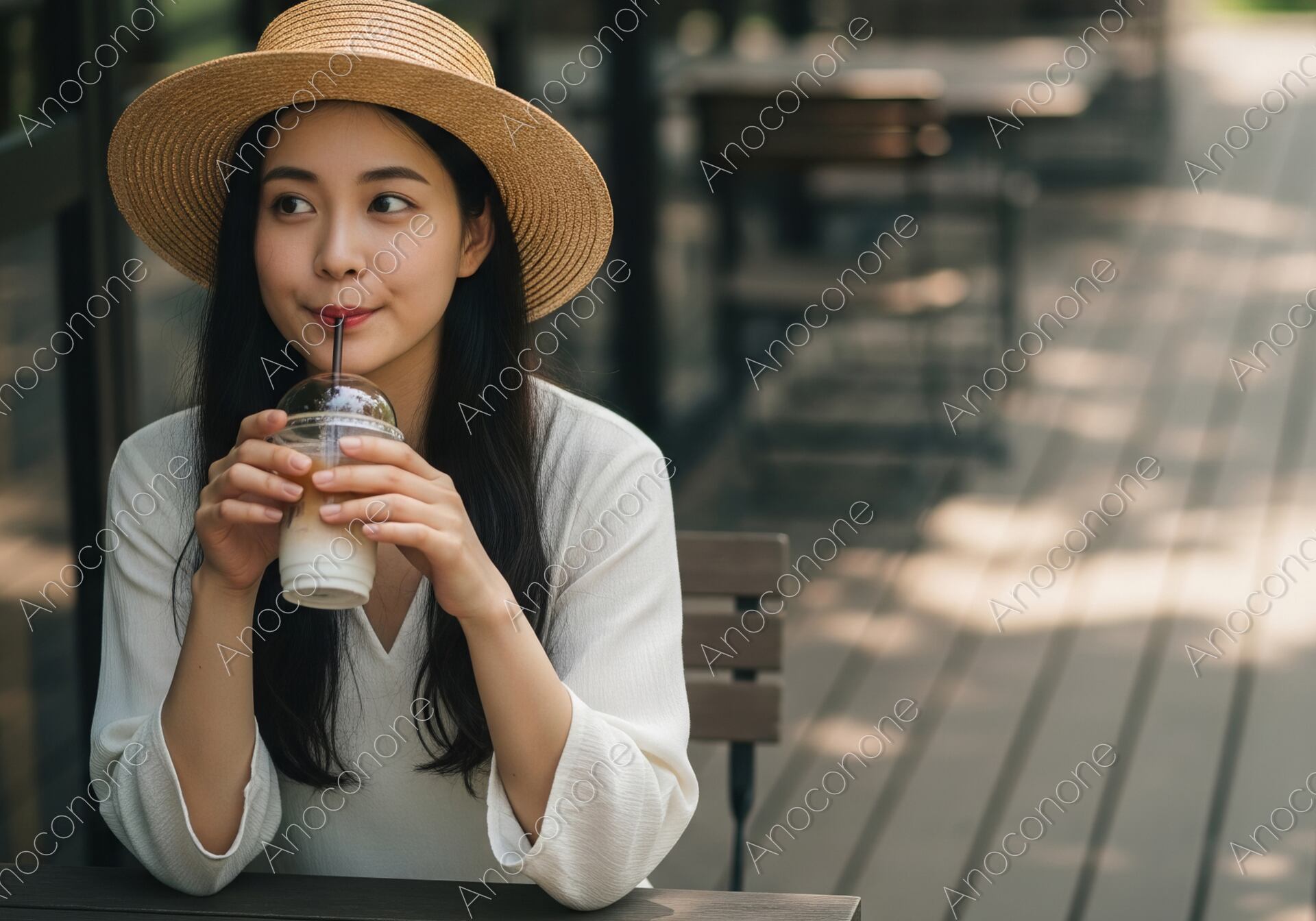 画像素材:木漏れ日が美しく模様を描く、落ち着いた雰囲気のテラスカフェで寛ぐ女性のポートレートです。夏らしい麦わら帽子に清潔感のある白いトップスを合わせ、冷たいカフェラテを楽しみながら、ふと視線を外して物思いにふける横顔が印象的です。背景には、木の温もりを感じさせるウッドデッキや洗練された黒のフレームの建物が広がり、都会的なセンスと自然の心地よさが融合した上質な空間を演出しています。柔らかな光に照らされた彼女の黒髪や、健康的でなめらかな肌の質感が、静寂の中で際立ち、見る人に穏やかな時間の流れを感じさせます。大人の休日、一人旅、夏のティータイムなどをテーマにしたライフスタイルメディアや、カフェ・レストランの広報、旅行関連のパンフレットなど、情緒的で洗練されたイメージを伝えたいデザインに最適です。