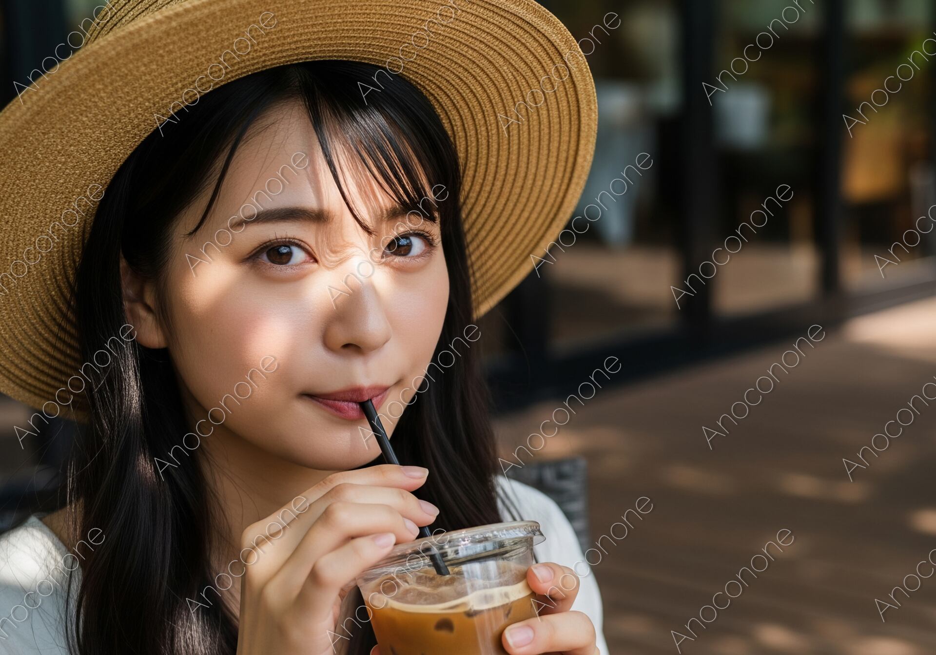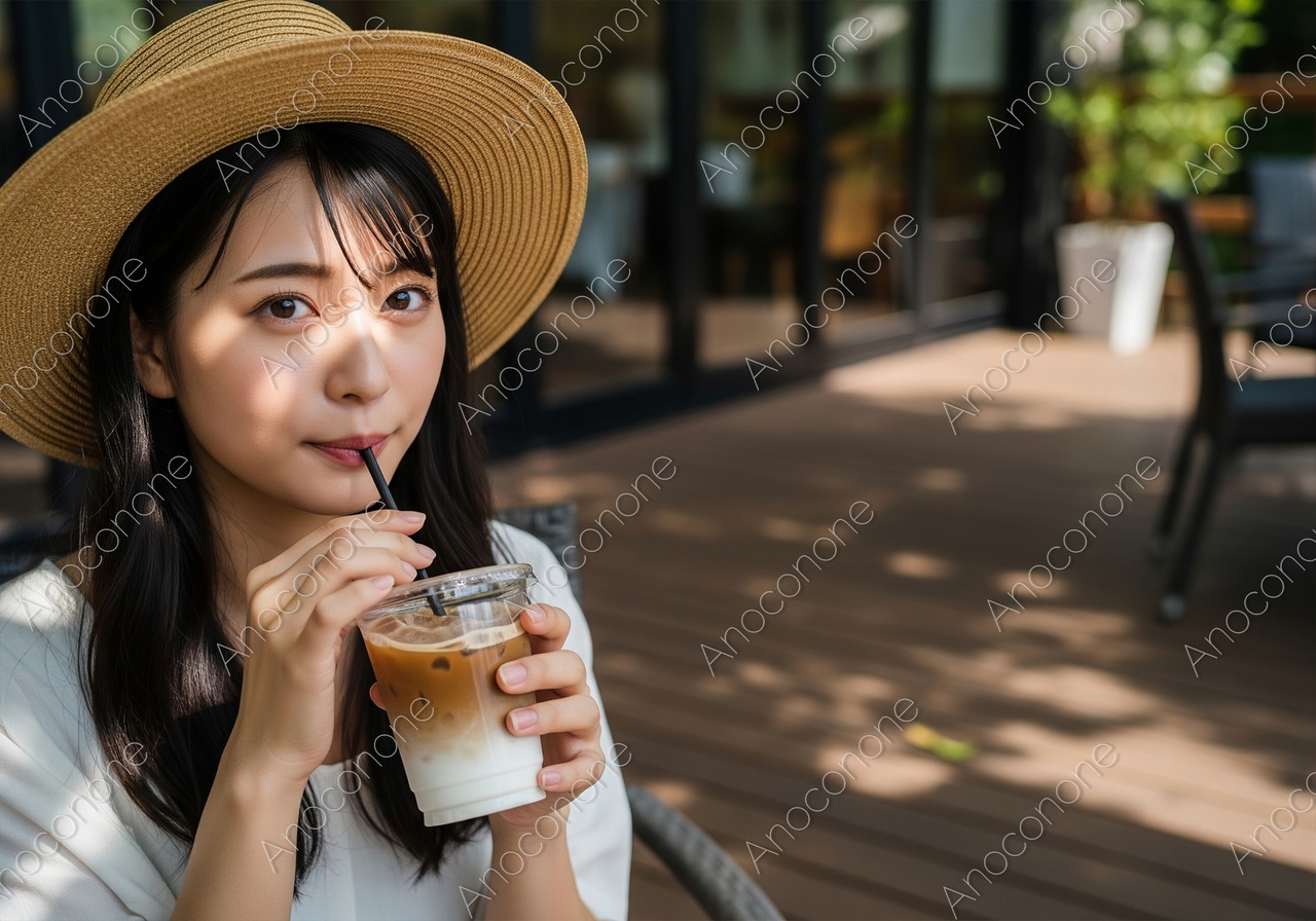 木漏れ日が降り注ぐテラス席で、白いトップスと麦わら帽子を着用した女性が、冷たいアイスコーヒーをストローで飲みながら、穏やかな眼差しでカメラを見つめています。帽子が作り出す光と影のコントラストが、彼女の表情を印象的に際立たせ、夏のカフェでの心地よいひとときを表現しています。カフェ、ドリンク、夏、ライフスタイル、休憩といったテーマの広告やウェブコンテンツに最適な一枚です。