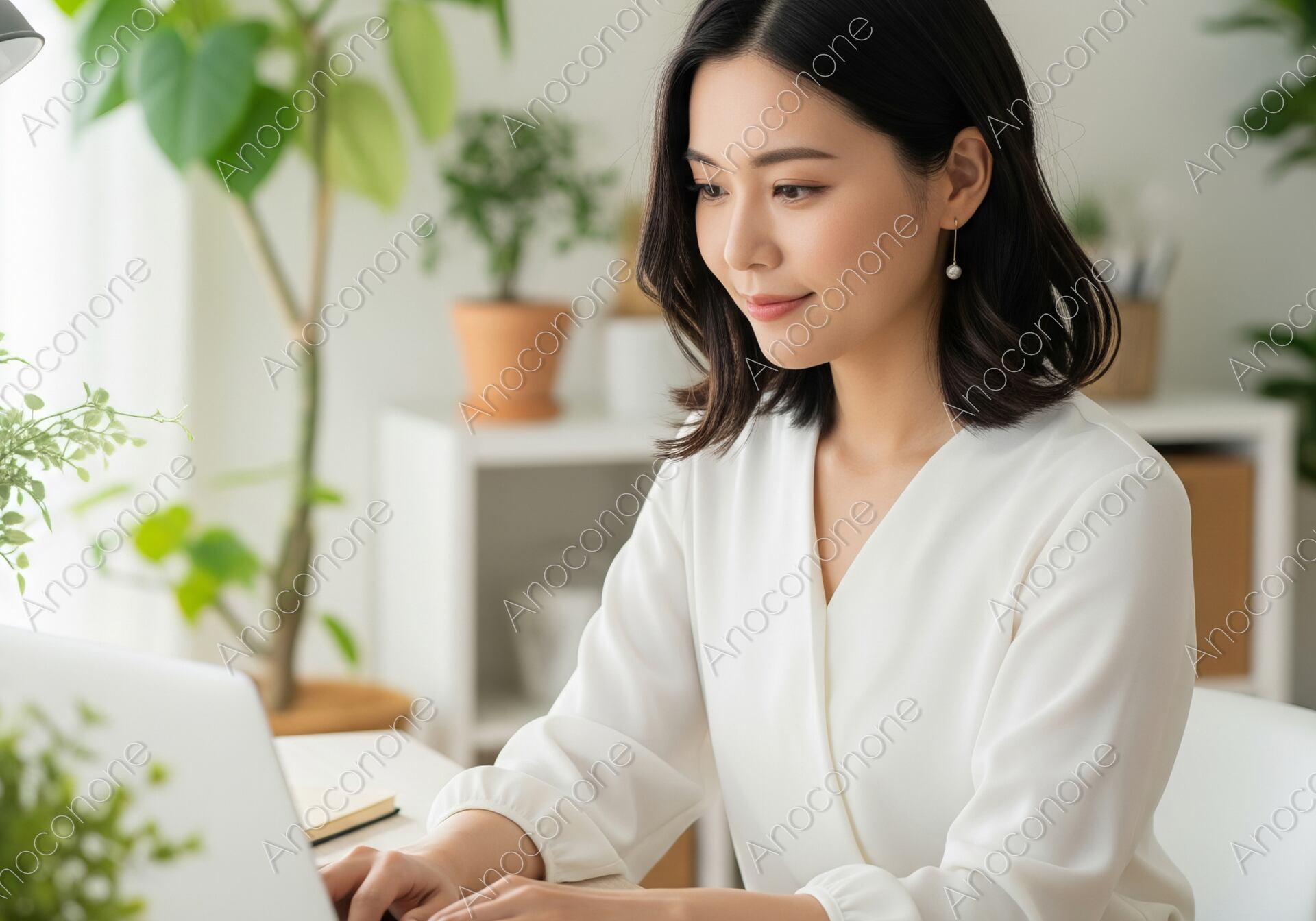 画像素材:たくさんの観葉植物に囲まれた、明るく開放的なワークスペースで仕事をする女性のポートレートです。清潔感のある白いVネックのブラウスを身に纏い、柔らかな微笑みを浮かべながらノートパソコンを操作する姿は、心身ともに充実した理想的なリモートワークのスタイルを表現しています。背景には生き生きとしたグリーンの葉が重なり、デスクを照らすスタイリッシュな照明が、落ち着きのある洗練されたインテリア空間を演出しています。窓から差し込む自然光が彼女の表情を明るく照らし、健康的でなめらかな肌の質感を際立たせています。在宅勤務やフリーランスの働き方、ワークライフバランスをテーマにしたビジネスメディア、インテリアや住宅関連のパンフレット、PC周辺機器やオンラインサービスの広告など、心地よさと集中力が共存するポジティブなイメージを伝えたいデザインに最適です。