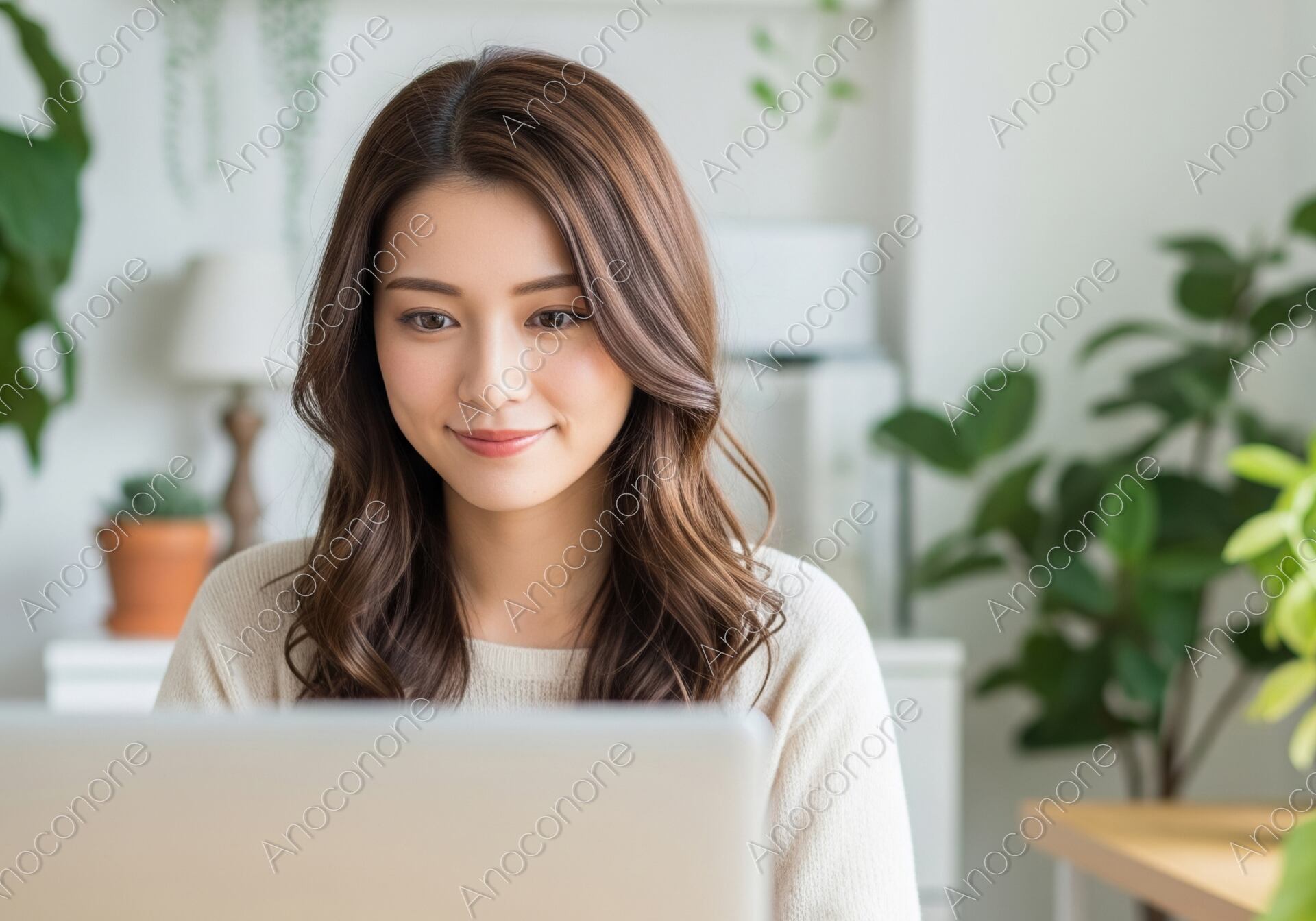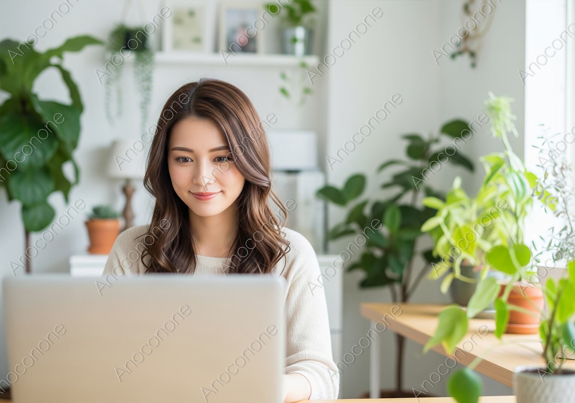 画像素材:たくさんの観葉植物に囲まれた、清潔感あふれる明るい室内でリモートワークに励む女性のポートレートです。柔らかな色合いのニットを身に纏い、ノートパソコンの画面を見つめながら穏やかな微笑みを浮かべる姿は、自分らしいペースで働く心地よさと、充実したライフスタイルを象徴しています。背景には生き生きとしたグリーンの葉がバランスよく配置され、ナチュラルで洗練されたインテリア空間を演出しています。窓から差し込む自然光が彼女の表情を優しく照らし、健康的で透明感のある肌の質感が、静寂の中で美しく際立っています。在宅勤務やフリーランスの働き方、ワークライフバランスをテーマにしたビジネスメディア、インテリアや住宅関連のパンフレット、PC周辺機器やオンラインサービスの広告など、心地よさと集中力が共存するポジティブなイメージを伝えたいデザインに最適です。
