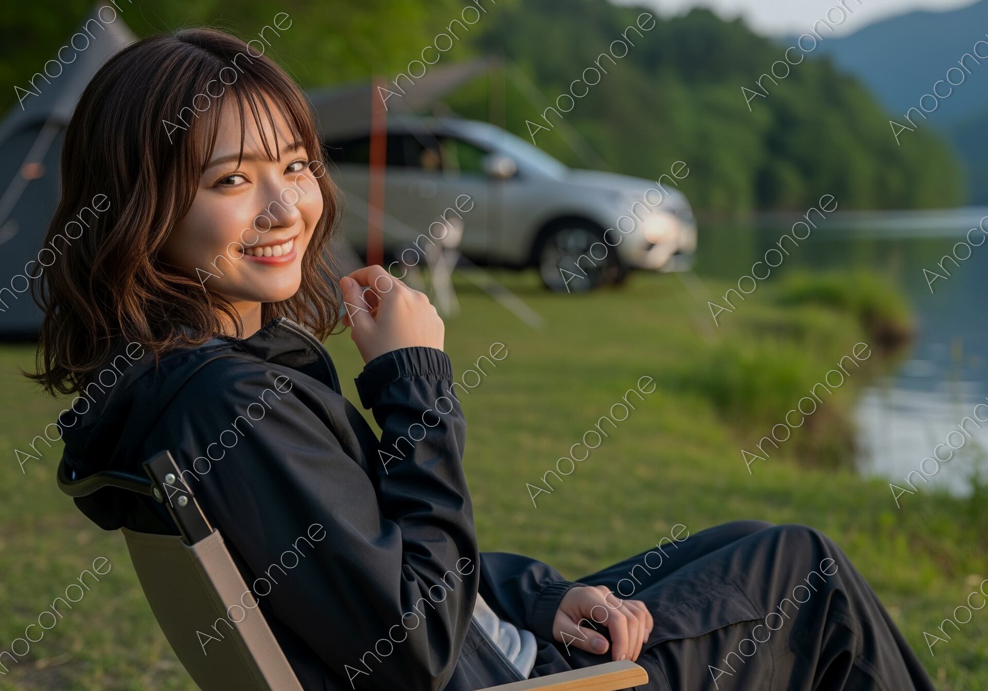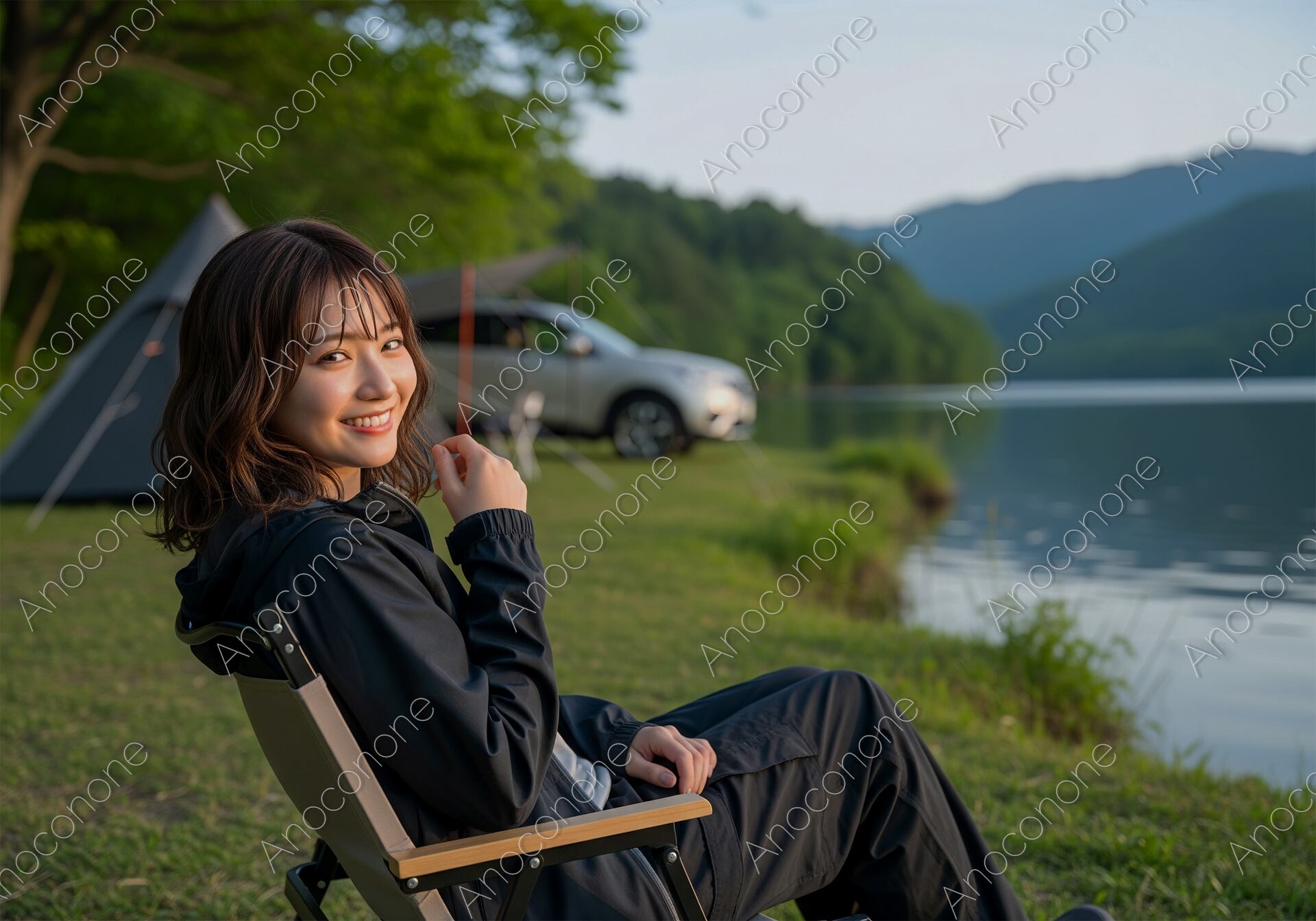 画像素材:山々に囲まれた静謐な湖畔のキャンプ場で、アウトドアチェアに腰掛けリラックスした表情を見せる女性のポートレートです。黒の機能的なマウンテンパーカーとパンツを身に纏い、カメラに向けて向けられた自然体な笑顔が、日常を離れた開放感と旅の喜びを表現しています。背景には、穏やかな水面を湛える湖と深く連なる山並みが広がり、その傍らにはテントとSUVが配置され、自由でアクティブなソロキャンプやオートキャンプのスタイルを演出しています。夕暮れ時の柔らかな光が彼女の表情を優しく照らし、健康的で瑞々しい肌の質感が、大自然の風景の中で際立っています。キャンプ・アウトドア関連のブランド広告、旅の魅力を伝える観光メディア、ライフスタイル提案のコラム、あるいはSNS向けのアイキャッチなど、自然の中での豊かな体験を伝えたいデザインのメインビジュアルに最適です。