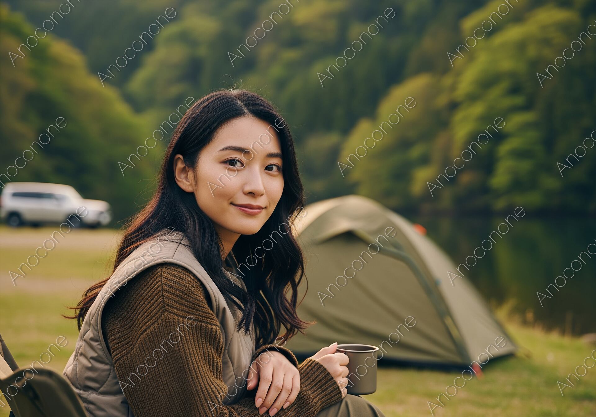 画像素材:深く連なる新緑の山々と穏やかな湖を背景に、キャンプチェアで寛ぐ女性のポートレートです。落ち着いたカーキのベストとニットを合わせた機能的かつ洗練されたアウトドアファッションを身に纏い、マグカップを手に穏やかな微笑みを浮かべています。傍らにはコンパクトなドーム型テントが設営され、遠くにはオートキャンプを想起させる車両も描写されており、自由でアクティブな旅のスタイルを演出しています。曇り空の柔らかな光が彼女の表情を優しく包み込み、健康的で透明感のある肌の質感が、周囲のナチュラルな風景と美しく調和しています。キャンプギアのプロモーション、アウトドア関連のウェブサイト、旅をテーマにしたライフスタイル雑誌、あるいは「癒やし」や「非日常」を提案する広報資料など、自然の中での上質な時間を伝えたいデザインのメインビジュアルに最適です。