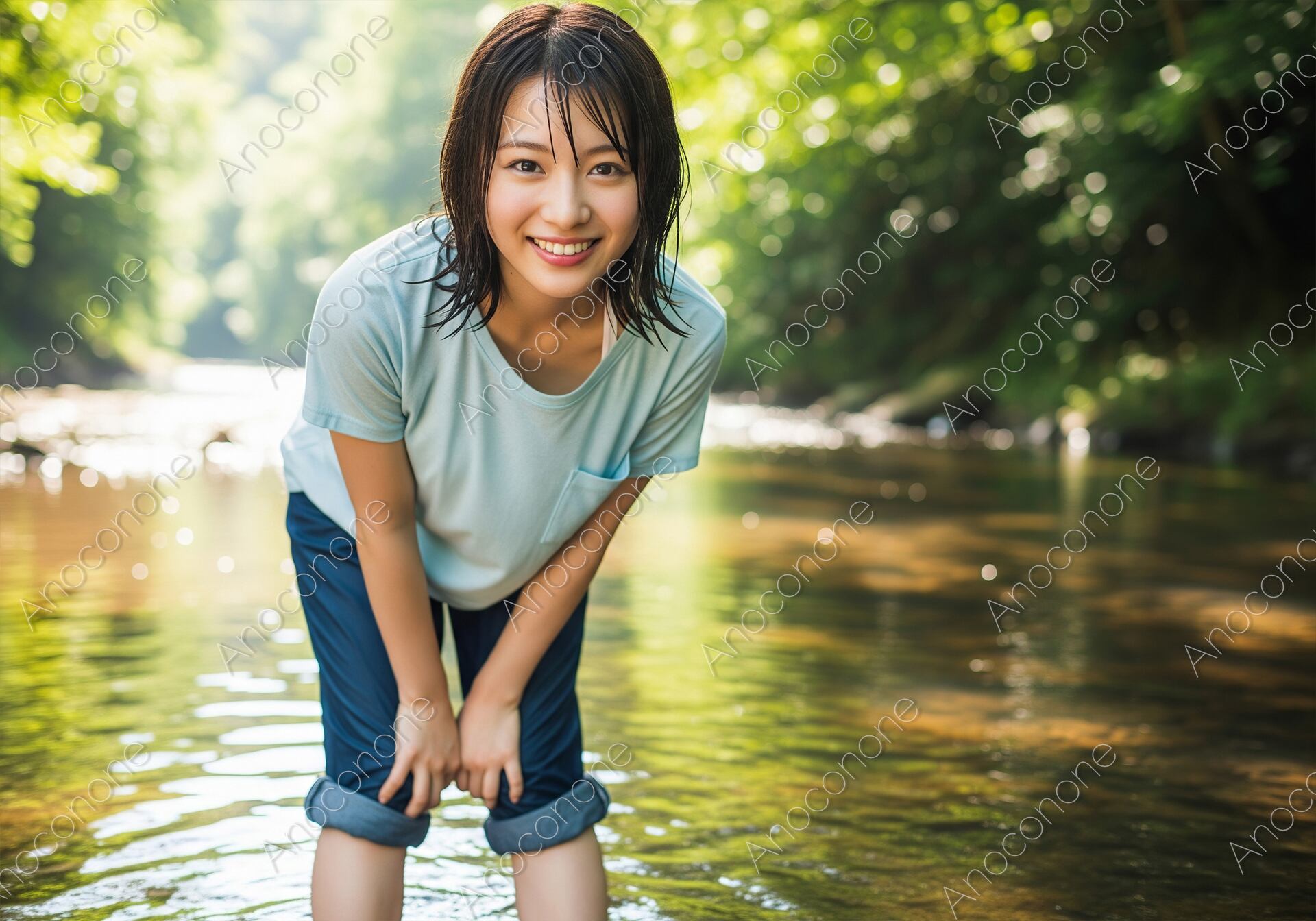 画像素材:豊かな緑に囲まれた美しい渓流で、川遊びを楽しむ女性のポートレートです。水しぶきを浴びて少し濡れた髪と、屈託のない弾けるような笑顔が、夏の自然の中で過ごす純粋な喜びを表現しています。背景には木漏れ日に輝く森と、透き通った川の流れが広がり、清涼感あふれるアウトドアシーンを演出しています。彼女の健康的で瑞々しい素肌の質感が、明るい自然光の中でより一層際立ち、見る人に爽やかな癒やしを与えます。川キャンプやハイキングなどのレジャー特集、夏のアウトドアファッションのプロモーション、観光地のPRポスター、あるいは「リフレッシュ」や「夏休み」をテーマにした広告・ブログなど、アクティブで清々しいイメージを伝えたいデザインに最適です。