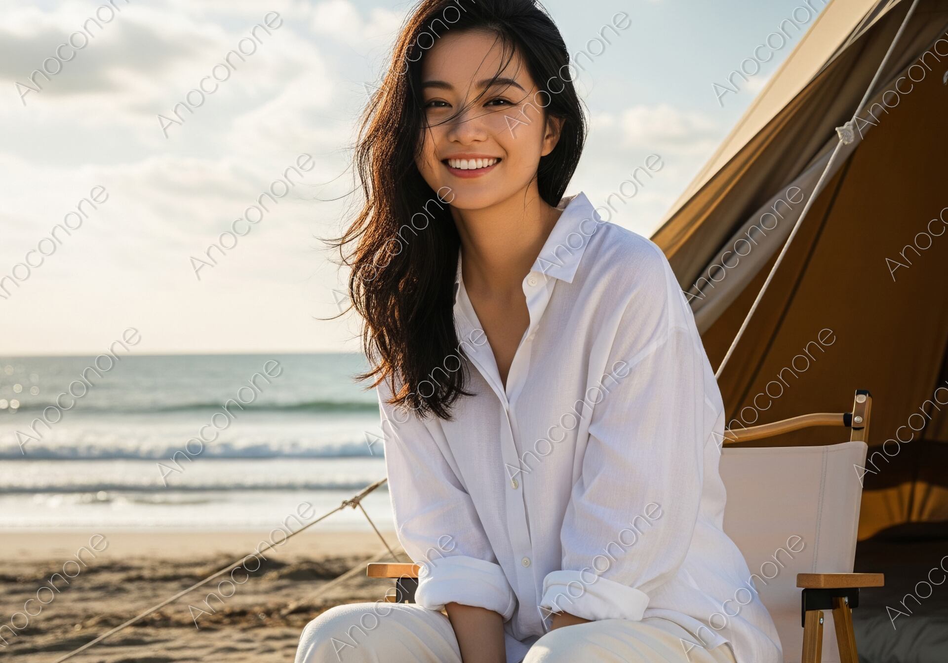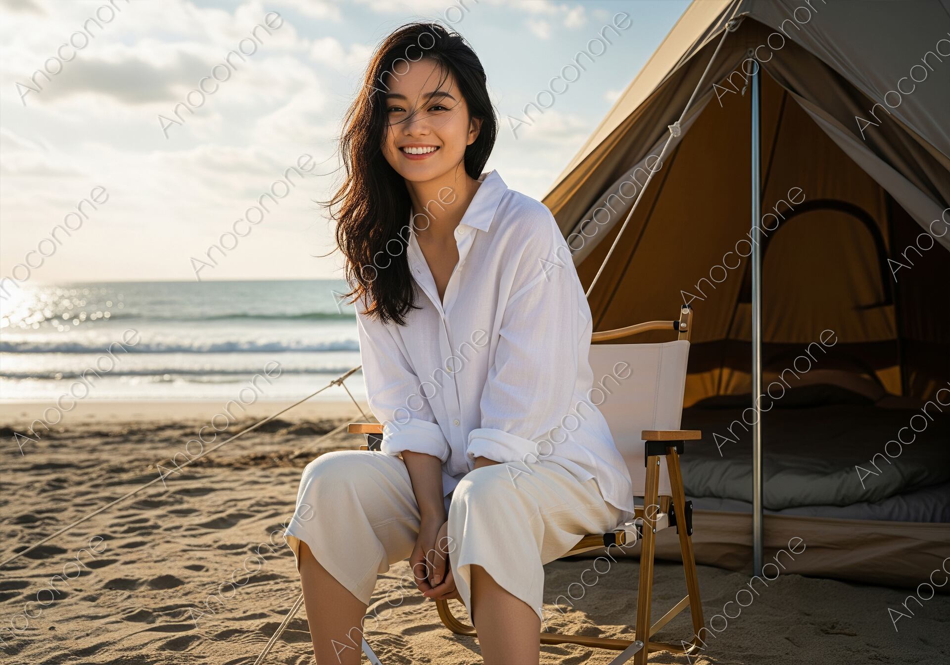 画像素材:明るい日差しが降り注ぐ海岸沿いのキャンプ場で、心地よい潮風を感じながらリラックスする女性を正面から捉えた一枚です。女性は清潔感のある白いオーバーサイズのシャツと、同系色のゆったりとしたボトムスを着用し、アウトドアチェアに深く腰掛けています。背後にはベージュカラーの大型テントが設置されており、すぐ目の前には穏やかな波が打ち寄せる砂浜と水平線が広がっています。太陽の光を浴びて輝く海面と、青空に浮かぶ白い雲が開放的なロケーションを強調し、女性の自然体で晴れやかな表情を引き立てています。風になびく長い髪が、屋外ならではの臨場感を演出しており、自由で贅沢な休日を過ごしている様子が伝わります。全体的に明るくナチュラルな色調でまとめられており、清潔感と健康的な魅力に溢れた構成となっています。ビーチキャンプや夏のレジャーをテーマにした広告、ライフスタイル雑誌の素材に最適です。