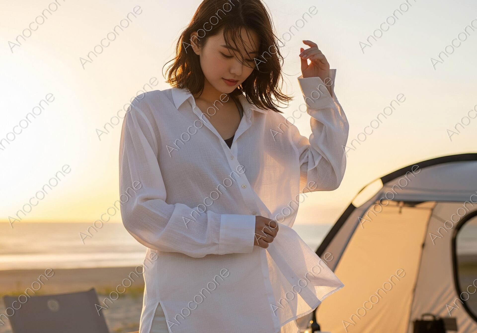 画像素材:夕暮れ時の美しいビーチに設営されたキャンプサイトで、身支度を整える女性の姿を捉えた静謐な写真です。女性は透け感のある白い長袖シャツにベージュのショートパンツを合わせた、涼しげで清潔感のある装いをしています。沈みゆく太陽の光が水平線から優しく差し込み、彼女の輪郭をオレンジ色に縁取るとともに、風に揺れる髪が屋外の心地よい空気感を強調しています。傍らにはコンパクトなポップアップテントやローチェア、小さなテーブルが配置され、ミニマルで洗練されたソロキャンプの様子が伺えます。砂浜の柔らかな質感と、逆光によって生まれるコントラストが、一日の終わりを告げる穏やかな時間を美しく演出しています。波音だけが聞こえてくるような静かなロケーションは、日常を忘れてリフレッシュしたい大人の休日に重応します。海辺のレジャーやキャンプ用品の紹介、自由なライフスタイルを提案する広告素材に最適です。