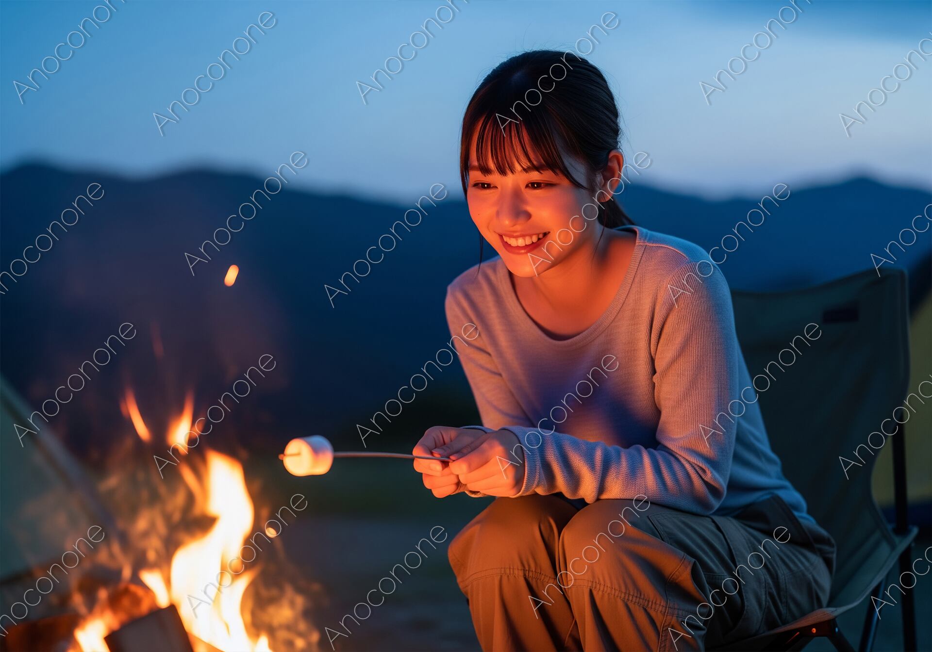 画像素材:日が暮れた後の静かなキャンプ場で、焚き火の炎でマシュマロを焼きながらゆったりと過ごす女性の姿を捉えた写真です。女性は落ち着いたブルーの長袖トップスに、機能的なベージュのカーゴパンツを合わせ、アウトドアチェアに腰掛けています。手元には串に刺したマシュマロを持ち、焚き火の熱でじっくりと焼き加減を確かめている様子で、その表情には自然な微笑みが浮かんでいます。燃え上がるオレンジ色の炎が暗闇の中で彼女の顔や衣服を暖かく照らし出し、夜の山特有の冷涼な空気感と焚き火の温もりが対比的に表現されています。背後には薄暗い山の稜線が広がり、日常から離れた特別な時間の流れを感じさせます。火の粉が小さく舞う臨場感のある描写が、キャンプの醍醐味である癒やしのひとときを強調しています。友人や家族とのレジャー、あるいは自分へのご褒美としてのソロキャンプを想起させる一枚です。アウトドア関連のプロモーションや、冬から春にかけてのレジャー特集に最適な素材です。