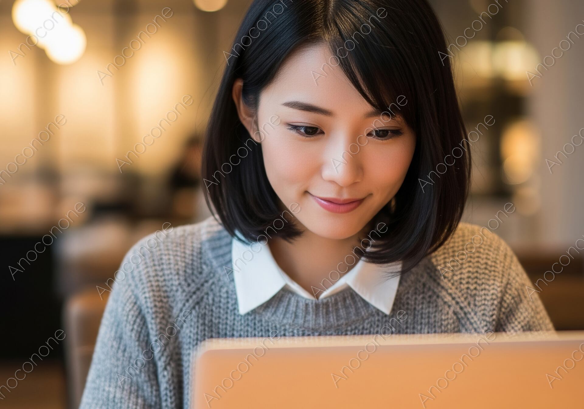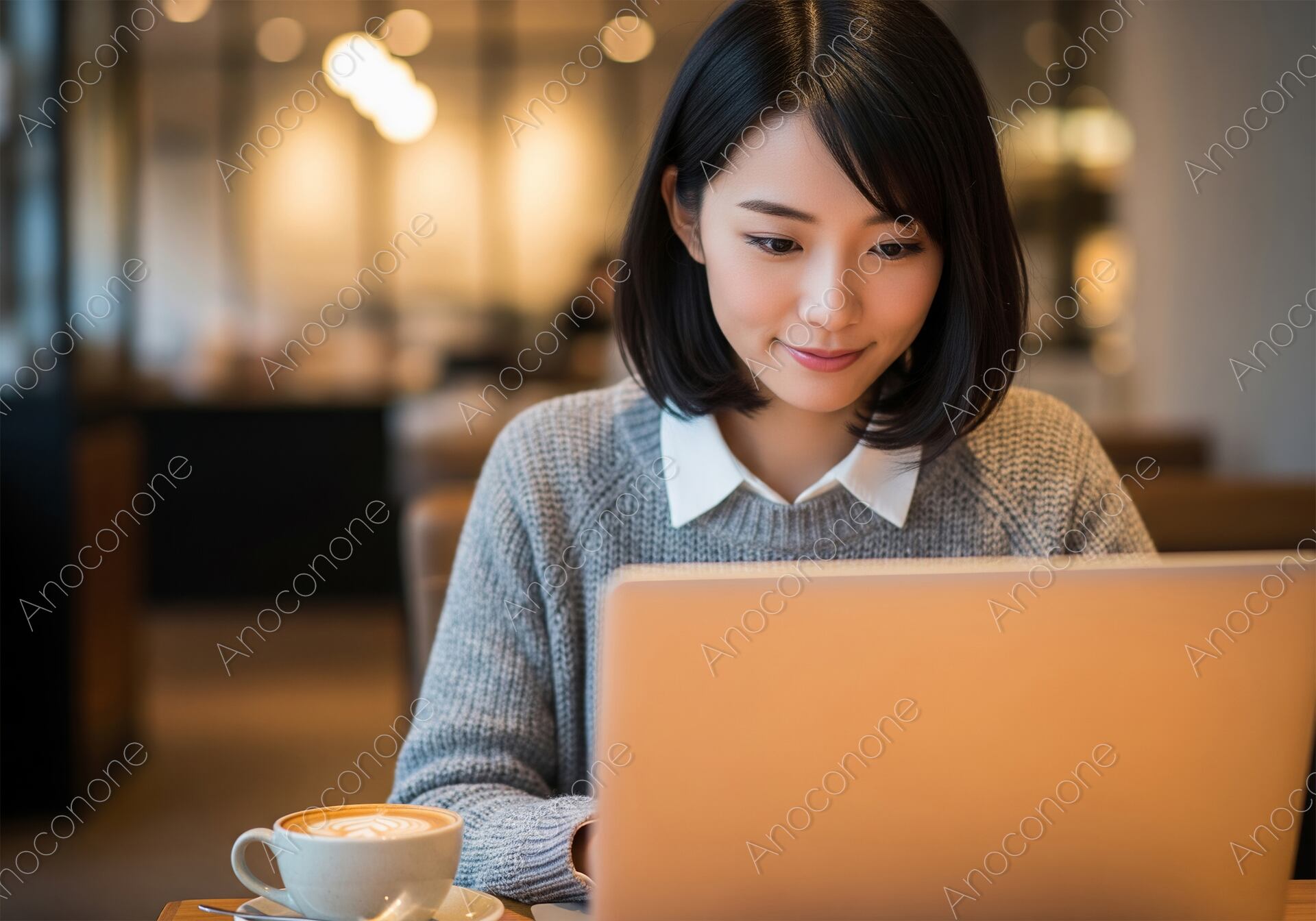画像素材:温かみのある照明に包まれたお洒落なカフェの店内で、ノートパソコンに向かい集中して作業に取り組む女性の姿を捉えた一枚です。女性は襟付きの白いシャツにグレーのニットを重ねた、清潔感のあるカジュアルな装いをしています。整えられたボブヘアと穏やかな表情が、知的な印象を周囲に与えます。手元には、丁寧に淹れられたラテアートが施されたコーヒーカップが置かれており、仕事の合間の心地よいリズムを感じさせます。背景のカフェは程よくぼかされており、店内の照明が丸い光の粒となって奥行きを演出しつつ、彼女の存在感を際立たせています。静かな集中力とリラックスした空気感が共存しており、場所を選ばない新しい働き方を体現するような構成です。都会的なライフスタイルや、ワークライフバランスを重視する現代的なシーンを美しく表現しています。リモートワークやカフェ利用の紹介、ビジネス向けコラムの素材に最適です。