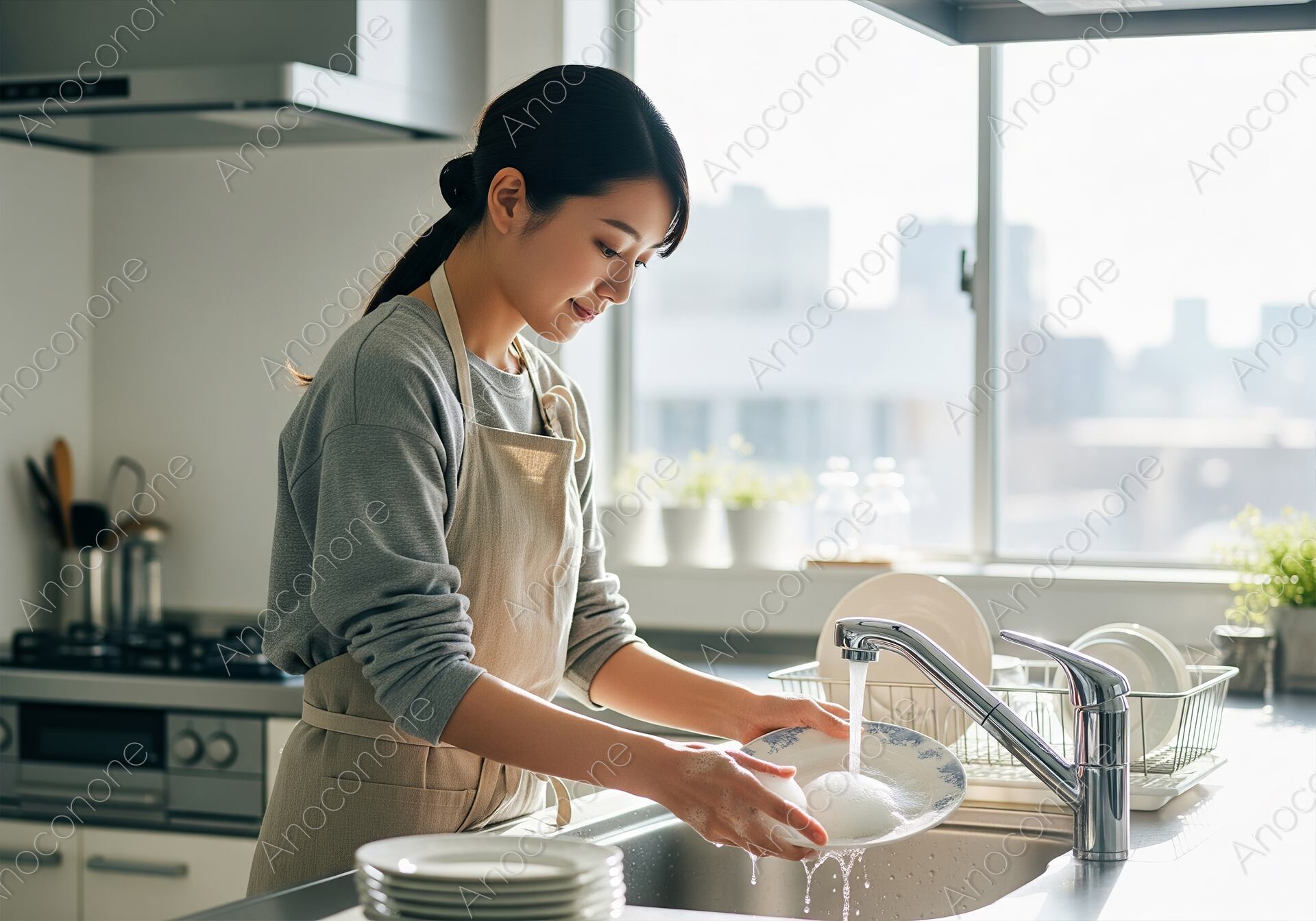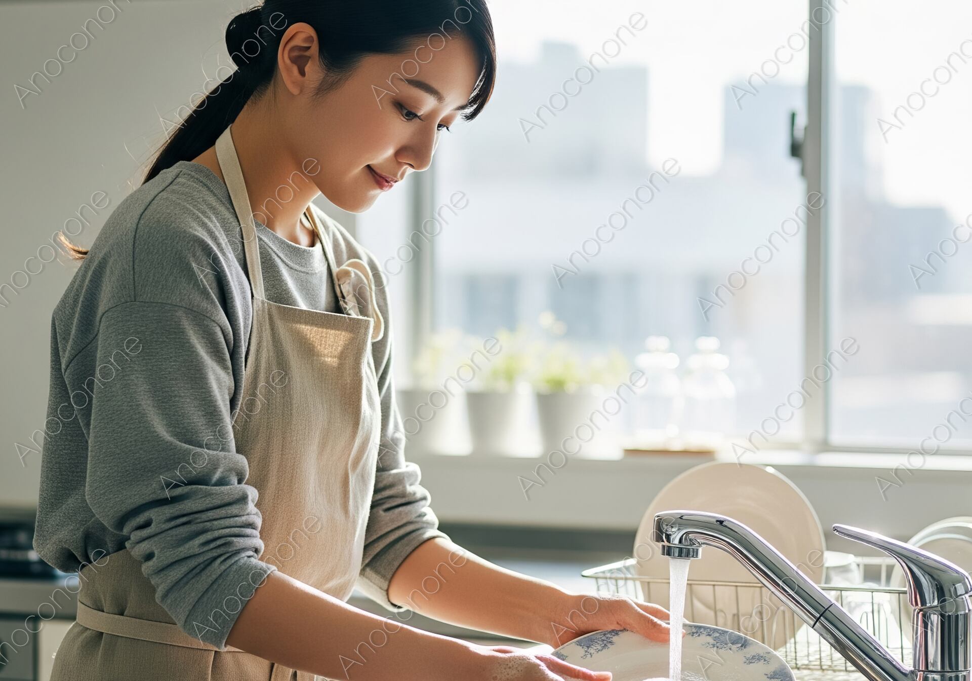 画像素材:明るく開放的なキッチンで、窓からの自然光を浴びながら食器洗いに励む女性の姿を捉えた写真です。女性は落ち着いたグレーの長袖トップスに、ナチュラルなベージュのエプロンを身に着け、清潔感のある装いで家事をこなしています。蛇口から流れる水でお皿の泡を丁寧にゆすぐ手元や、穏やかな表情で作業に集中する横顔が、日々の暮らしを慈しむ丁寧なライフスタイルを感じさせます。背景のキッチンは整理整頓されており、窓の外には都会的な景色が広がり、室内の観葉植物が空間に瑞々しさを添えています。シンク周りは水しぶきが光を反射し、清潔で健康的な生活空間を演出しています。全体的にナチュラルで柔らかなトーンでまとめられており、見る人に安心感と清潔な印象を与える構成です。住宅メーカーの広告や、家事代行サービス、キッチン用品の販促など、ライフスタイルに関連する媒体に最適な素材です。