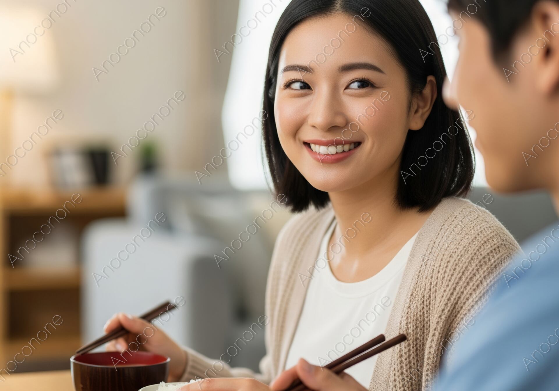 温かい光が差し込む自宅のダイニングで、ベージュのカーディガンと白いトップスを着用した女性が、向かいの夫と食卓を囲み、満面の笑顔で会話を交わしています。並べられた料理と、楽しそうな二人の表情が、夫婦の絆と心地よい団らんのひとときを表現しています。家族、夫婦、食事、自宅、ライフスタイルといったテーマの広告やウェブコンテンツに最適な一枚です。