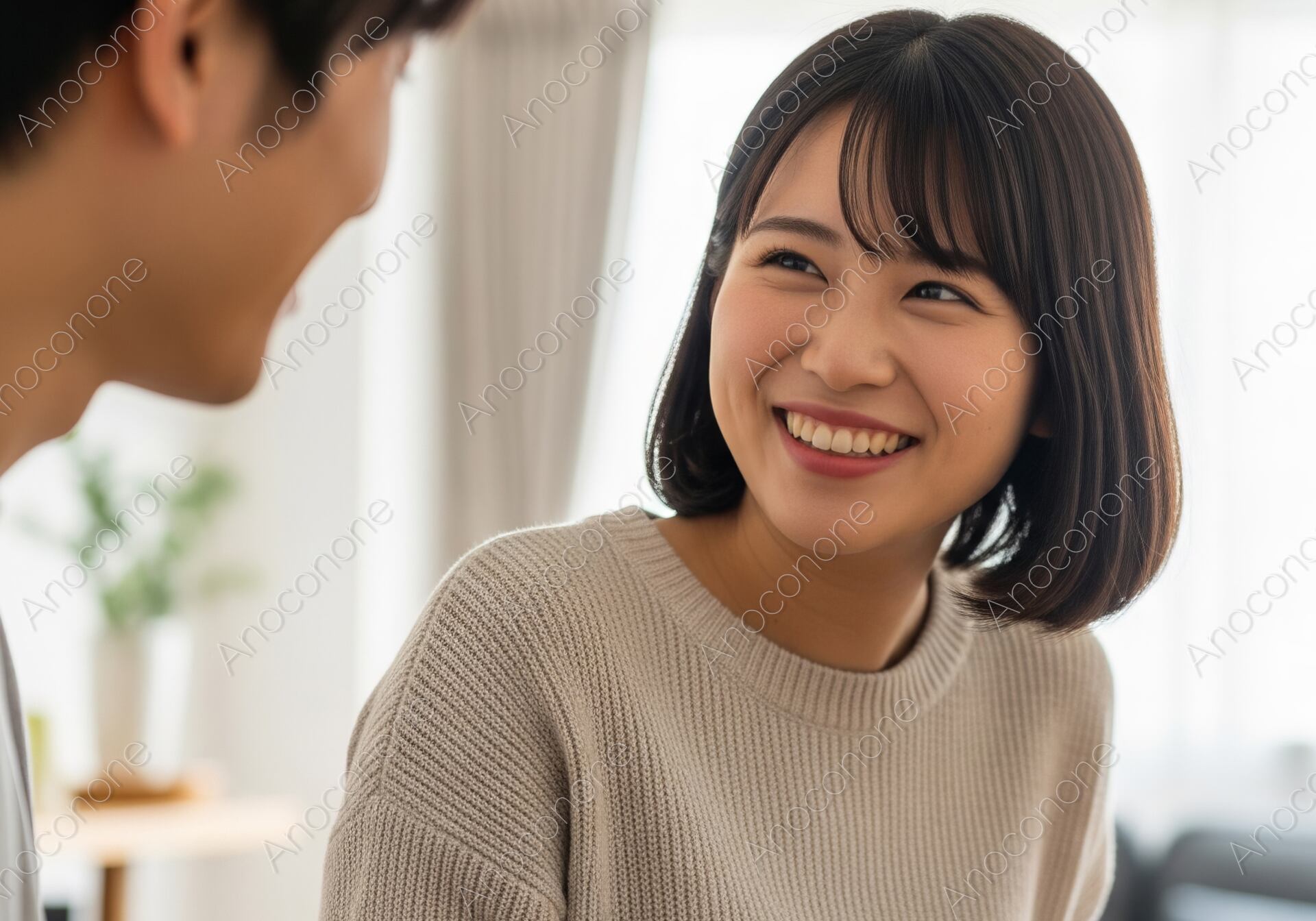 温かい光が差し込む自宅のダイニングで、ベージュのニットトップスを着用した女性が、向かいの夫と食卓を囲み、満面の笑顔で会話を交わしています。並べられた料理と、楽しそうな二人の表情が、夫婦の絆と心地よい団らんのひとときを表現しています。家族、夫婦、食事、自宅、ライフスタイルといったテーマの広告やウェブコンテンツに最適な一枚です。