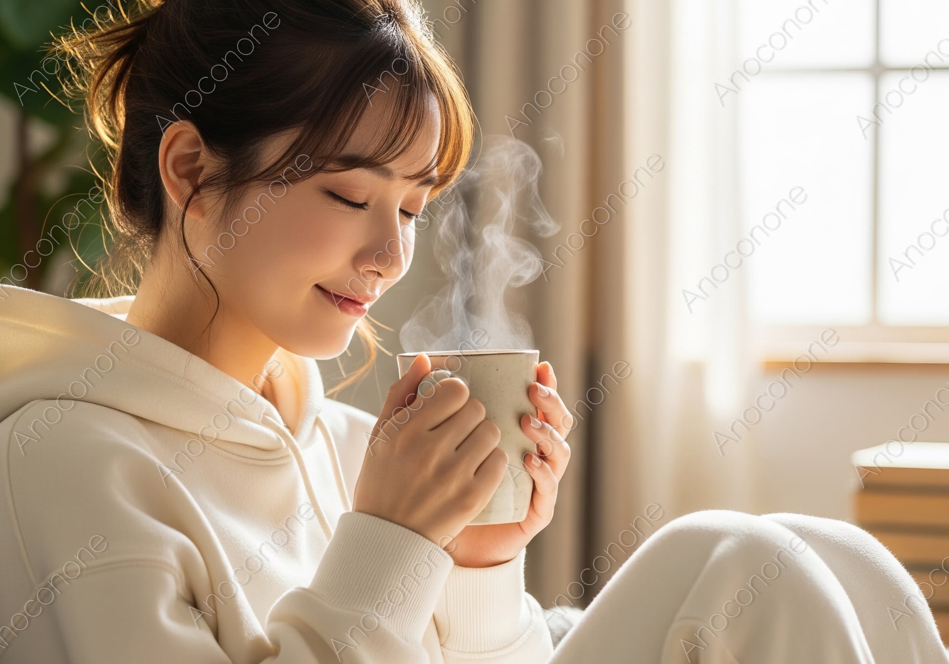 窓から柔らかな光が差し込む自宅のリビングで、クリーム色のパーカーとパンツを着用した女性が、温かいコーヒーの入ったマグカップを両手で持ち、目を閉じて穏やかに微笑んでいます。立ち上る湯気と、満たされた表情が、心地よい休息と心安らぐ時間を表現しています。コーヒー、自宅、リラックス、ライフスタイルといったテーマの広告やウェブコンテンツに最適な一枚です。