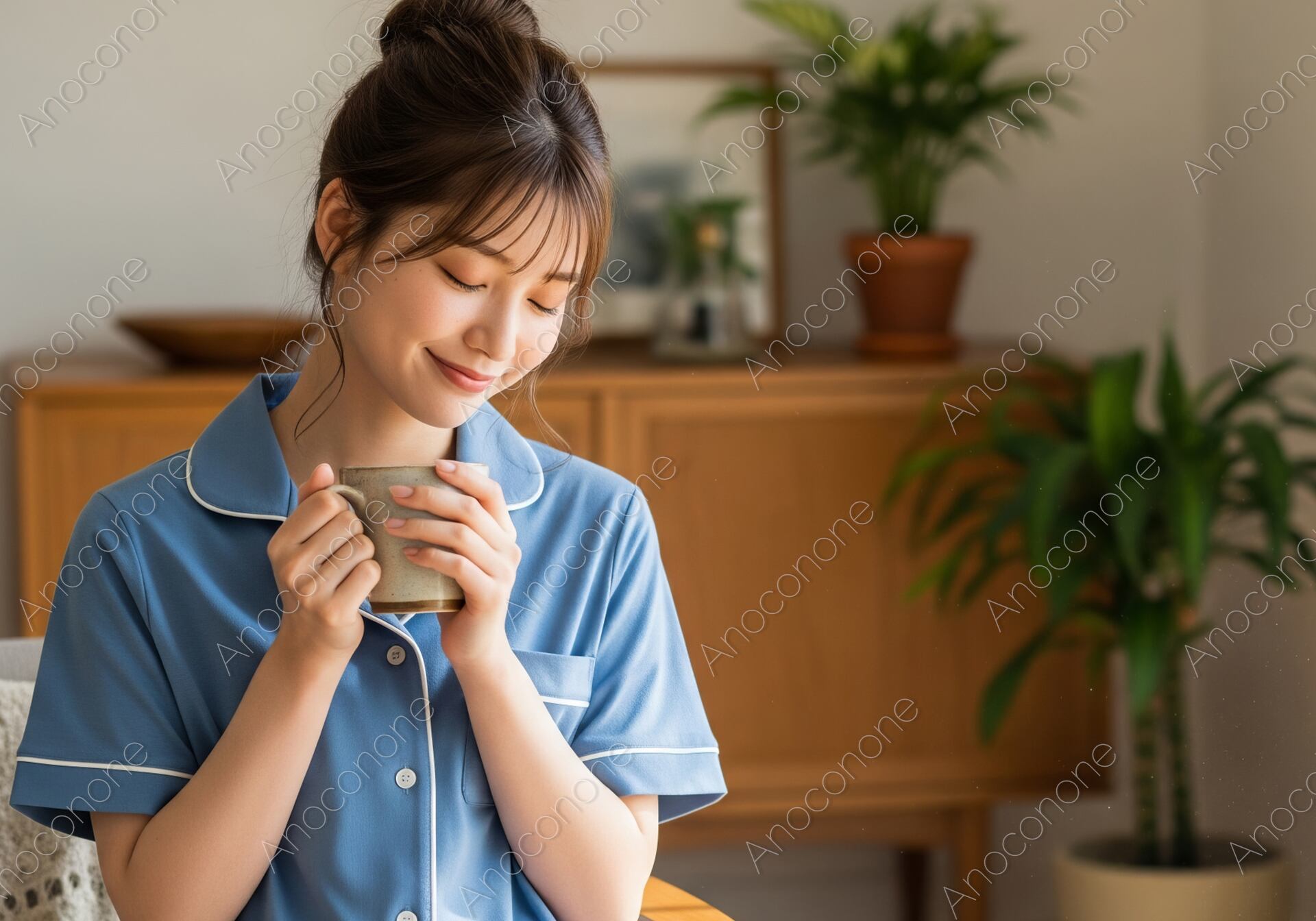 画像素材:明るい陽光が差し込むリビングで、爽やかなブルーのパジャマを身にまとった人が、マグカップを手に持ち穏やかな表情を浮かべています。背景には、木製のキャビネットや青々と茂る観葉植物がバランスよく配置されており、ナチュラルで清潔感のあるインテリアが特徴です。お団子ヘアにまとめた髪型と、ふんわりとした室内灯の光が、休日や朝のゆったりとした時間の流れを感じさせます。床に落ちる影や窓辺の明るさが、空間の奥行きと心地よい空気感を演出しています。派手さを抑えた色使いにより、日常の何気ない幸せやリラックスした雰囲気が自然に伝わります。丁寧な暮らしやルームウェアの紹介に適した素材です。