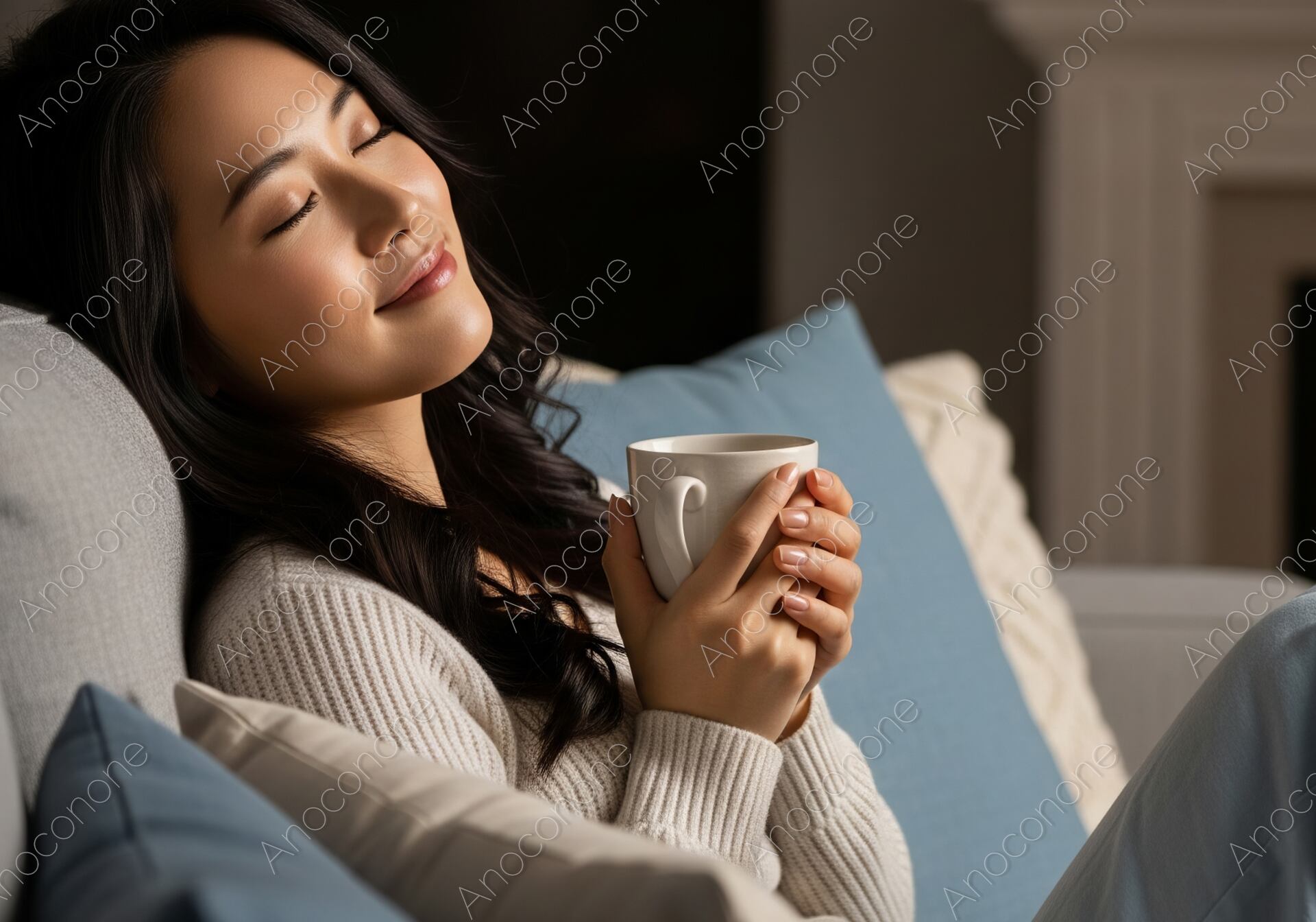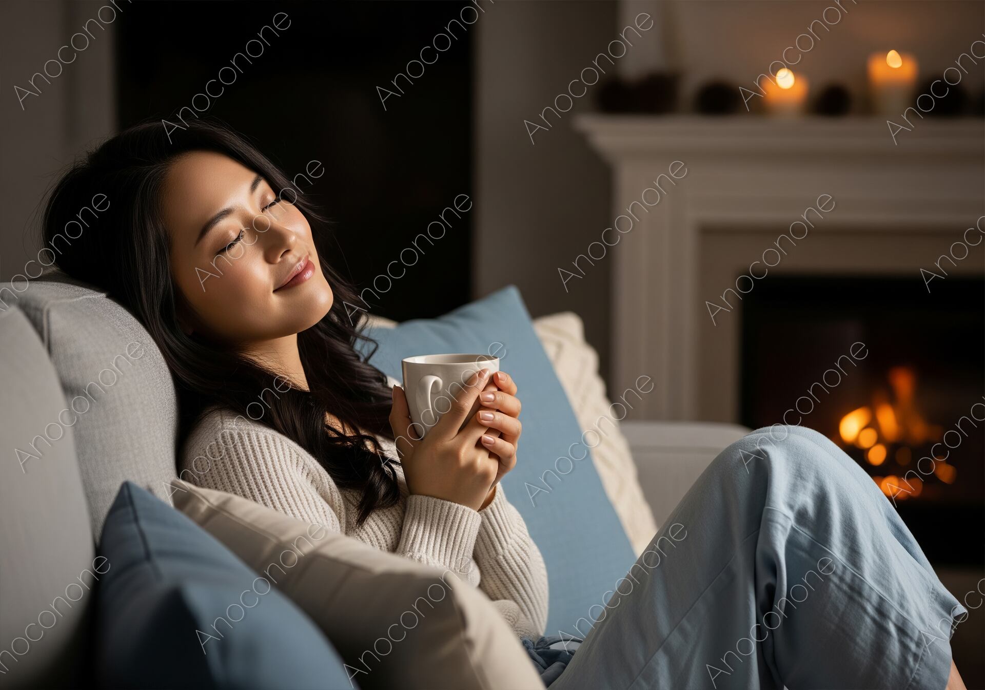 暖炉の優しい炎が灯るリビングで、ベージュのニットセーターと水色のパンツを着用した女性が、ソファで深くくつろぎながら温かいコーヒーを飲んでいます。目を閉じ、口元に笑みを浮かべた表情が、心地よい安らぎと心満たされる時間を表現しています。コーヒー、自宅、リラックス、ライフスタイル、冬といったテーマの広告やウェブコンテンツに最適な一枚です。