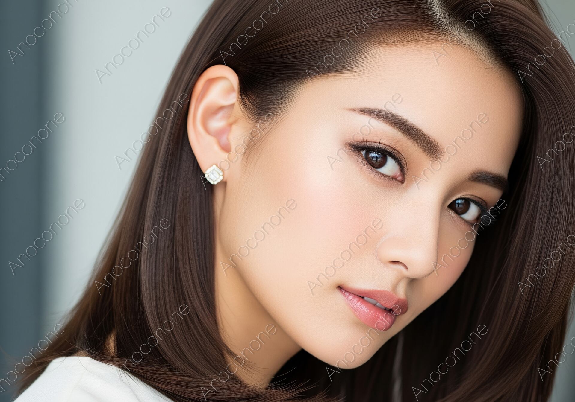 柔らかな光が差し込む中で、白いトップスを着用した女性が、艶やかなミディアムヘアでカメラをまっすぐ見つめています。知的な雰囲気と、見る人を惹きつけるような強い眼差しが、洗練された大人の女性の魅力を引き立てています。ヘアサロン、美容、ライフスタイル、ファッションといったテーマの広告やウェブコンテンツに最適な一枚です。