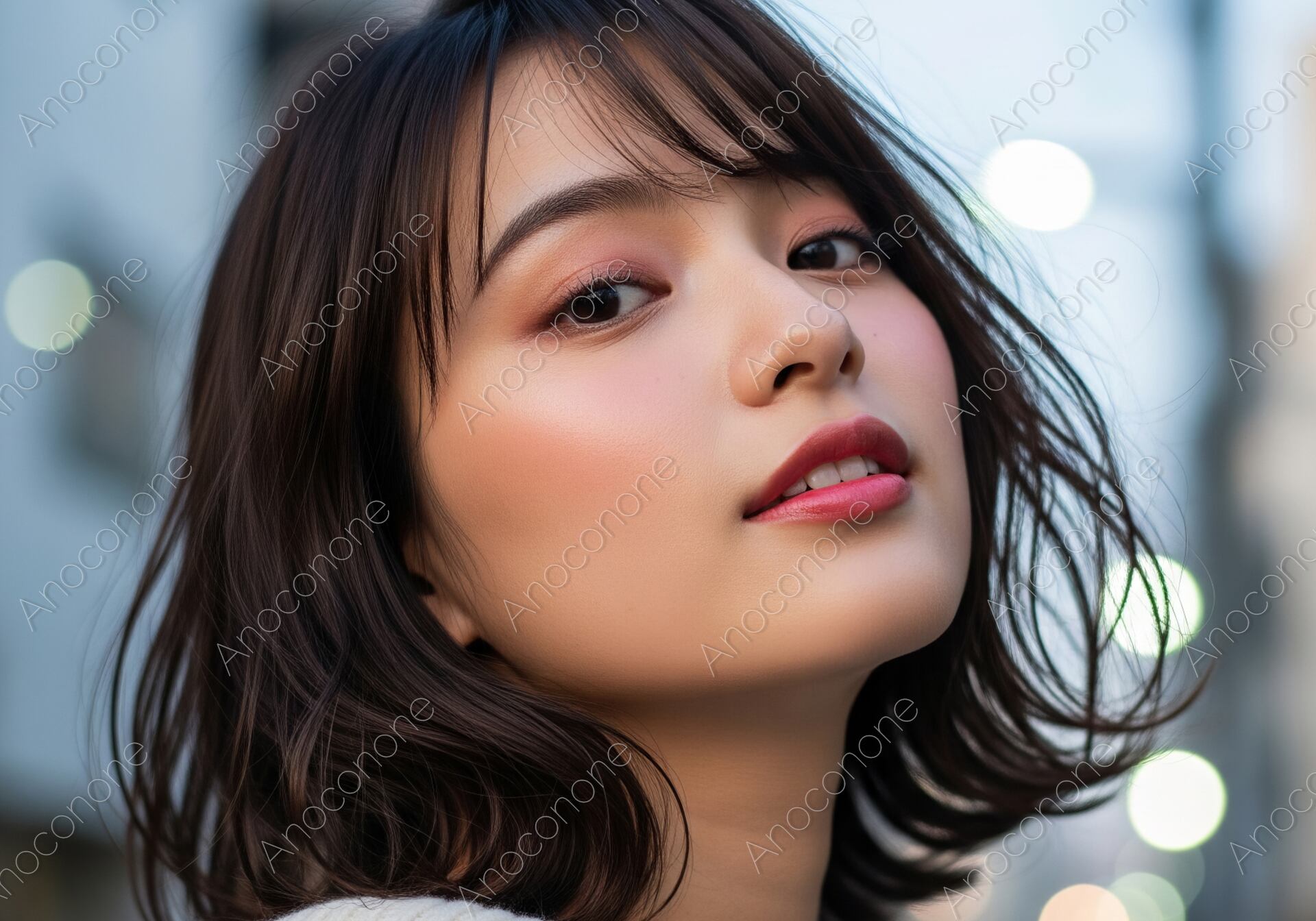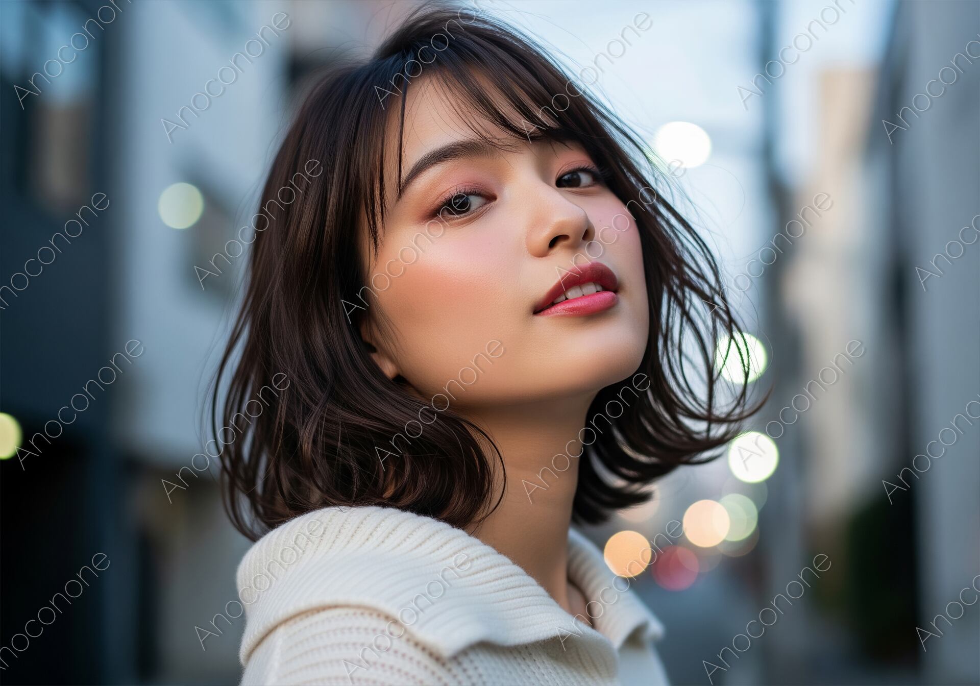 光がぼやけて輝く都会の背景で、明るい色のニットを着用した女性が、魅惑的な表情でカメラを見つめています。洗練されたメイクと、ふんわりとしたミディアムヘアが、彼女の持つ都会的な美しさと、自信あふれる雰囲気を一層引き立てています。ファッション、美容、ナイトライフ、ポートレートといったテーマの広告やウェブコンテンツに最適な一枚です。