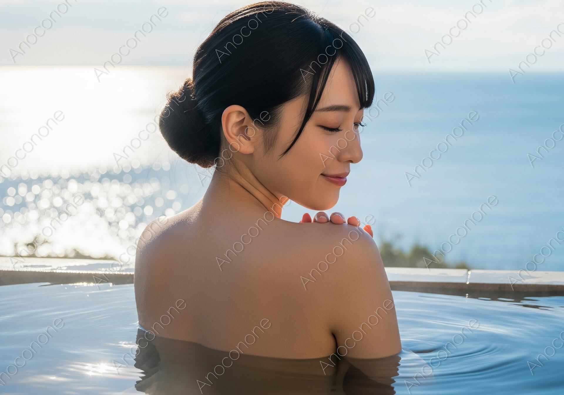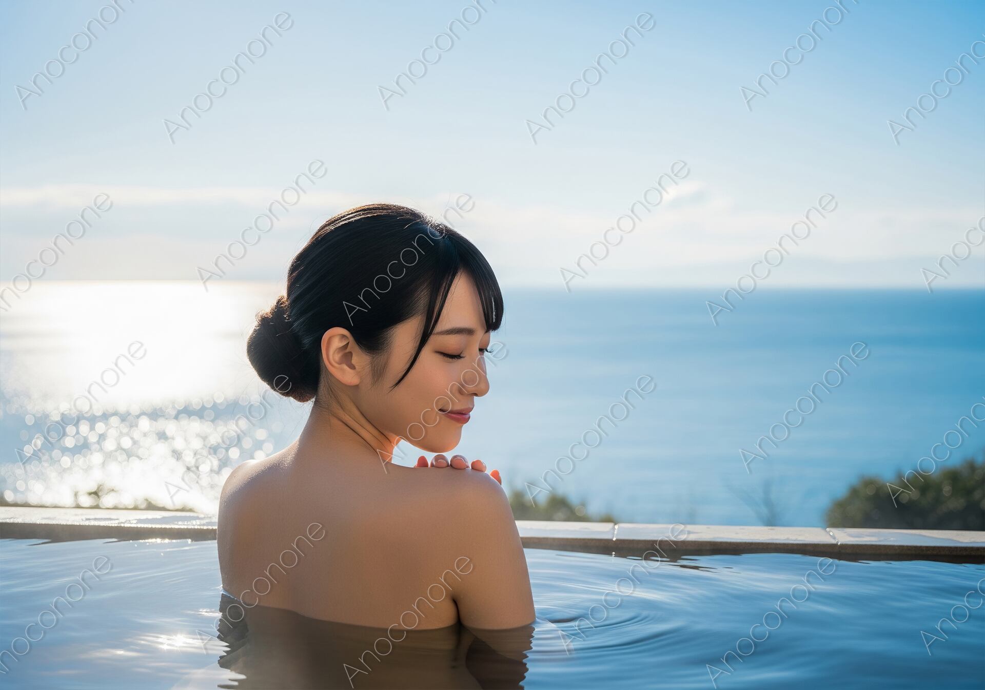 画像素材:水平線まで見渡せる広大な海を背景に、静かな露天風呂で湯船に浸かっている人の後ろ姿を捉えた一枚です。水面に反射する太陽の光がキラキラと輝き、開放感あふれる贅沢なひとときを演出しています。まとめられた黒髪とうなじ、そして肩のラインが自然光に照らされ、健康的な肌の質感が美しく表現されています。目を閉じて穏やかな微笑みを浮かべる横顔からは、波の音を聞きながら心身ともにリフレッシュしている様子が伝わります。空と海の境界線が溶け合うような青のグラデーションが素晴らしく、清潔感と高級感を併せ持った構図です。余計なものを削ぎ落としたシンプルなビジュアルにより、癒やしの空間そのものの魅力がストレートに引き出されています。温泉旅行やスパ、リゾート施設の広報用素材として最適です。