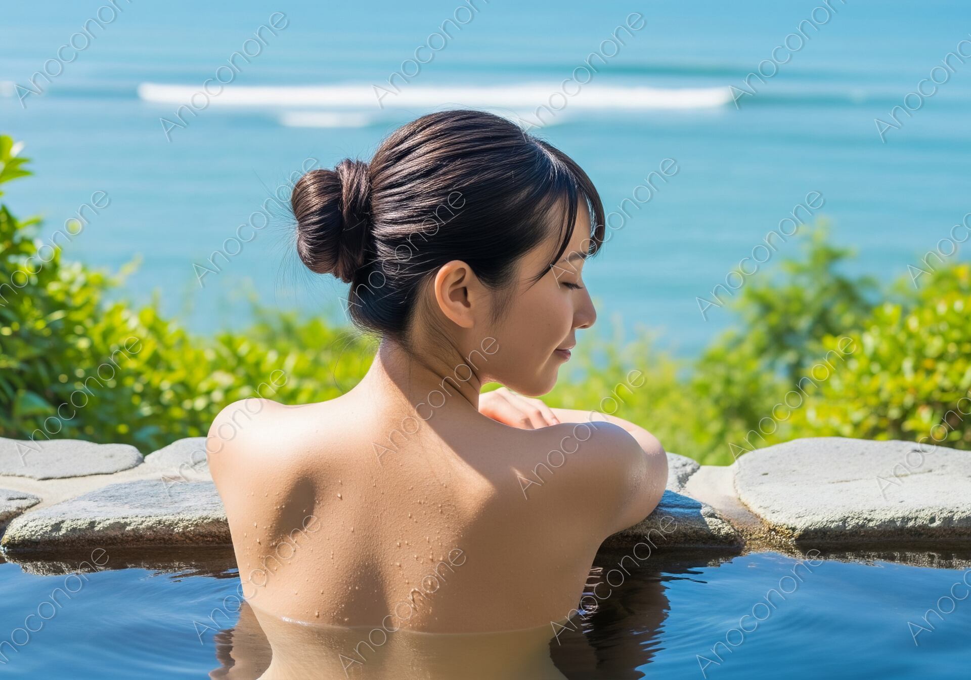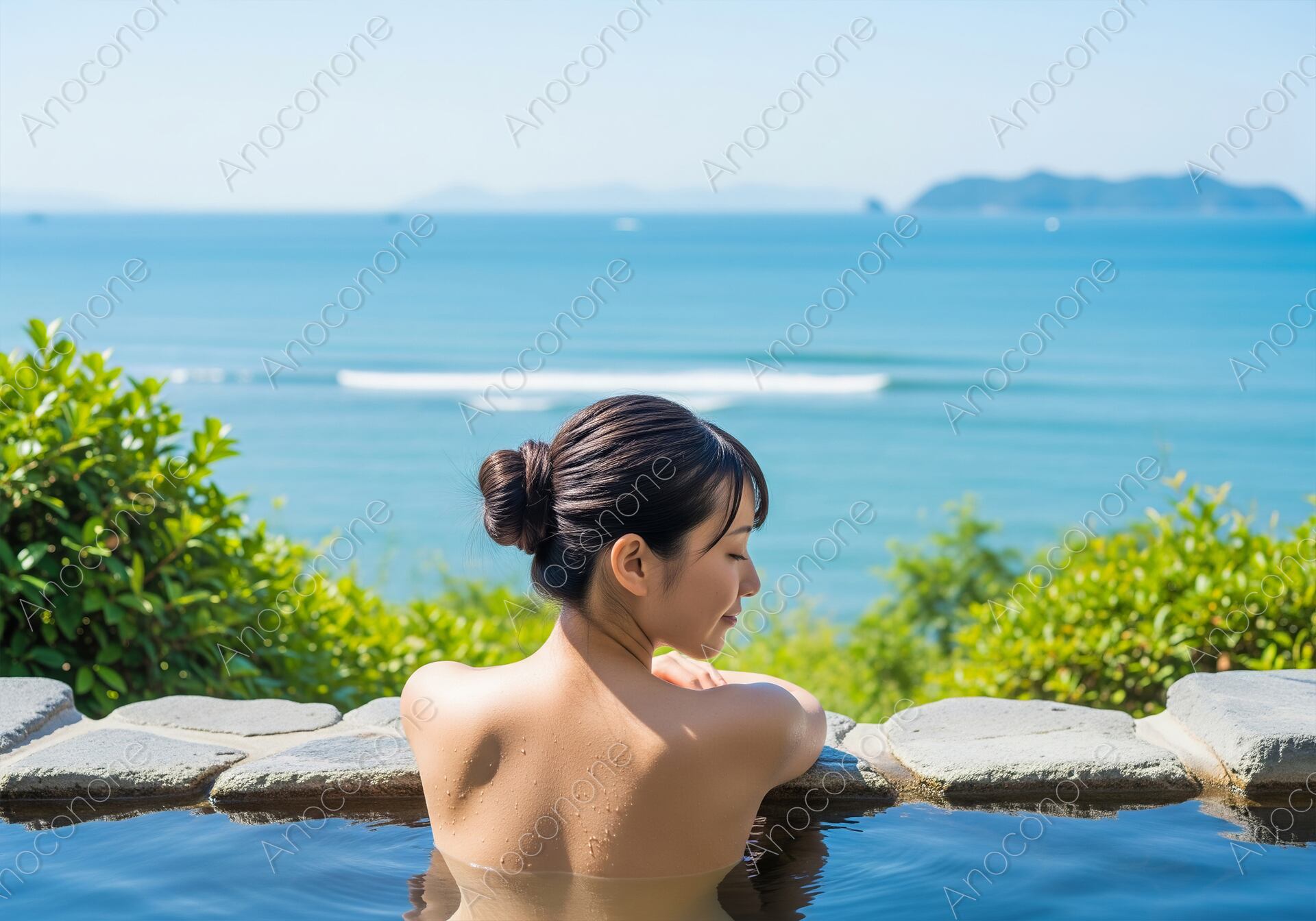 画像素材:目の前に広がる真っ青な海と水平線を一望できる、開放感あふれる露天風呂でくつろぐ人の後ろ姿を捉えた一枚です。澄み渡る空と穏やかな波が打ち寄せる海岸線が美しく、自然と一体になったような贅沢な気分を味わえます。湯船の縁に腕を預け、静かに景色を見つめる横顔からは、日々の忙しさを忘れて心身ともにリフレッシュしている様子が伝わります。太陽の光を浴びてキラキラと輝く水面や、濡れた肌に付いた水滴の質感が、温泉の心地よさをリアルに表現しています。周囲には鮮やかな緑が配置され、青い海とのコントラストが清々しい空気感を演出しています。過度な加工を抑えた自然なライティングにより、清潔感と上品さが感じられる構成です。リゾート地での至福のひとときを想起させる、旅情あふれる仕上がりになっています。旅行サイトのメインビジュアルや、温泉宿の宣伝に最適な素材です。