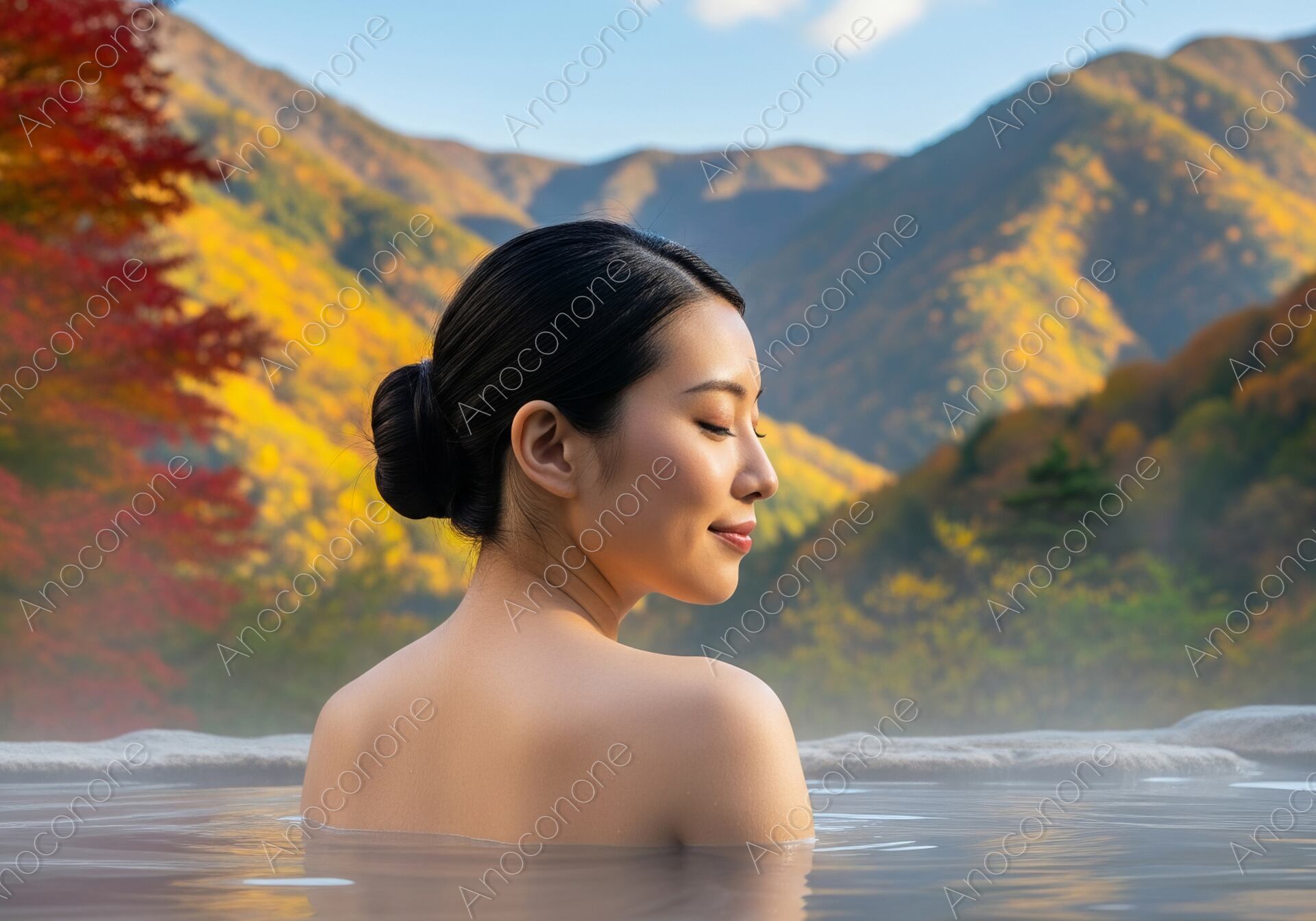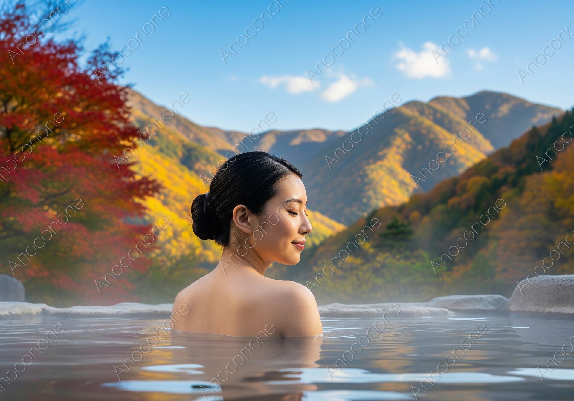 画像素材:赤や黄色に染まった秋の山並みを背景に、開放的な露天風呂で静かに湯に浸かっている人の後ろ姿を捉えています。澄み渡る青空と色鮮やかな紅葉が水面に映り込み、自然の豊かさを全身で感じられる贅沢な空間が広がっています。まとめられた黒髪とうなじのラインが美しく、目を閉じて穏やかな微笑みを浮かべる横顔からは、心身ともに解き放たれた至福のひとときが伝わってきます。湯船から立ち上る柔らかな湯気が周囲の景色を優しく包み込み、秋の涼やかな空気と温泉の温もりのコントラストを表現しています。全体的に落ち着いた自然な色調で構成されており、見る人に深い安らぎと旅への憧れを抱かせる一枚です。清潔感のある描写は、幅広い媒体のデザインに馴染みます。秋の行楽シーズンを彩る観光PRや、温泉宿の宣伝素材として最適です。