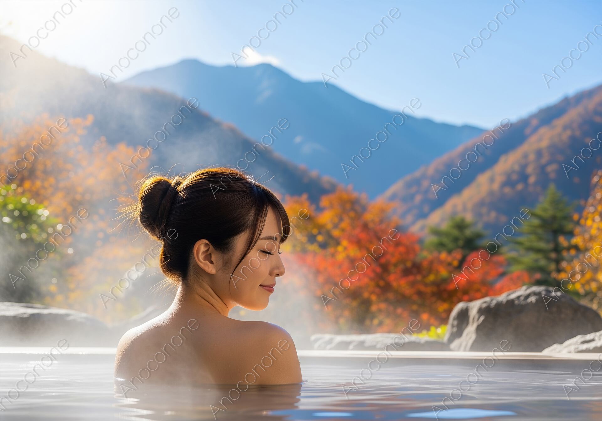 画像素材:清々しい秋の太陽が降り注ぐ中、色鮮やかに染まった山々を見渡せる露天風呂で、静かに湯に浸かっている人の後ろ姿を捉えた一枚です。澄んだ空気の中に立ち上る白い湯気が、温泉の温もりと旅の情緒を豊かに表現しています。きれいにまとめられた髪のラインと、湯船から覗く柔らかな肩の曲線が、自然光を浴びて健康的な美しさを放っています。目を閉じて穏やかな微笑みを浮かべる横顔からは、心身ともに解き放たれ、至福のリラックスタイムを過ごしている様子が伝わります。背景には連なる山々の稜線が美しく描かれ、手前の紅葉とのコントラストが秋の深まりを感じさせる構成です。全体的に明るく開放的なトーンで整えられており、見る人に爽やかな安らぎを与えます。温泉旅行の魅力を伝えるパンフレットや、観光地のウェブサイトを彩るメインビジュアルに最適な素材です。